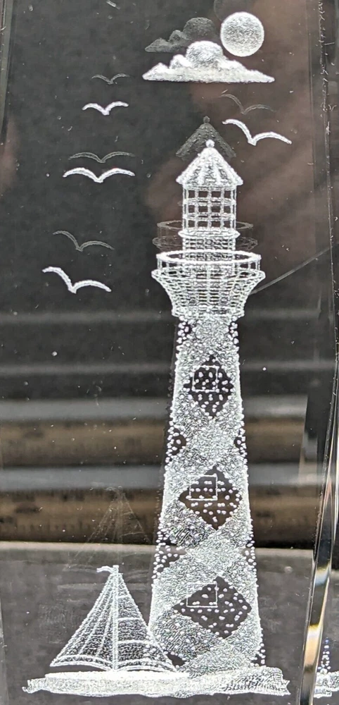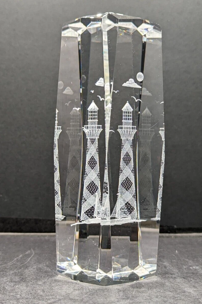 3D Laser Etched Prism Crystal Paperweight Lighthouse Sailboat Seabirds Clouds. No chips or cracks. The only issue are a few light scratches, barely noticeable. Please see the photos. This paperweight is heavy and about 6 inches tall and 2 inches in length and width. All of my items are carefully packed for shipping, no matter their value - $5 items are wrapped with the same care as a $200 item. My goal is to have your purchase arrive safely. Large, heavy and fragile items are harder to use combined shipping with but just ask if you would like to purchase more than one item and I am more than happy to do so if feasible. Measurements are approximate or as close as I can get. Also, the color you see many not be the exact color depending on your computer or phone settings. Unpaid items will result in the buyer being blocked from further purchases. Please remit payment right away so we can get your item shipped out quickly.
