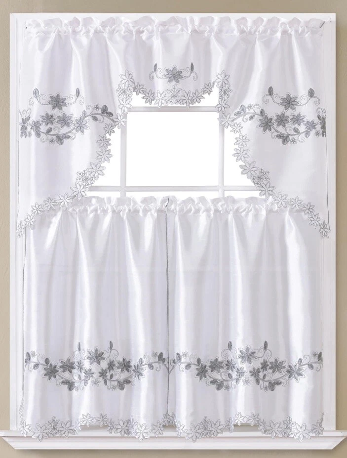 Add a touch of elegance to your kitchen or dining area with this 3PC SET WINDOW EMBROIDERY KITCHEN CURTAIN GREY (FLOWER). The set includes three pieces of faux silk curtains, each measuring 60" in width and 36" in length, and designed with a beautiful floral pattern in white and grey. The curtains are light filtering and unlined, providing privacy without compromising on natural light. The rod pocket curtain heading ensures easy installation and the wall mounted design is perfect for modern style décor. This set is suitable for home décor, kitchen, teens, adults, unisex baby & toddler, and kids. Casabellahomegoods guarantees high-quality products, and this set is no exception.