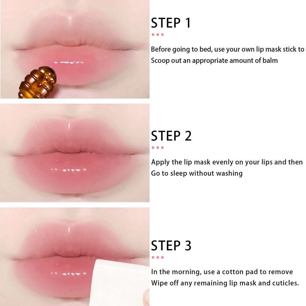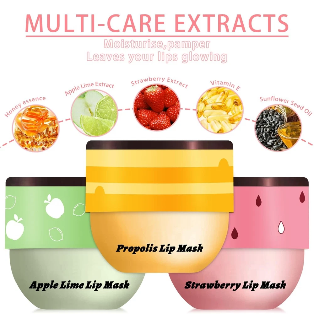 đăSweet Lip MaskăThe smooth texture is combined with the attractive strawberry/honey aroma to caress the lips delicately, take care of your lips all the time, fuller, softer and smoother. đăSafe IngredientsăRich in natural honey and strawberry extract, vitamin E and other essence formula, honey lip balm is rich in moisturizing factors, which is gentle, safe and easily soften the cutin, moisturize the lip skin, and give you health and beauty Lips. đăMultiple functionăGood moisturizing and nourishing effects, not only be used as the daily basic maintenance of the lips, dilute lip lines, but also can be used to moisturizing the lips before lip makeup, helping you to have a hydrated lip makeup. đăMethod of useăNourish in the daytime, apply a thin layer lip balmon the lips to easily exfoliate aging skin; Use at night to repair damaged and dry lips. Visible results in just 1-2 days. đăImprove lip colorăOur Sleeping lip mask can improve lip color. For people with dark lips, Sleeping lip mask can help lighten lip color. Especially after using the Sleeping lip mask, you can feel your lips become plump and moisturized. In addition, people with dull lips can use lip masks to rejuvenate their lips.