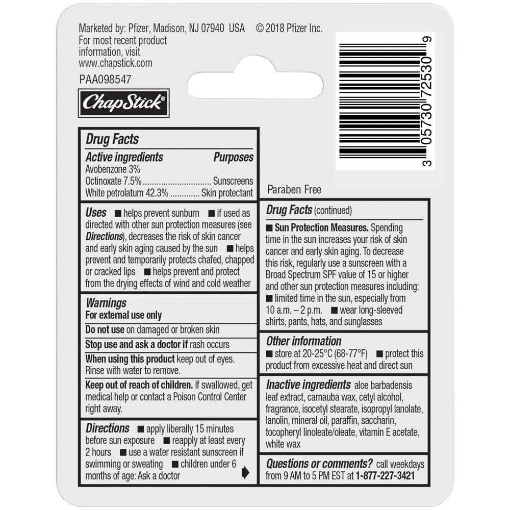 One pack of three 0.15-ounce ChapStick Moisturizer Original Lip Balm Tubes, SPF 15 and Skin Protectant ChapStick Original Moisturizer keeps your lips hydrated and protected from sun's rays for up to eight hours Unflavored Original ChapStick Moisturizer is familiar and comforting Each 0.15-ounce SPF stick is portable and easy to apply when you need it most Non-tinted and paraben free, this SPF 15 lip balm features moisturizing sun protection Stow this ChapStick Original lip balm in your pocket, purse or drawer for healthy looking lips