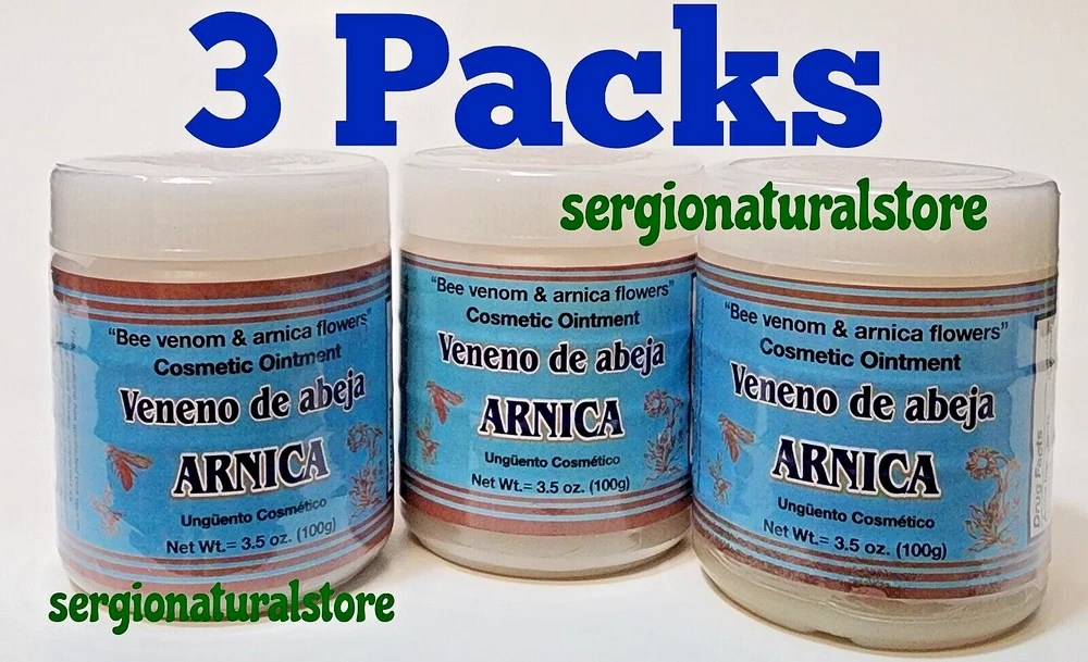 3 Packs Bee Venom & Arnica Ointment 3.5 oz. each Support for Sprains Dislocations Cramps Support Adults Apply generously and gently massage into painful area until the product disappears. Repeat no more than 3 to 4 times day. 100% Original Product Thank you for your support and preference, I invite you to see my other sales items. Buy with confidence !!You shipments is 100% Guaranteed!! 3 Packs Pomada Veneno de Abeja con Arnica 100 grs Soporte para Esguinces Soporte Dislocaciones Calambres Adultos Aplique generosamente y masajee suavemente en el área adolorida hasta que el producto desaparezca. Repita no más de 3 a 4 veces al día. P roducto 100% Original Muchas Gracias por su apoyo y preferencia, lo invito a mirar mis otros artículos de venta. Compre con confianza !!Su envío es 100% Garantizado!!