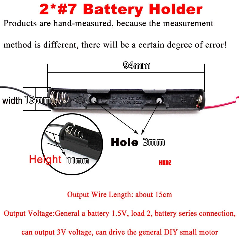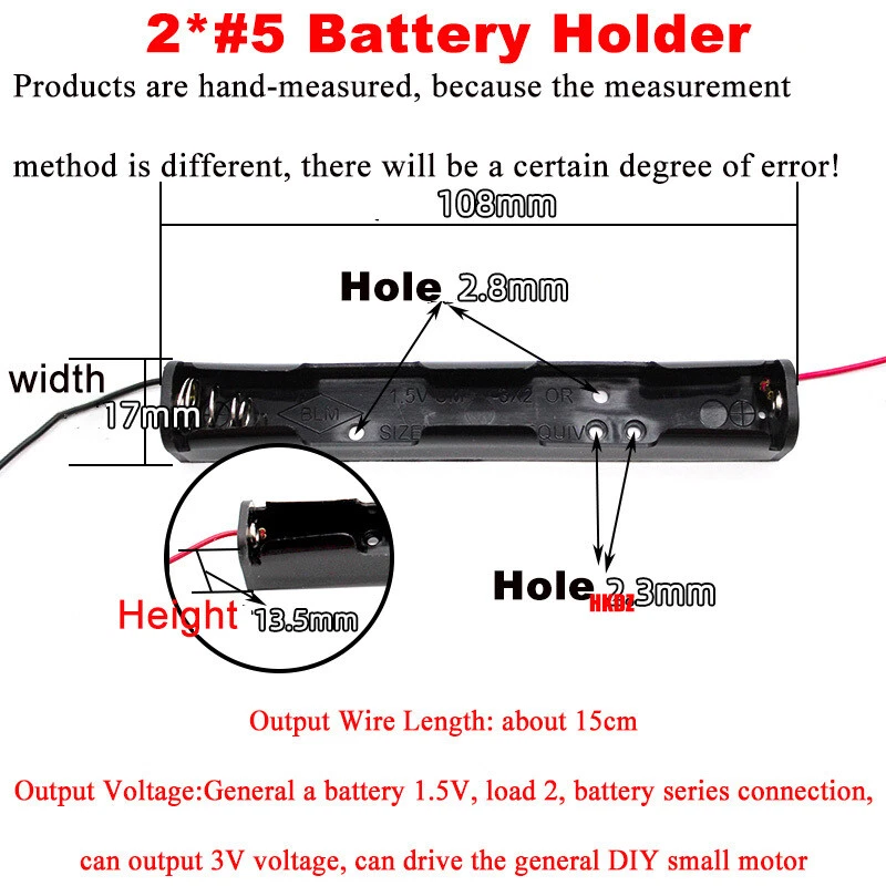 AA/AAA Open Battery Holders Storage Case Box 150mm Lead Wire 3V DIY Model Craft Product Information Specification ▪️ Product Name:AA/AAA Open Battery Holders ▪️ Colour: Black ▪️ Product Specification:2*#5 Battery Holder(AA): 108*17*13.5mm; 2*#7 Battery Holder (AAA): 94*13*11mm ▪️ Product Material: Plastic ▪️ The Wire Length: About 15cm ▪️ Fixed Hole Diameter: about 2.4 and 2.9mm, two kinds of ▪️ Output Voltage: General a battery 1.5V, loaded with 2, battery series connection, can output 3V voltage, can drive the general DIY small motor Features ▪️ Made of high quality plastic material, small size, light weight, simple structure, easy to operate and use, easy to carry, strong insulation, durable, long service life Application ▪️ This long battery box, can save space, in the installation of narrower space will play a larger role. With fixing holes, with red and black leads, for DIY science and technology small production. 🔴 Package Include: •According to your Choose 🔴 Delivery details: • We only accept your Ebay Address,Please Make sure it's right. • The items you ordered will be shipped out in 3 business day by Air Mail when your payment is clear. 🔴 Terms of sales: • If you are not satisfied with the item, please contact with us. • We will offer Full Refund to you when we receive your returned item. • Any problem, please feel free to contact with us. 🔴 About us: • If you are satisfied with the products,I expect you can leave us a positive feedback. • If you have any problem or be not satisfied with them,please feel free to contact us,we will reply you within 24 hours. 🔴 Contact us: • We care about our valued buyers, if you have any questions, our Customer Service staffs will be very glad to help you. We try our best to reply to your emails as soon as possible, however, due to high volume of daily incoming emails and time zone difference, we may not be able to reply your emails immediately. Please allow 24 business hours for us to response. 🔴 About item: • For the functional products in our shop, we make sure that the functions are the same as description, but the actual color and shape may looks a little different from pictures because of the technical improvement and manufacturing variance. Please be advised before you bid.