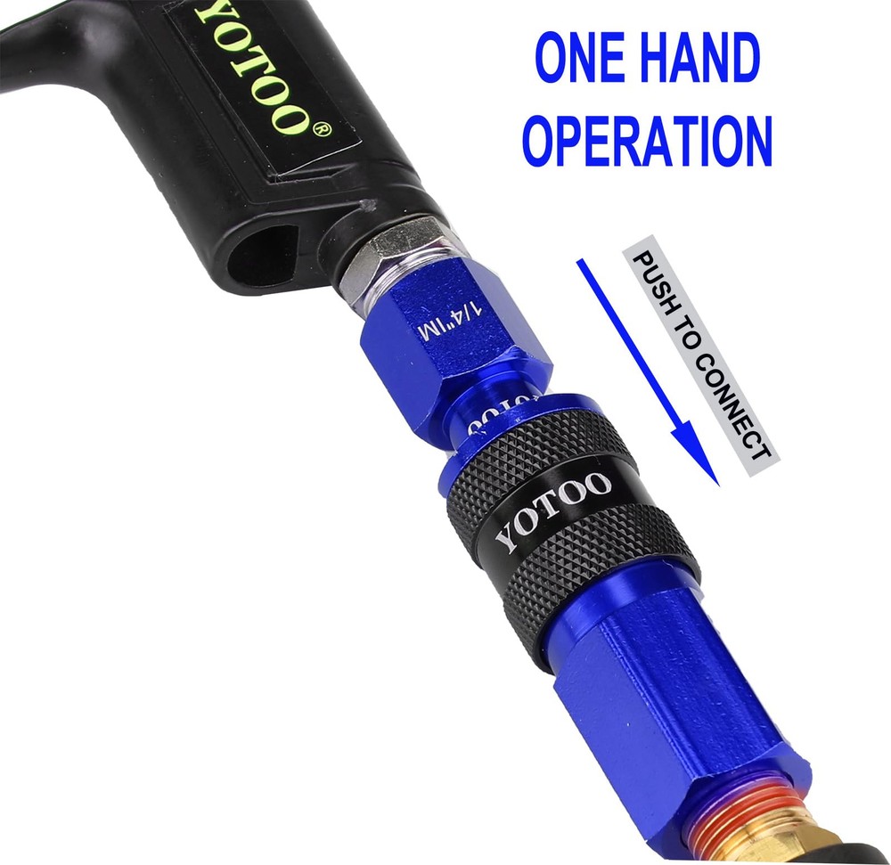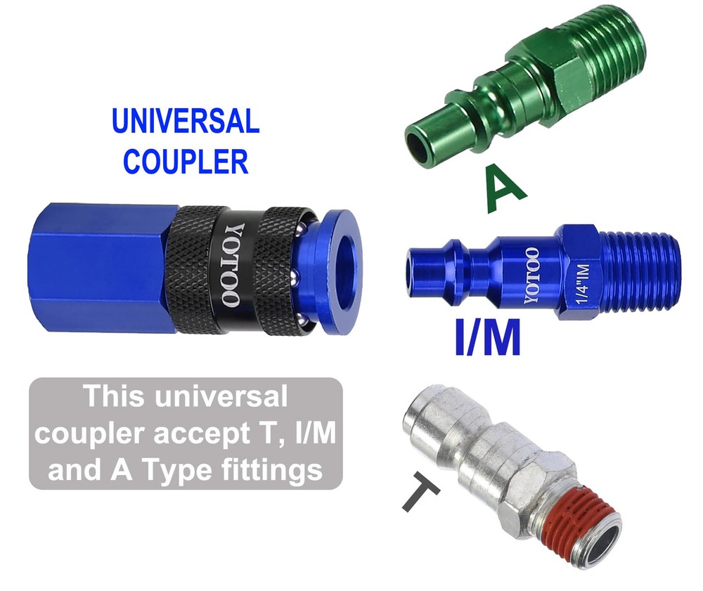 3 WAY AIR MANIFOLD: This air manifold has 3 outlets which allows to operate 3 different air tools at the same time. Meets requirements of only one air line inlet but need multi outlets. LIGHTWEIGHT DESIGN: The Quick Couplers, plug and hex flat manifold body are made of hgih quality aluminum. The lightweight design avoids to damage the air line because of heavy parts. UNIVERSAL QUICK COUPLERS: The universal Coupler connect to 1/4" industrial, automotive, and ARO plugs. Just push plugs to coupler, ONE HAND operation. Six balls design for connecting air fittings securaly and NO LEAKING. EASY TO USE: The quick connect couplers and plugs make it fast and easy to connect and disconnect air compressor or air tool fittings. WARRANTY&SUPPORT: ONE YEAR warranty. Any problem, please feel free to contact us.