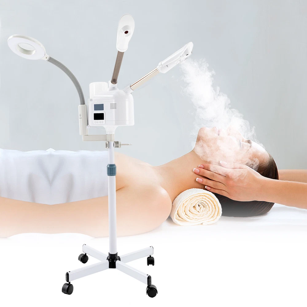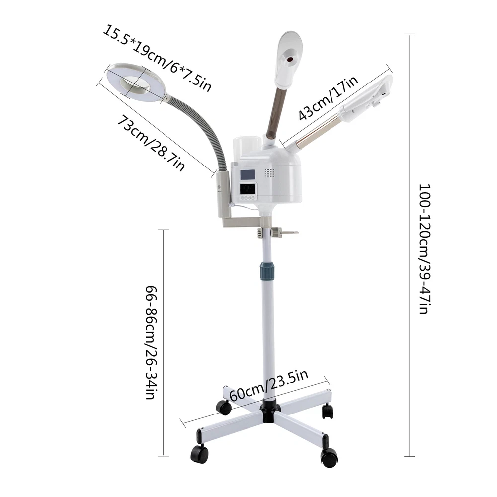 3-in-1 Facial Steamer Face Skin Care Spa Beauty Sprayer Steamer Machine 1000ml Description Nowadays, staying up late at night and working overtime, staying in air-conditioned rooms for long periods of time, exercising resulting in a lot of sweating, etc. all accelerate the loss of skin moisture. Then you need this 3 in 1 facial steamer to improve your skin. It speeds up the microcirculation of your skin and moisturizes and sterilizes. Deep cleansing, hydration, and nourishing skin care will allow you to complete a whole high-quality skincare routine at home. Don't hesitate because your skin can't wait! Key Features Skincare Assistant : This 3 in 1 facial steamer with hot and cold double tubes and 5X super clear LED light can accelerate skin microcirculation, and has moisturizing and anti-corrosion functions. It enables you to complete a set of high-quality skin care procedures at home, which is economical and convenient. The Secret of Keeping Young : It uses ozone atomization to disinfect , soften the cuticle, improve blood circulation, etc. It can effectively relieve nerves, promote metabolism, and restore young and firm skin. Cold and Hot Spray Mode : It has an independent hot and cold double spray mode, which is a family spa used throughout the year. The hot spray accelerates the metabolism products to further clean the pores, and the cold spray can calm the skin and relieve the water-oil balance of the skin. High-quality Material : This 3 in 1 facial steamer is mainly made of high-quality plastic and hardware, so it is not only safe but also durable. Under normal operation, it can meet your long-term skin care needs. Easy to Use : The LCD operator panel can be easily switched on and off and timed from 0-30min, so you can enjoy your spa in the comfort of your own home. Deep Hydration : This 3 in 1 Facial Steamer is larger than conventional standing facial steamer sprays and turns water molecules into nano-particles through high-frequency vibrations. It keeps the skin hydrated for 8-15 minutes a day and effectively improves dull skin and brightens skin tone. Deep Cleansing : It uses ionic vaporization technology to produce ultra-fine steam that is easily absorbed by the skin. It penetrates the skin better than the basic hot water standing facial steamer, thus achieving a deep cleansing effect. Comfortable Beauty Experience : Both the body and the spray tube can be rotated 360 degrees. In addition, the height of the machine can also be adjusted between 39in and 47in , so you can choose to sit or lie down for a pleasant facial time. Easy to Clean : This 3 in 1 facial steame r has a removable water tank, so it is very easy to remove and clean. It also allows you to say goodbye to limescale from now on, and no longer worry about cleaning . PTC Heating Technology : It uses innovative PTC heating technology, so it can achieve fast heating and delicate atomization. In addition, it will be safe from power failure and interference, adding more protection for your use. Safe and Secure : When the machine does not detect the water level the machine will automatically cut off the power. In addition, the warm steam of 42℃ is very friendly to our skin, so you can use it with confidence. Great Stability : It uses a crossed base to support the whole machine, so it is very stable and will not shake and collapse. Details Independent Transparent/Large Capacity Water Tank : It adopts a 33.81oz independent transparent water tank design, which can hold more water at one time and allows you to control water volume more intuitively. Germicidal Lamp: This facial steamer has a built-in germicidal lamp that destroys harmful bacteria for gentler and cleaner hydration. Universal Wheels : Each of the four kickstands is installed with a universal wheel that has brakes , so you can move it from the bedroom to the living room and fix it at will, which is very convenient. Heat Dissipation Holes : The machine body is designed with dense heat dissipation holes, which can effectively dissipate the heat generated by the machine's operation and extend its service life. Application It can be used at home to allow you to achieve a skin care spa at home, and it can also be used in beauty stores to provide better quality skin care services to customers. Specification Material: Plastic, Hardware Color: White Item Type: Facial Steamer Machine Power: 25W Water Tank Capacity: 1000ml/33.81oz Spraying Time: 0-30min Magnifying Magnification: 5 Times Plug Voltage: 110V, 60Hz Plug Type: US Plug Adjustable Height: 100-120cm/39-47inch Bar Height Range: 66-86cm/26-34inch Beauty Lamp Length(with Bar): 73cm/28.7inch Beauty Lamp Size(L*W): 15.5*19cm/6*7.5inch Hot Jet Pipe Length: 43cm/17inch Cold Jet Pipe Length: 43cm/17inch Base Size(Diagonal): 60cm/23.5inch Gross Weight: 5.2kg/11.5lbs Net Weight: 5kg/11lbs Package Size: 69*18*28cm/27.2*7*11inch Package Included 1*3 in 1 Facial Steamer 1 Set* English Manual 4* Universal Wheels All Accessories for Assembly Notes It is recommended to use tap water for the first three times, then distilled water or pure water can be applied in later use. Please read the operating manual completely before use. And pay particular attention to the safety instructions included. Please allow the slight color difference caused by the shooting light and 1-3 cm error due to manual measurement, and make sure you do not mind before ordering. Payment Delivery details Terms of sales About us Contact us Payment We accept ebay payment 。 Fees such as import duties, taxes are not included in the item price or shipping costs. These charges are the buyer's responsibility. Delivery details Shipping: 2-9 working days to: USA Terms of sales We maintain high standards of excellence and strive for hundred percent customer satisfaction. Feedback is very important to us. We hope that you contact us immediately before you give neutral or negative feedback, so that we can address your concerns. It is impossible to address issues if we