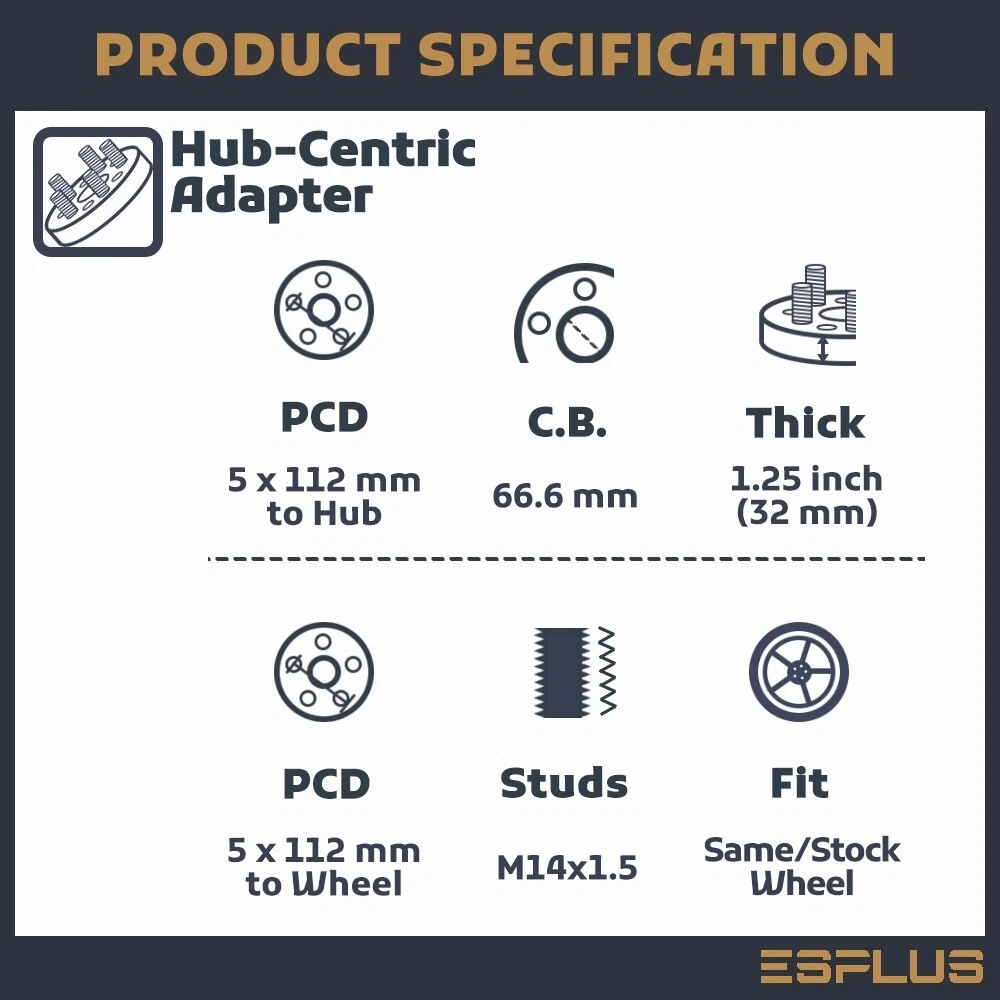 Store Home | Hot Products | Hot Deals | Suscribe for More | Customer Feedbacks | Contact us Categories Universal Lug Nuts OEM Lug Nuts Wheel Locks Conical Seat Lug Bolts Ball Seat Lug Bolts Hub Centric Spacers 4 Lug Wheel Adapters 5 Lug Wheel Adapters 6 Lug Wheel Adapters 8 Lug Wheel Adapters Studs Conversional Adapter 5 Lug HubCentric Adapter 6 Lug HubCentric Adapter Universal Wheel Spacers 1.25 Inch Hub-Centric Adapter Spacer / 5x 112 mm PCD 66.56 mm C.B. /M14x1.5 / Lug Bolt-Lug Nut Specifications Quantity: Set of 4 pcs adapter + 20 Lug Bolts Adapter Stud Thread: M14x1.5 Adapter Bolt Pattern: 5x112 mm Adapter Center Bore: 66.56 mm Adapter Thickness : 1.25 Inch Material: 6061 T6 Aluminum Spacer/10.9 Grade SCM Heat Treated Steel Color and Finish: Black Lug Bolt Thread to Hub: M14x1.5 Tool Requirement: 17 mm Hex Socket Package 4 Pcs Adapter+ 20 Pcs Lug Bolt Important Notice For stock wheel users, we suggest to use shape of existing lug Bolts' Flange , Seat Type , and Shank Length as refernce before buying. Compatibility chart from Ebay is only designated for Thread Pitch check. The actual fitment varies based on the requirements of wheels. Lug nuts/bolts seat has to strictly follow the wheel condition. If you are not sure, please do not hesitate to ask customer service. Our Return Policy If ever you’re not satisfied with your purchase, we offer 30-day return. Returned product must be intact and unused as the same condition of the original shape and package. Upon return, please contact the customer service for Return Merchandise Authorization (RMA) number prior to returning. A 25% restocking fee will be charged for all non-defective products. All refunds will be credited back to the original payment method. About US We strike to provide high quality auto parts. Your satisfaction is our first priority. Should you have any questions, please do not hesitate to contact our customer service for help. Limitation of Liability In no event shall our liability exceed the value of the product(s) sold. In no event shall our company be liable for any direct, indirect, punitive, incidental, special or consequential damages whatsoever arising out of or connected with the use or misuse of any of its products. Fitment Following chart is designated for Thread Pitch check only. Due to aging, your studs may have been changed. Please compare the shape and thread mark with your existing lug nut before buying. Q & A How do I know If this product will fit my car? 1. Use compatibility chart to check Make/Model/Year 2. Check wheel hub is factory default 3. Check The Hub Stud is shorter than Spacer Thickness 4. You will Need a Set of M14x1.5 Lug Nut to Fit Your Wheels 5. Check wheel is Same Bolt Pattern as Hub(Same/Stock Wheel) 6. Check wheel lug hole flange requirement is 0.9” or 17 mm *You can also use existing lug Nuts thread/shape as reference Why is the product doesn't have enough grab to the wheels? Your Nuts are too short to have enough thread into the hub. Solution: 1. You need Extended Type Lug Nuts 2. You need to use Longer Stud to match the Wheel Requirement Why is the product too thin that won’t hold my wheel? Your wheel requires large flange lug Nuts to hold, for ideal flange size, please refer to your existing lug Nuts Solution: 1. You need large flange lug Nuts 2. You need to use lug Nuts flange adapter to make it fit Why does the product not fit my wheel cap? Most of the wheel caps have clipers that require lug Nuts to hold,our lug Nuts may not have the same shape to match the clippers Solution: 1. You need to purchase the exactly same lug Nuts from the caps 2. You need to remove your wheel caps Why does the product not fit my hub cap? Most of the hub caps are much thicker than the hub without hub cap, it would require more thickness of spacer to fit Solution: 1. You need to purchase Thicker Spacers due to the height of the hub-cap 2. You need to remove your hub-caps Why the wheel were damaged/damaging my car? The thickness of the spacer were exceed the maximum thickness of the fender requirement Solution: 1. You need to purchase Thinner Adapter due to requirement of the fender gap 2. You need to remove your Adapters and use original Wheels Why is the thread not matching my wheel hub, but my car is listed in the compatibility chart? Wheel hubs are subjected to be replaced due to aging or repair, after that, you may have different thread than factory default Solution: 1. Check the thread from your existing lug Nuts 2. Any auto-shop would have a tool to measure thread, or you can send us a pic of your existing lug Nut to confirm Why does my lug nuts have different mating seat type than the product I purchased? Seat type of mating surface is based on the wheels, different wheels have different mating surface requirements. Some stock wheels may require special mating surface assembling. Solution: 1. Check the matting surface from your existing lug Nuts and that from your wheels 2. Alloy stock wheels, steel stock wheels, and aftermarket wheels have different mating specification What is the cut-off time for same day shipping? Cut-off time for shipping is 9:30 am PST every business day excluding weekends and ferderal holidays, The shipping date for weekends and federal holidays moves to next available week days How do I get expeditate shipping for timely purposes? Expeditate shipping is based on delivering address, in rear cases, carrier may experience delay due to operational difficulties. Solution: Contact customer service before placing expediate orders Not receiving my package but tracking says delivered Package may be lost, missent, placed in porch or mail box Solution: 1. Check if shipping address on file is up to date 2. Check surroudings including porch, mail box, door steps etc. 3. File item not receive case to ebay, carrier, customer service How does international order shipping work via eBay Global Shipping Program, and how do I check status? ebay Global Shipping Program (GSP) is eBay host