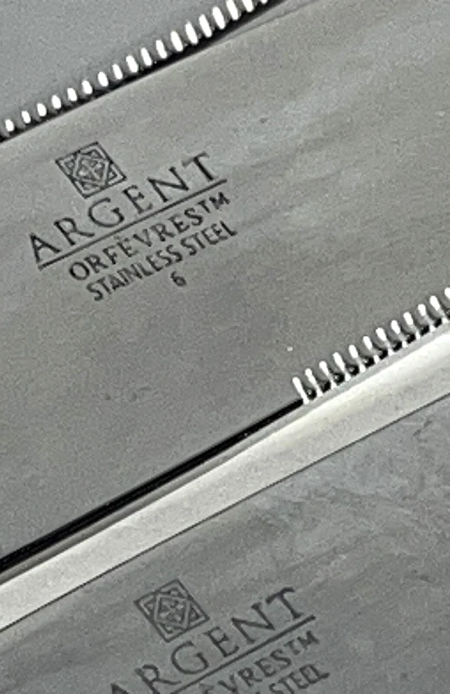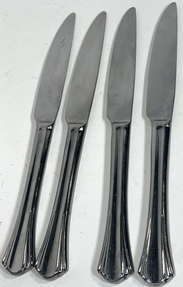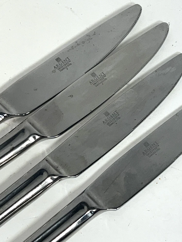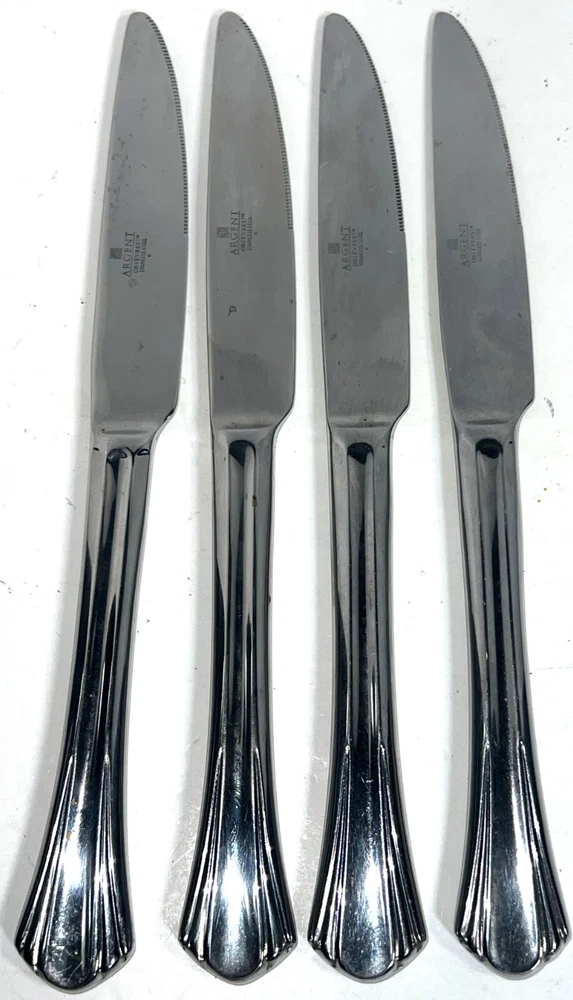 Lot of 4 Argent Orfevres GERTRUDE Hampton Silversmith Stainless Steel 9.5" Long French Solid Dinner Knives. Good gently used condition with some minor normal usage wear including some light scratches, see pics.