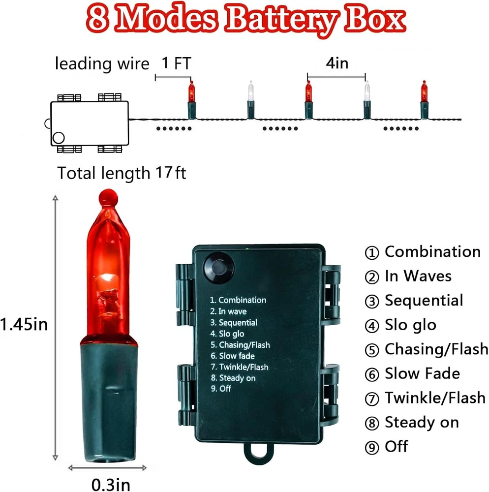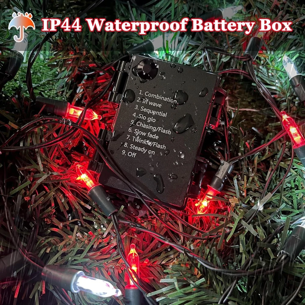 4 Pack Battery Operated Christmas Lights: Each Christmas light with 50 high-quality and bright LED lights, length is 16FT. These twinkle lights are powered by 3 AA batteries (BATTERY NOT INCLUDES), which are safe and energy-saving, keep at a low temperature after lighting up for hours. You can place it anywhere you like without concerned about the extra cord or socket 8 Lighting Modes and Memory Function: Our Christmas red and white string lights have 8 lighting modes: Combination, In waves, Sequential, Slow Glow, Chasing/Flash, Slow fade, Twinkle/Flash, Steady on, which can be changed by pressing the button on the battery case to satisfy your diverse needs. The built-in memory chip saves your last mode setting, no need to set it again Christmas Tree Lights with Timer: When the string light is turned on, the timer function will automatically activate without additional settings. Automatically light up for 6 hours, turn off for 18 hours, and then light up again for 6 hours. This cycle repeats infinitely, no need to set it every day Waterproof Christmas LED Lights: Our battery powered fairy lights are perfect for use in any weather due to robust construction and waterproof design. It can keep shinning even in humid condition, lighting up your yard garden, adding a festive touch for Christmas. PLEASE DON'T put the twinkle mini lights under water directly Xmas Decorations for Indoor and Outdoor: SANJICHA bright mini string lights are perfect for outdoor and indoor Christmas decoration, holiday decoration, garden, yard, lawn, patio, home, bedroom, shows, restaurant, hotel decor, Christmas tree, Christmas party, wedding,Thanksgiving decoration. Ideal Christmas gift for your friends, family and children. Buy with Confidence: Please rest assured that you have made the right purchase. If the battery twinkle lights have manufacturing defects, just click GET HELP WITH ORDER under your order ID, and our customer service team will gladly assist with your issue within 12 hours.