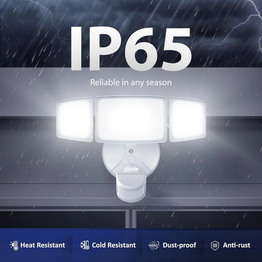 BRIGHT SECURITY: Onforu 65 W LED motion sensor lights deliver up to 6500 lumens of brightness to illuminate a large outdoor area automatically AUTOMATED LIGHTING: The PIR motion sensor detects movement within a 180° area up to 72 feet away, activating the lights for 10-600 seconds to deter intruders WEATHERPROOF DESIGN: With an IP65 waterproof rating, these flood lights withstand rain, snow, and outdoor elements to provide reliable lighting year-round LONG-LASTING LEDS: High-quality 6500 Kelvin white LEDs provide energy-efficient lighting with a lifespan of over 30,000 hours to save on replacement and electricity costs EASY TO INSTALL: Easily hardwired to the outside of your home for around-the-clock power and peace of mind Product Description 1 Energy Saving 2 Reliable Design 3 Motion Detector
