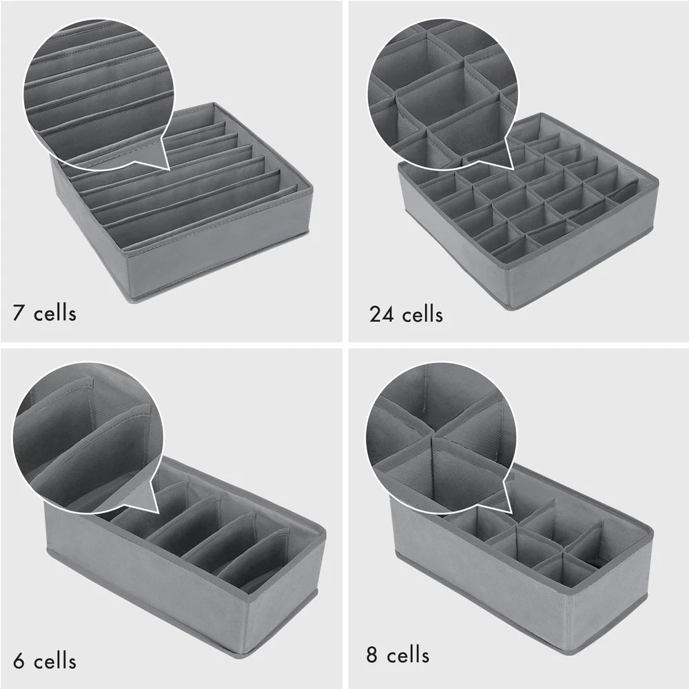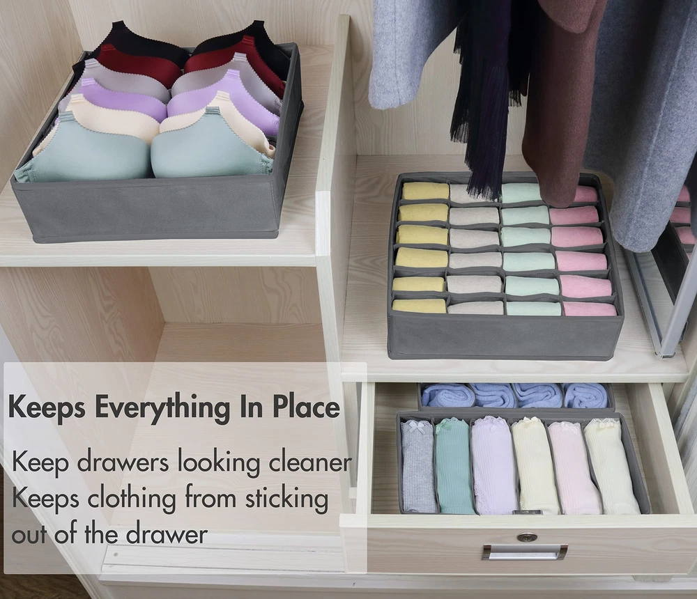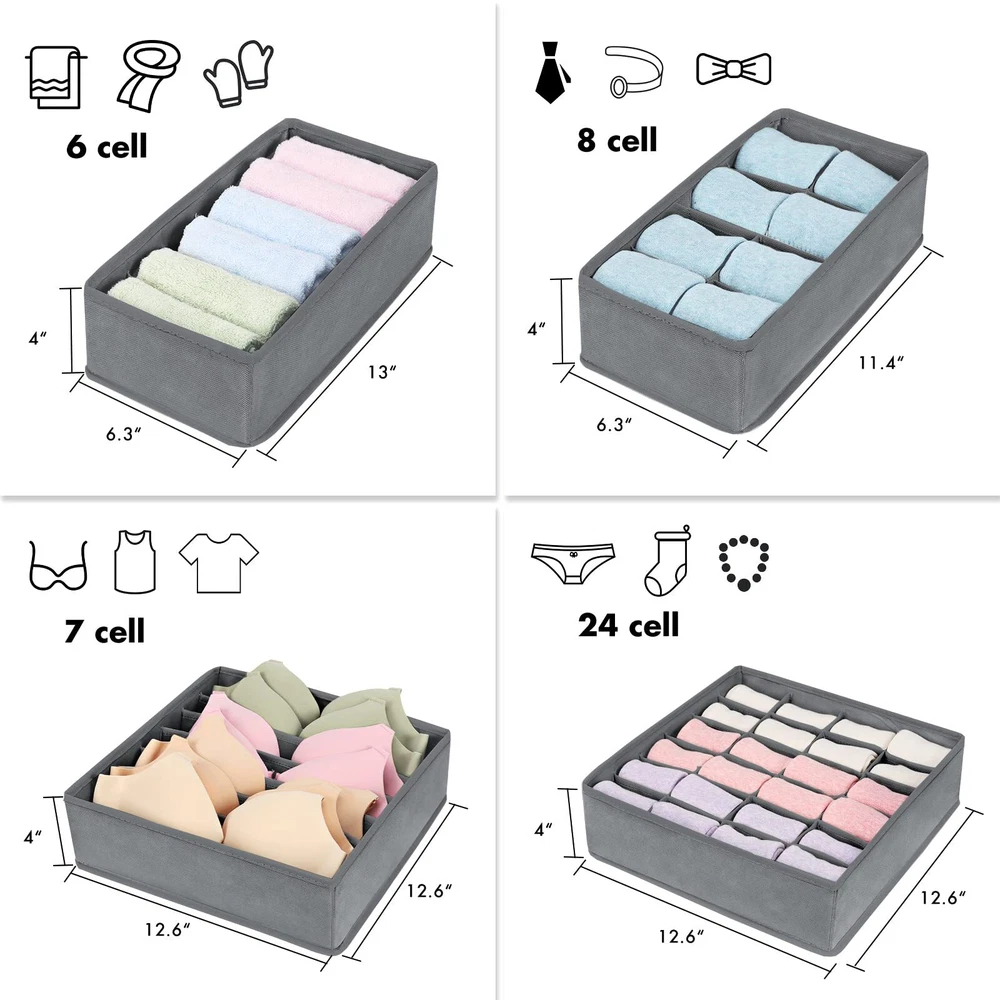 Are you tired of searching underwear, bras, lingerie, panties, briefs, socks, ties, scarves,belts ,shirt, T-shirt etc when you want to wear ? Are your messy clothes occupied a huge chunk of the space ,and let's you feeling headache? Did you know getting rid of these clothes would eliminate 20% of the housework in the average home? If yes, then our Clothes Drawer Organizer can provide a simple and cost-effcient way to take your clothes storage from mess to neat, and help you develop a good habit of organizing things, making your house tidy and clean. Organize your storage, Organize your life. Specificatons: Material: Set of 4 Underwear and Bras Drawer Organizers is Made of non-woven fabric, which is durable and breathable, lining panels are made from cardboard. Dimension: 6 cell bins : 12.99"*6.30"*3.93" 7&24 cell bins: 12.59"*12.59"*3.93" 8 cell bins: 11.42"*6.30"*3.93" Humanized Design: Our bedroom drawer organizer with Various Storage Space: 6 cell ( lingerie,scarves, belts), 8 cell (underwear, briefs, ties), 7 cell (bras,camisoles, tights), 24 cell (socks, pantyhose,silk stockings). , the way are built can accommodate a variety of items in a neat fashion Easy to Assemble & Storage: All you do is take the underwear drawer organizer out of the box, unfold the sock underwear organizer, and do the zipper on the bottom,then insert a cardboard piece into the bottom.Easy to and space-saving when not in use . Muti Purpose : Foldable closet underwear organizer Can be used for a variety of underwear, bras, lingerie, panties, briefs, socks, ties, scarves,belts ,shirt, T-shirt, undergarments, and personal items. Package : Set of 4 bra organizers and storage in OPP bag Note: Do not storing wet clothes Do not force loaded too much or too heavy items 【Make Your Life Easier 】 Good for organizing your underwear, bras, lingerie, panties, briefs, socks, ties, scarves,belts etc. Easy to find which you want to wear and never need to ransack all of your clothes, reduce 30% of time for dressing . 【Durable and Premium Quality】Our underwear drawer organizer is made of NEW long-lasting non-woven fabric, which is durable and breathable, No smells, will not be easy to tear. It can be easily cleaned with a damp cloth for years of use. Safe to baby's clothes . 【Various Storage Space 】6 cell ( lingerie,scarves, belts), 8 cell (underwear, briefs, ties), 7 cell (bras,camisoles, tights), 24 cell (socks, pantyhose,silk stockings). 【Easy to Assemble and Collapsible】All you do is take them out of the box, unfold them, and do the zipper on the bottom. Provides a attractive, lightweight solution and easy carrying to many personal storage needs. Magically folds up into a compact size when not in use, easy to . 【Customer satisfaction】We promise a 90-Day product exchange and 30-day money back! If you are not 100% satisfied, us directly (EVEN IF after the return window) and we will provide you with a no-questions-asked or .
