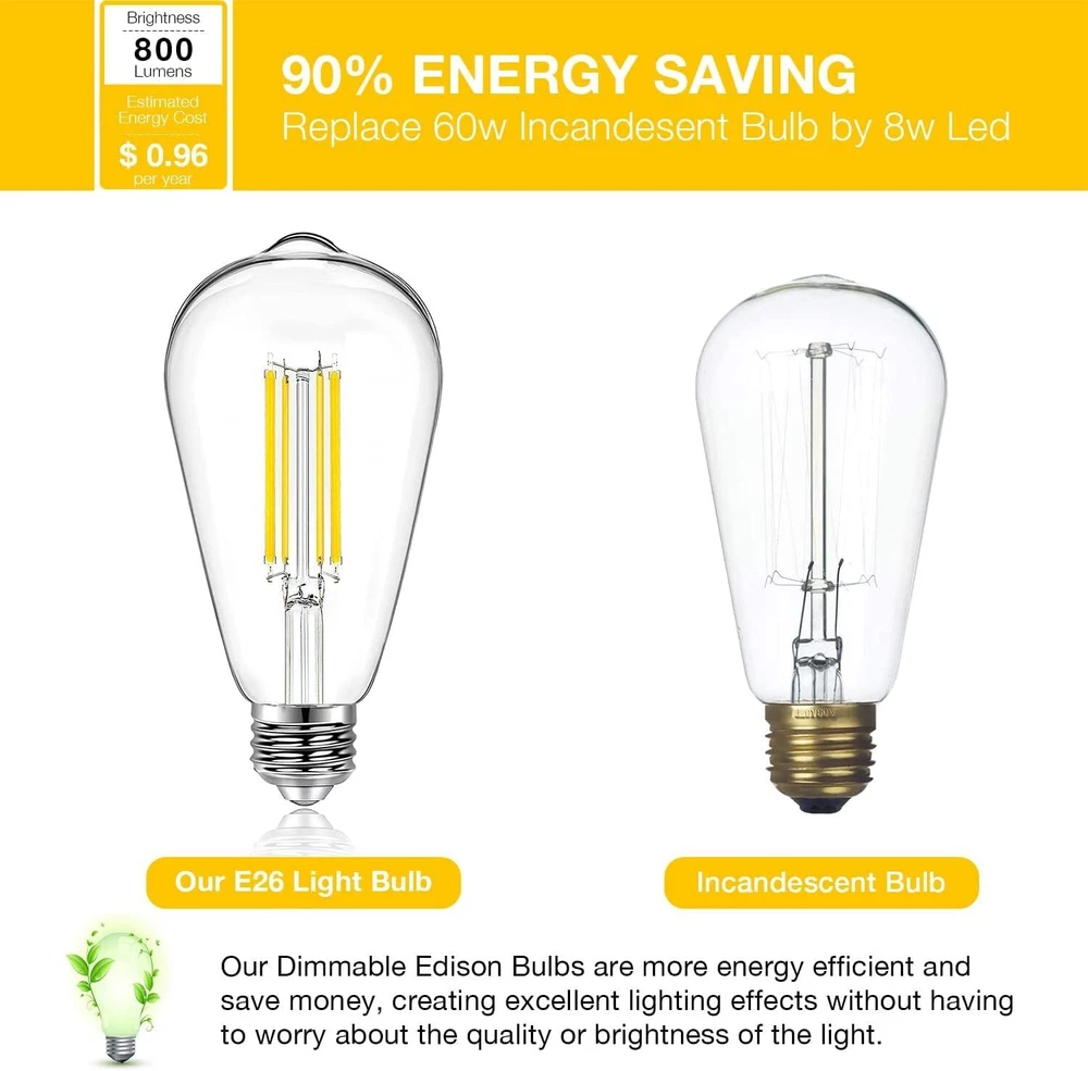 4 Pack Vintage LED Edison Bulbs, E26 Led Bulb 60W Equivalent, Dimmable Led Light Bulbs, High Brightness 800 LM Warm White 2700K, ST58 Antique LED Filament Bulbs, Clear Glass Style for Home - 4 Pack, Warm White Light Type LED Special Feature Energy Efficient, Dimmable Wattage 8 watts Bulb Shape Size ST19 【Energy & Money Saving】DAYBETTER edison bulbs provide lighting equivalent to a 60 watt incandescent bulb, you can save over 90% on your lighting bill, low power consumption, provides over 15,000 hours of life and reduces the frequency of your bulb replacement. 【Smooth Dimming】 E26 led bulbs 60 watts are designed with the latest light source technology, which makes them compatible with most dimmers in the market, providing a smooth dimming control with the highest brightness at 100% and the lowest brightness at 10% without flicker. The smooth dimming pattern allows you to adjust the brightness for your room anytime. 【Excellent Performance】Edison led light bulbs are made of advanced LED filaments and high strength clear glass with high light transmission, no radiation, no mercury and UV/IR light, and low heat generation, combining a vintage classic look with modern efficient LED technology to add elegance and history to your house. 【Wide Application】 Warm white light bulbs retain the design of traditional edison bulbs with 2700K soft warm white light and 800 lumens on full brightness to provide relaxing and comfortable lighting for your home or workspace. Fit in a standard E26 screw base, the high brightness led edison bulb can be directly screwed into all light fixtures, such as pendant lights, chandeliers, vanity light fixtures, wall lanterns, floor lamps and table lamps. 【Care for Your Eyes】Vintage light bulbs have a high color rendering index of 80+, displaying the most natural color of the object itself, making colors appear more vibrant, no flicker, no buzzing sound, effectively protecting your eyes and the eyes of your family, very safe.