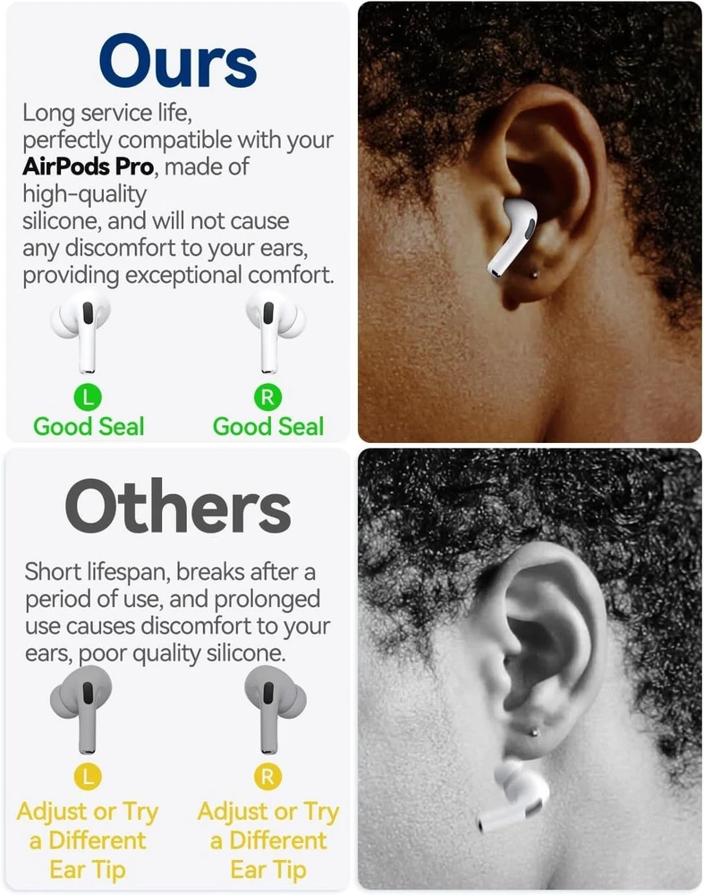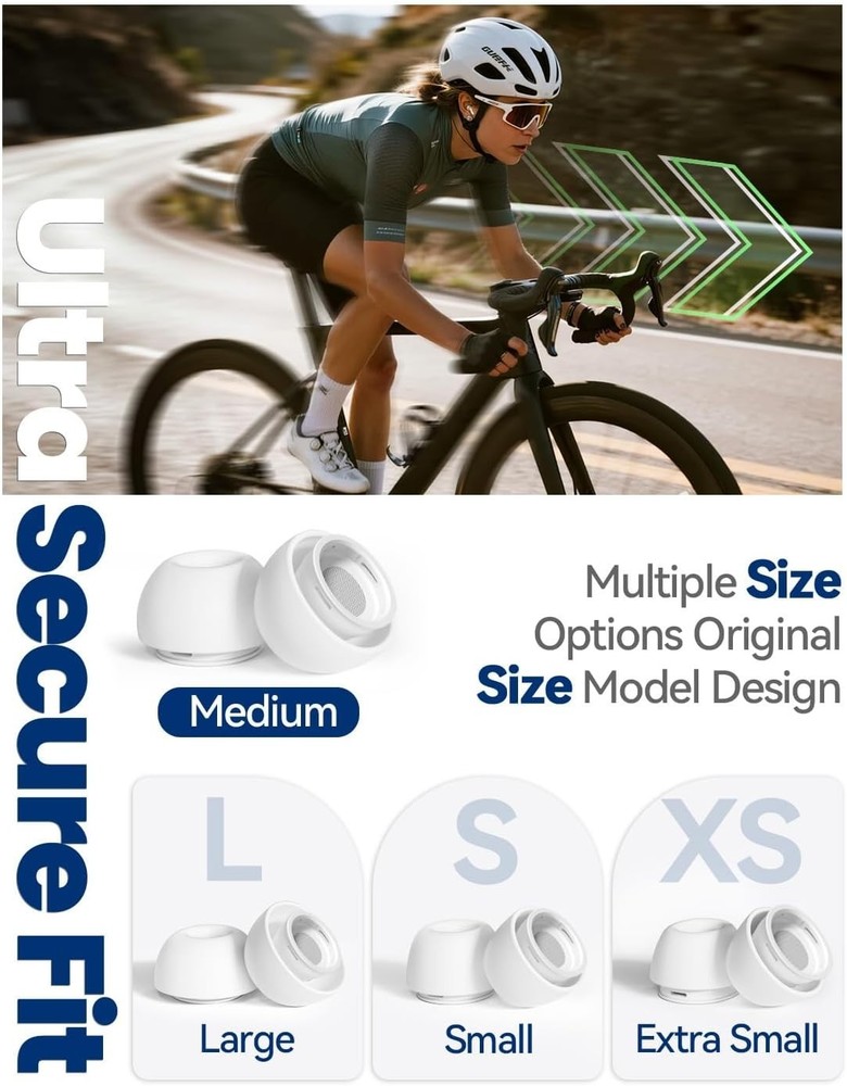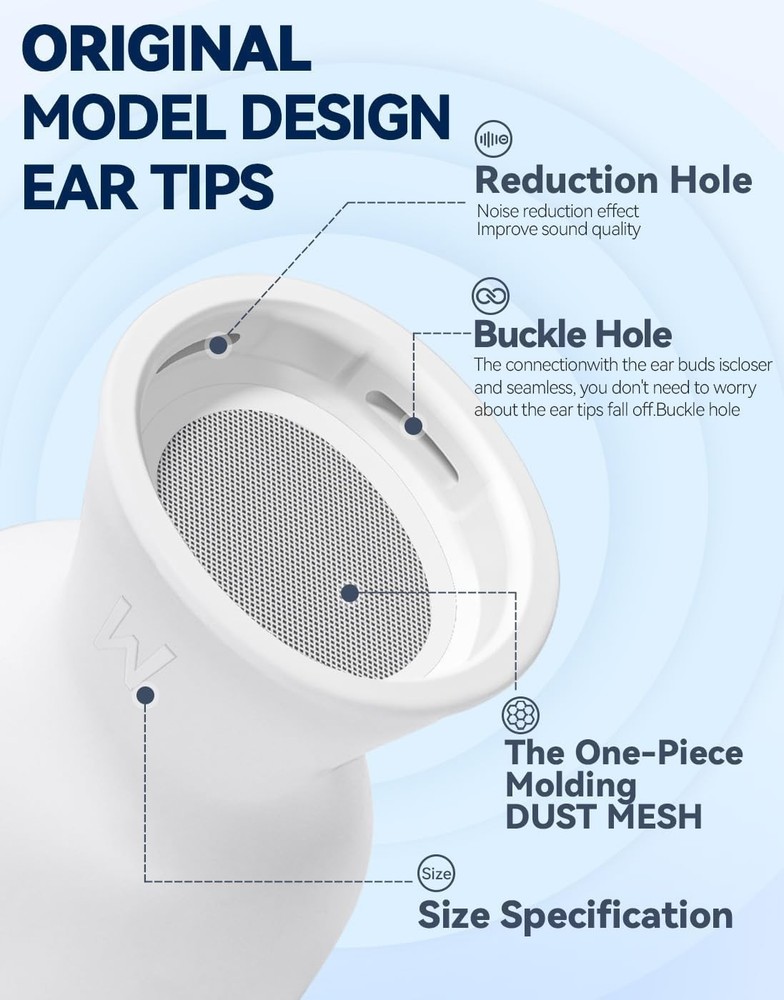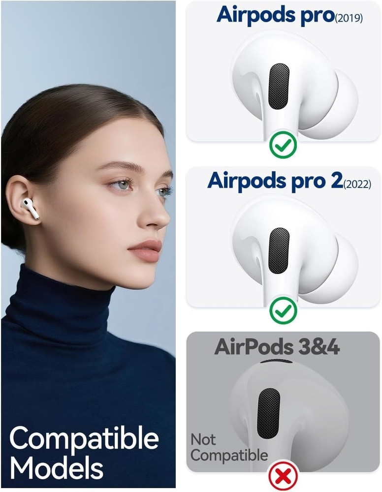 4 Pairs Silicone Ear Tips for AirPods Pro 2019 & AirPods Pro 2 2022 with Cleaning Pen,Noise Reduction Holewith & Built-in dust Guard Screen,USB-C 2023-4 Sizes XS/S/M/L Perfect Compatibility - Specifically designed ear tips for AirPods Pro (1st and 2nd Gen) and the latest AirPods Pro 2nd Gen with USB-C Charging Case (2023). Note: For use with genuine Apple devices only. Enhanced Noise Isolation - Features dual acoustic vents on each tip, mirroring the authentic Apple design, to preserve the active noise cancellation performance and ensure optimal sound quality. Secure & Comfortable Fit - Made with soft silicone, these ultra-lightweight tips provide lasting comfort. The built-in fine mesh dust guard helps keep debris out and ensures a secure fit during active use. 2-in-1 Cleaning Tool - Includes a dual-ended cleaning pen with a soft bristle brush on one end and a flexible loop tip on the other. Perfect for maintaining your earbuds, , keyboard, and other gadgets. Organized All-in-One Kit - Comes with four pairs of ear tips (XS/S/M/L) and a handy compact case to store your tips and cleaning tool, keeping everything tidy and protected. The video showcases the product in video guides you through product video compares multiple video shows the product being unpacked. Airpods pro ear tips Merchant Video