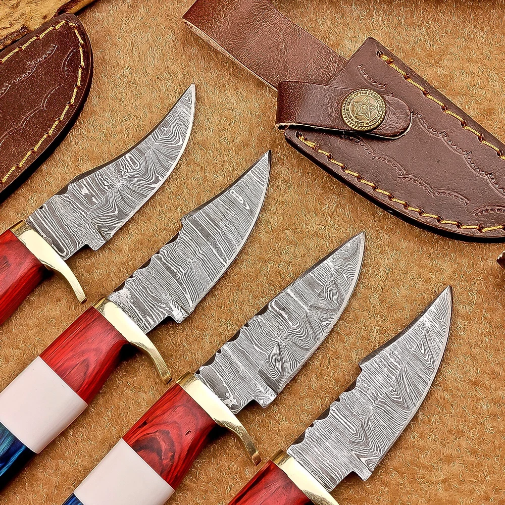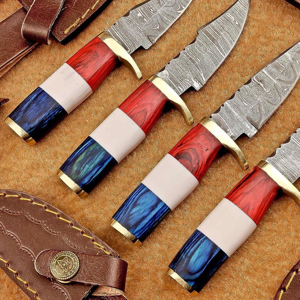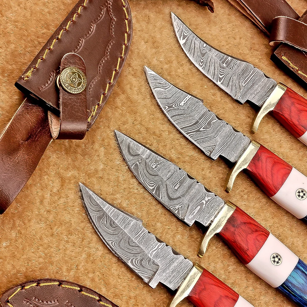 LOT OF 4 PCS! Handmade Damascus Hunting Knives – Multicolor Wood Handles Specifications: Overall Length: 6.00" Blade Thickness: ~4 mm Blade Material: Damascus Steel Handle Material: Multicolor wood and camel bone with mosaic pin with hand casted brass bolster. Includes: Leather sheaths Blade Craftsmanship: Blades are made from 1095 & 15N20 High Carbon Tool Steel with over 256 layers and a hardness of 58-60 HRC for durability and sharpness. Spine of the blade tang has excellent fire work Care Instructions: Sharpen with a Diamond Wet Stone at a 20-degree angle. Clean with soap and water, dry thoroughly, and apply gun oil. Store away from the sheath to prevent rust. Important Notes for Buyers: Verify your country’s import regulations before purchase. Customs duties, if any, are the buyer’s responsibility. Shipping & Returns: Free shipping included. 14-day return policy applies. Contact Us: Message us anytime. We respond within 24 hours.