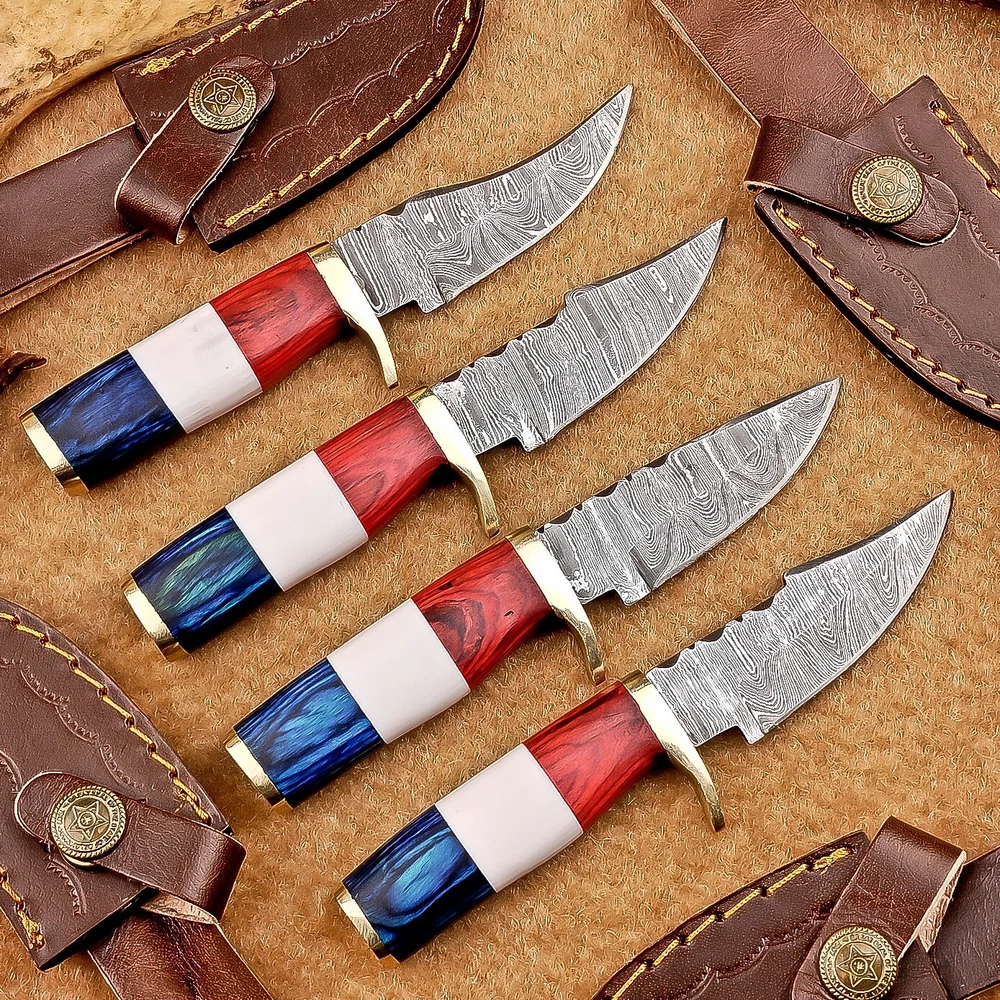 LOT OF 4 PCS! Handmade Damascus Hunting Knives – Multicolor Wood Handles Specifications: Overall Length: 6.5" Blade Thickness: ~4 mm Blade Material: Damascus Steel Handle Material: Multicolor wood and camel bone with mosaic pin with hand casted brass bolster. Includes: Leather sheaths Blade Craftsmanship: Blades are made from 1095 & 15N20 High Carbon Tool Steel with over 256 layers and a hardness of 58-60 HRC for durability and sharpness. Spine of the blade tang has excellent fire work Care Instructions: Sharpen with a Diamond Wet Stone at a 20-degree angle. Clean with soap and water, dry thoroughly, and apply gun oil. Store away from the sheath to prevent rust. Important Notes for Buyers: Verify your country’s import regulations before purchase. Customs duties, if any, are the buyer’s responsibility. Shipping & Returns: Free shipping included. 14-day return policy applies. Contact Us: Message us anytime. We respond within 24 hours.