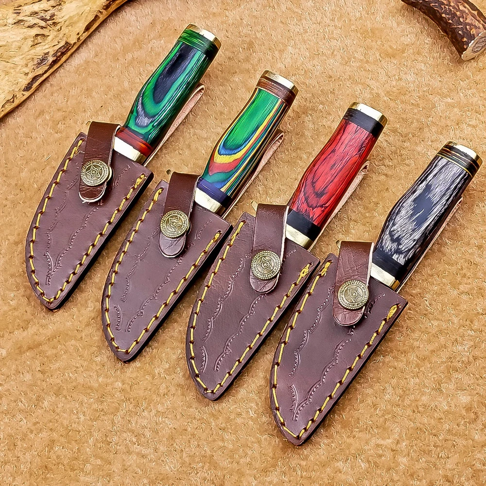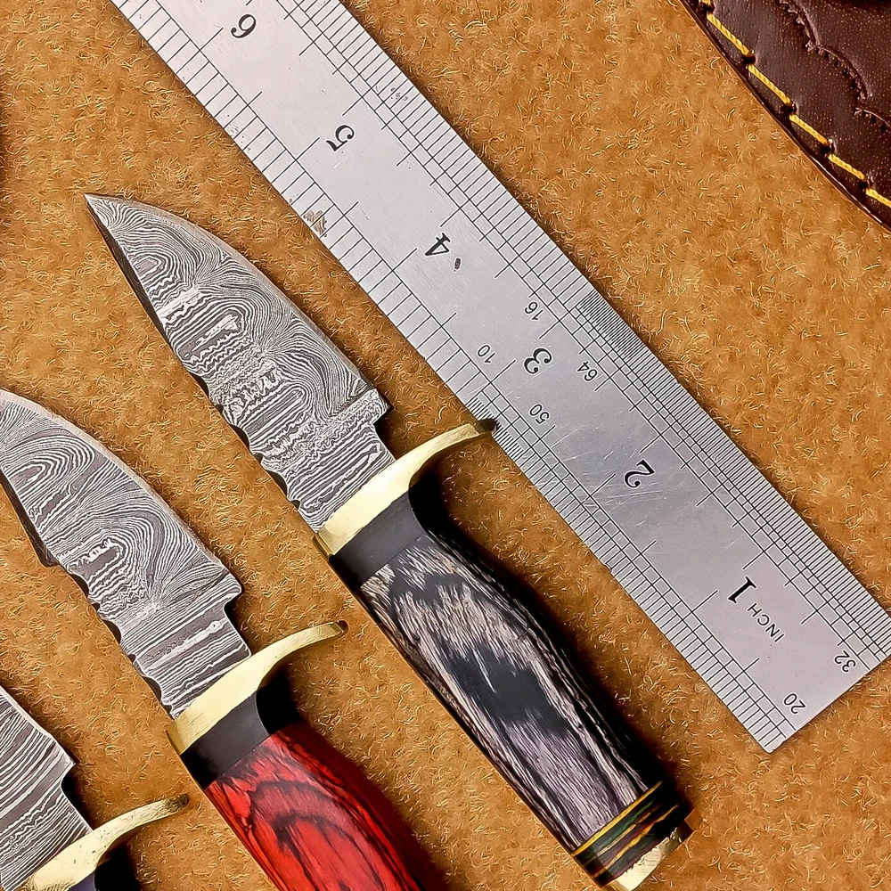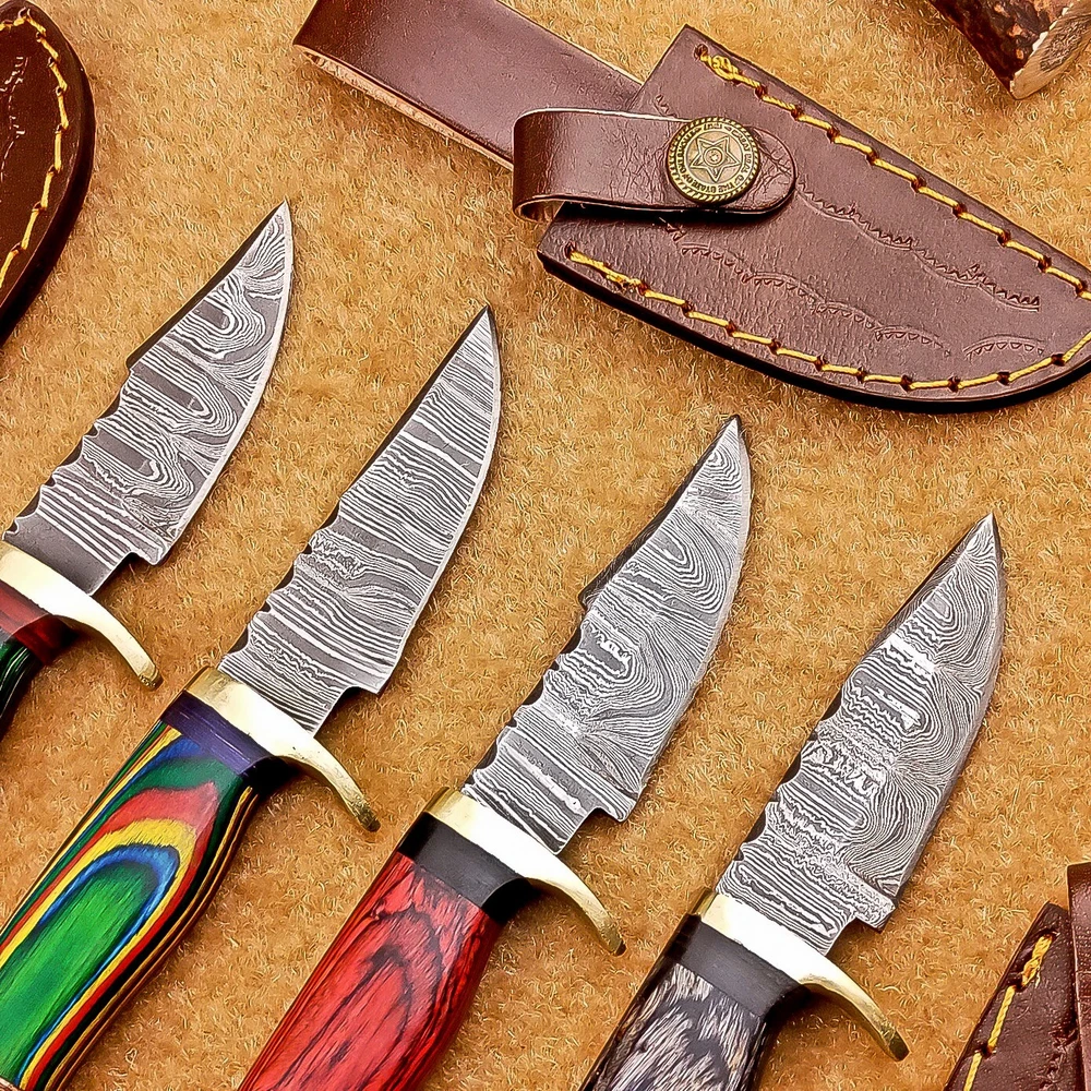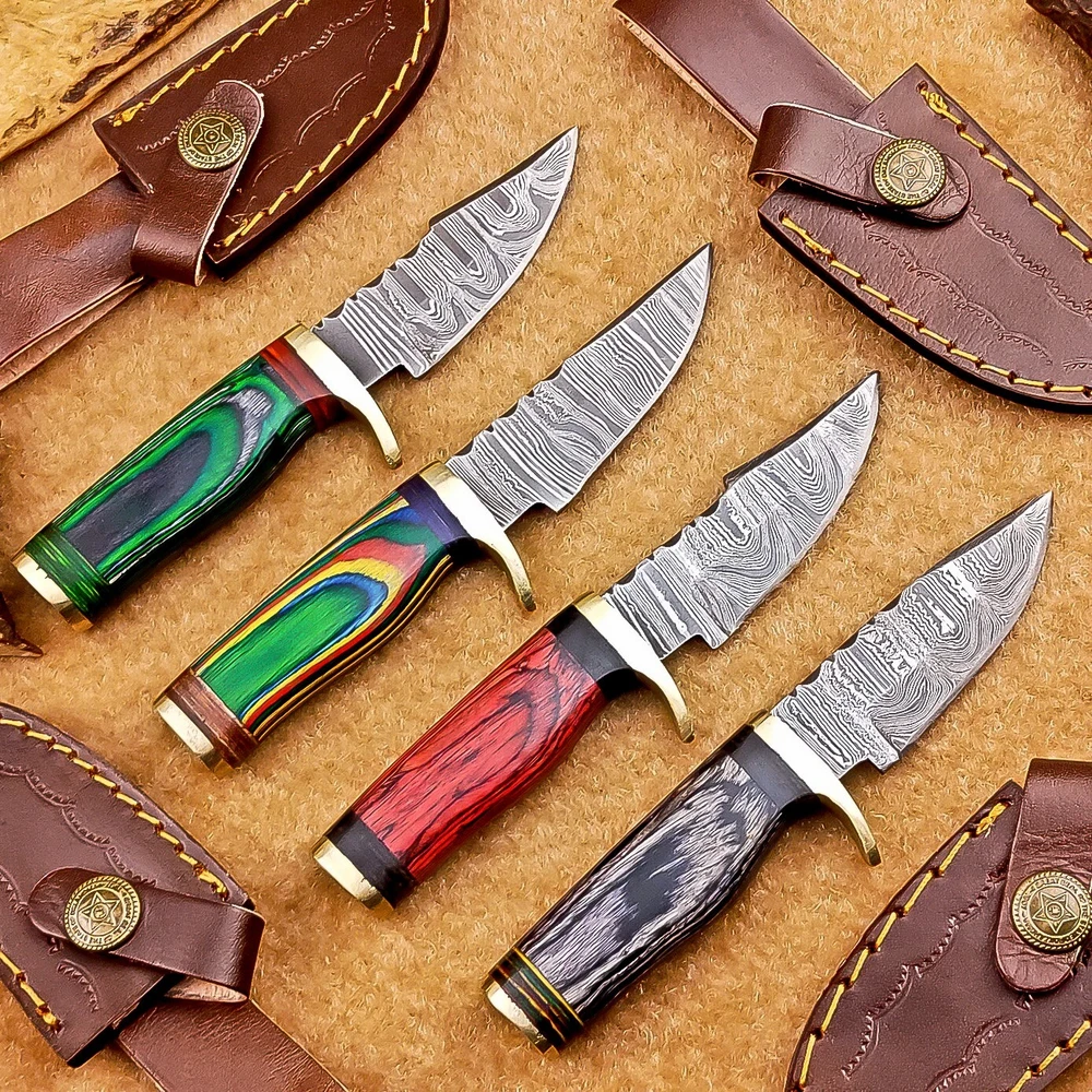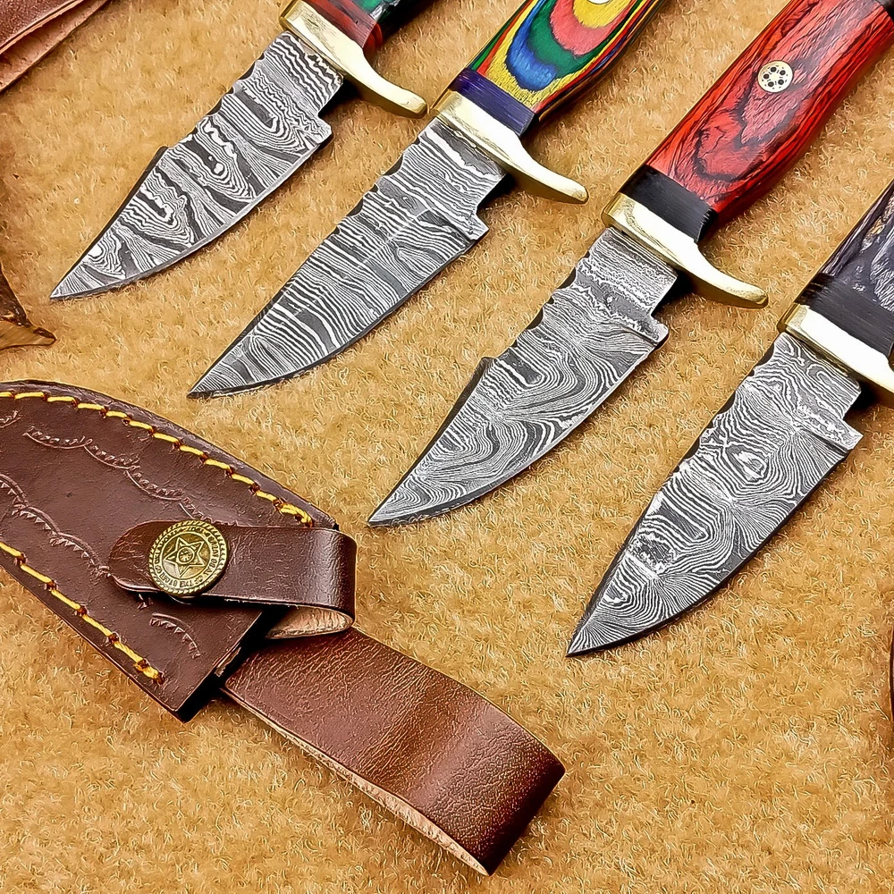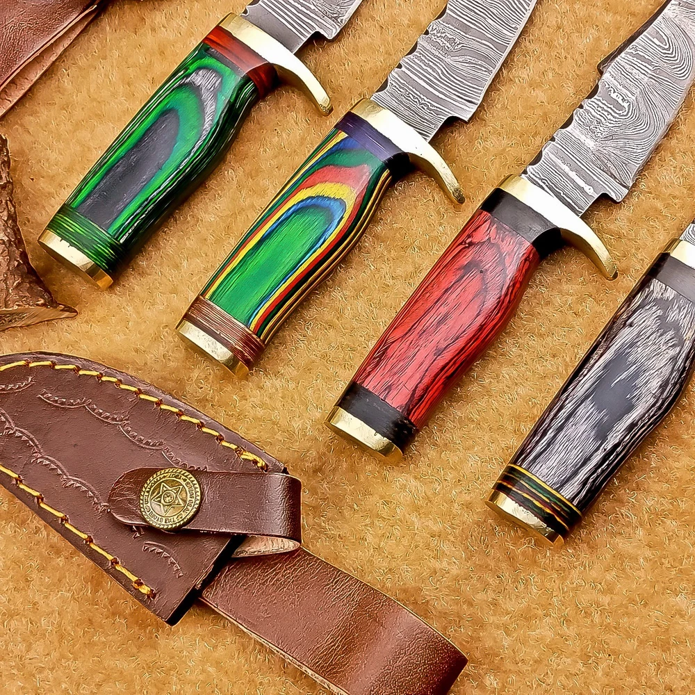 LOT OF 4 PCS! Handmade Damascus Hunting Knives – Multicolor Wood Handles Specifications: Overall Length: 6.00" Blade Thickness: ~4 mm Blade Material: Damascus Steel Handle Material: Multicolor wood with mosaic pins & hand casted brass bolster. Includes: Leather sheaths Blade Craftsmanship: Blades are made from 1095 & 15N20 High Carbon Tool Steel with over 256 layers and a hardness of 58-60 HRC for durability and sharpness. Spine of the blade tang has Excellent fire work Care Instructions: Sharpen with a Diamond Wet Stone at a 20-degree angle. Clean with soap and water, dry thoroughly, and apply gun oil. Store away from the sheath to prevent rust. Important Notes for Buyers: Verify your country’s import regulations before purchase. Customs duties, if any, are the buyer’s responsibility. Shipping & Returns: Free shipping included. 14-day return policy applies. Contact Us: Message us anytime. We respond within 24 hours.