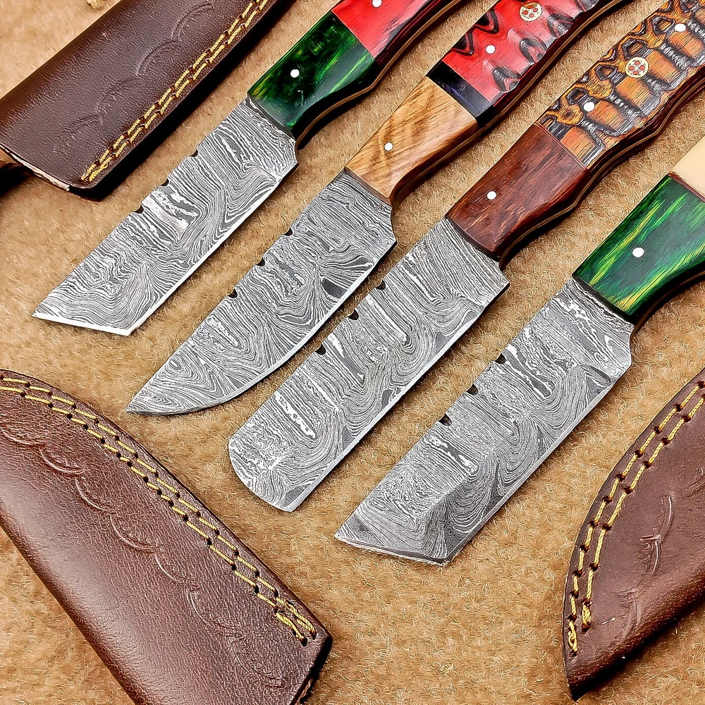 LOT OF 4 PCS! Handmade Damascus Hunting Knives , Skinner Knives Specifications: Overall Length: 8.0" Blade Thickness: ~4 mm Blade Material: Damascus Steel Handle Material: Hard wood and Resin / camel bone with brass pins mosaic pin Includes: Leather sheaths Blade Craftsmanship: Blades are made from 1095 & 15N20 High Carbon Tool Steel with over 256 layers and a hardness of 58-60 HRC for durability and sharpness. Spine of the blade tang has excellent fire work. Care Instructions: Sharpen with a Diamond Wet Stone at a 20-degree angle. Clean with soap and water, dry thoroughly, and apply gun oil. Store away from the sheath to prevent rust. Important Notes for Buyers: Verify your country’s import regulations before purchase. Customs duties, if any, are the buyer’s responsibility. Shipping & Returns: Free shipping included. 14-day return policy applies. Contact Us: Message us anytime. We respond within 24 hours.