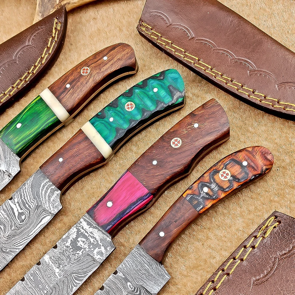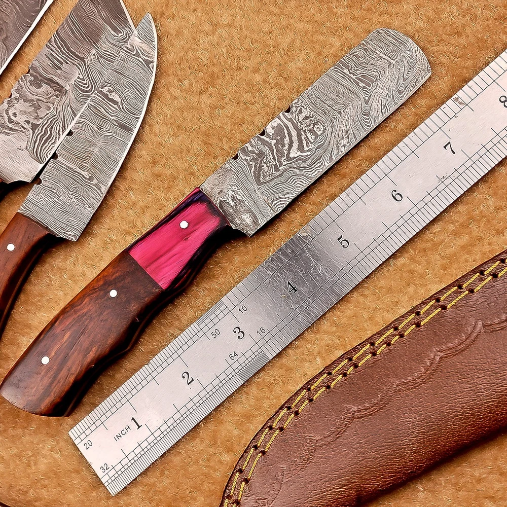 LOT OF 4 PCS! Handmade Damascus Hunting Knives , Skinner Knives Specifications: Overall Length: 8.0" Blade Thickness: ~4 mm Blade Material: Damascus Steel Handle Material: Hard wood with brass pins mosaic pin Includes: Leather sheaths Blade Craftsmanship: Blades are made from 1095 & 15N20 High Carbon Tool Steel with over 256 layers and a hardness of 58-60 HRC for durability and sharpness. Spine of the blade tang has excellent fire work. Care Instructions: Sharpen with a Diamond Wet Stone at a 20-degree angle. Clean with soap and water, dry thoroughly, and apply gun oil. Store away from the sheath to prevent rust. Important Notes for Buyers: Verify your country’s import regulations before purchase. Customs duties, if any, are the buyer’s responsibility. Shipping & Returns: Free shipping included. 14-day return policy applies. Contact Us: Message us anytime. We respond within 24 hours.
