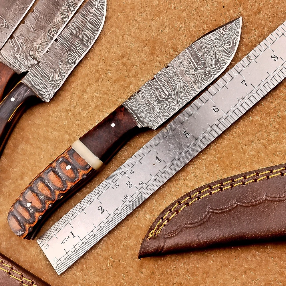 4 Pcs Damascus Blade Skinner Knives Set | 8" | Hard Wood, Leather Sheath IT-910