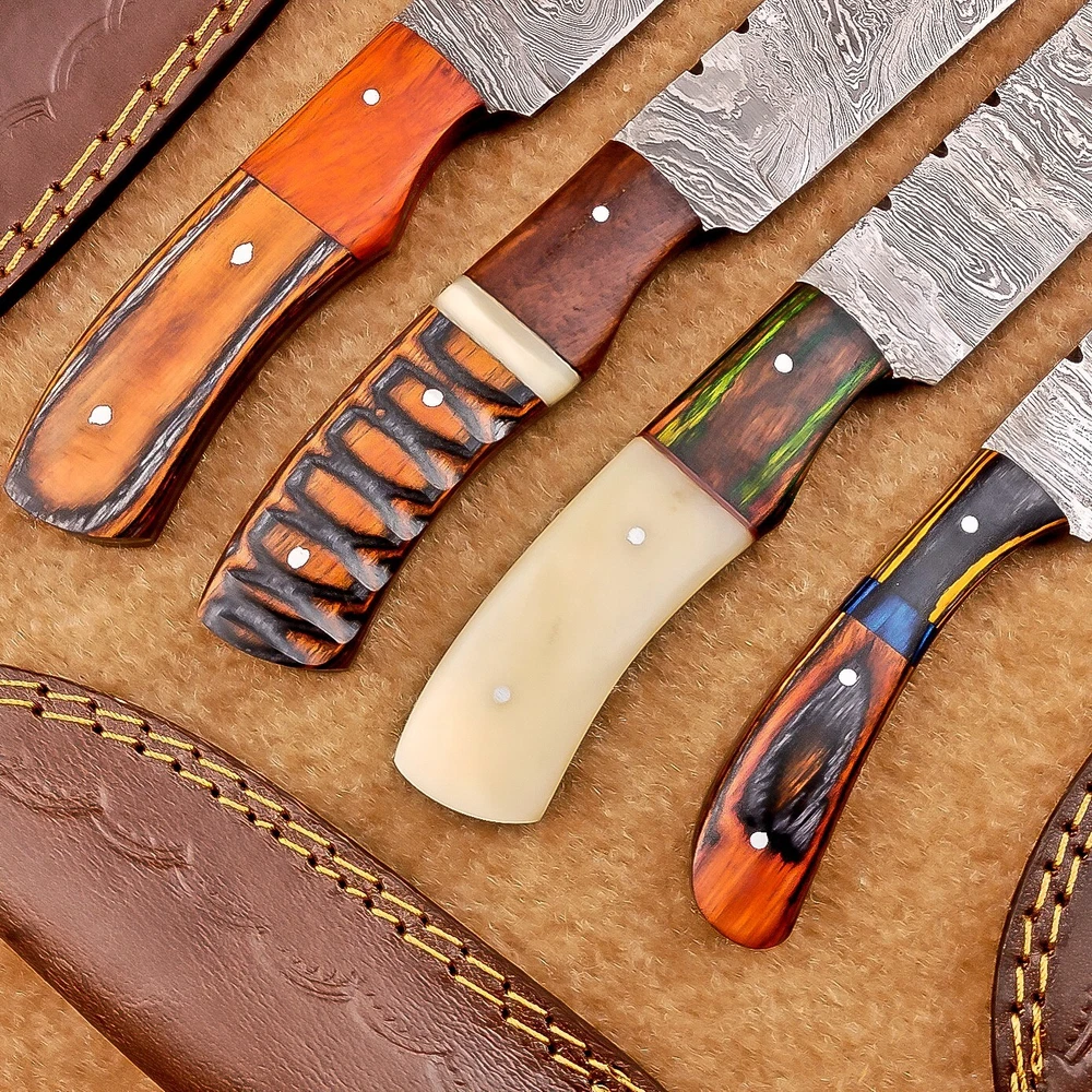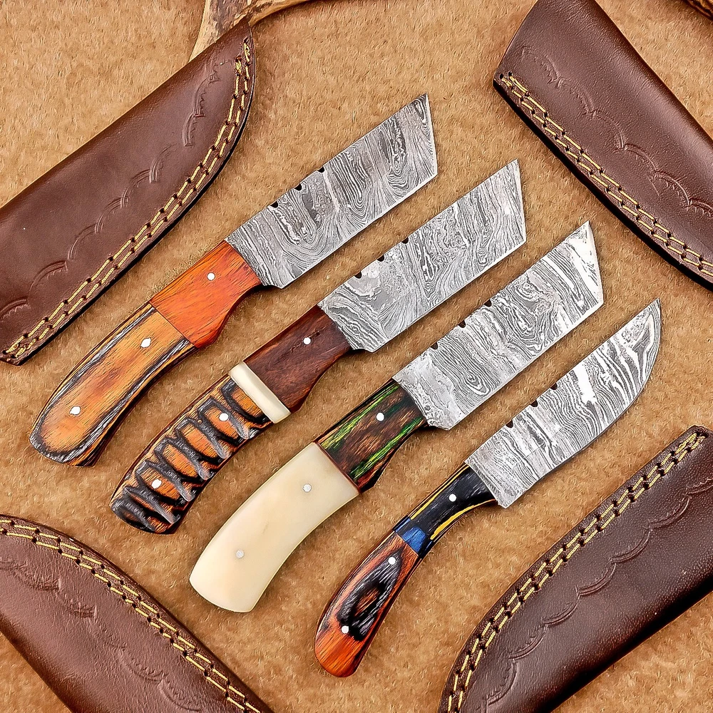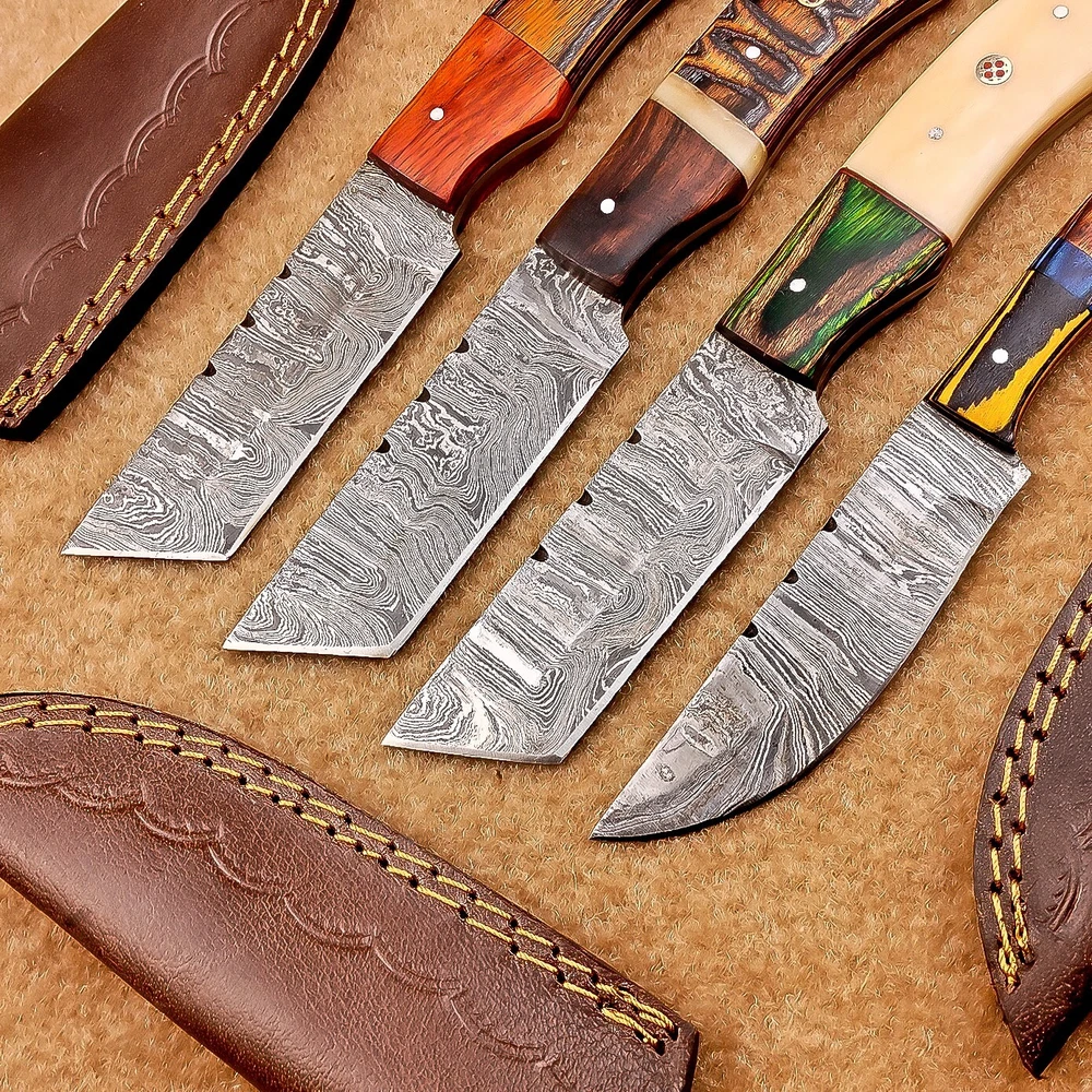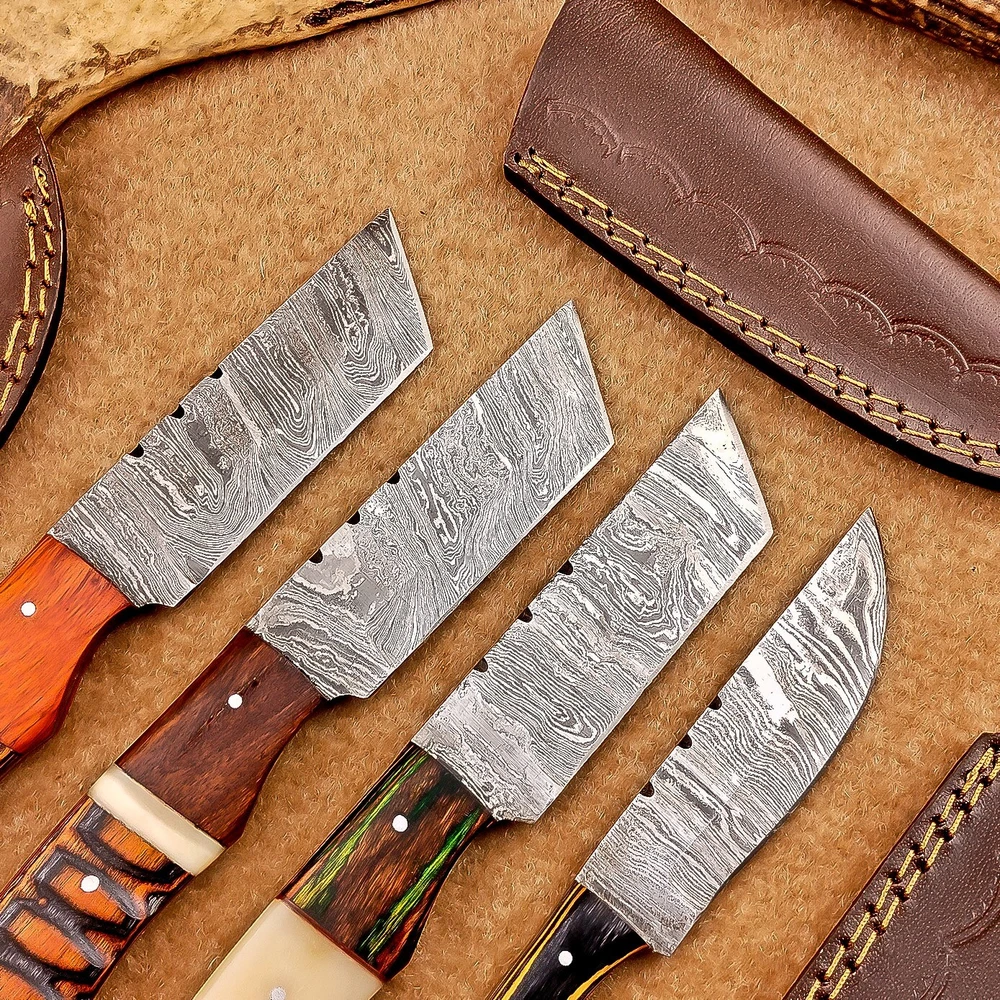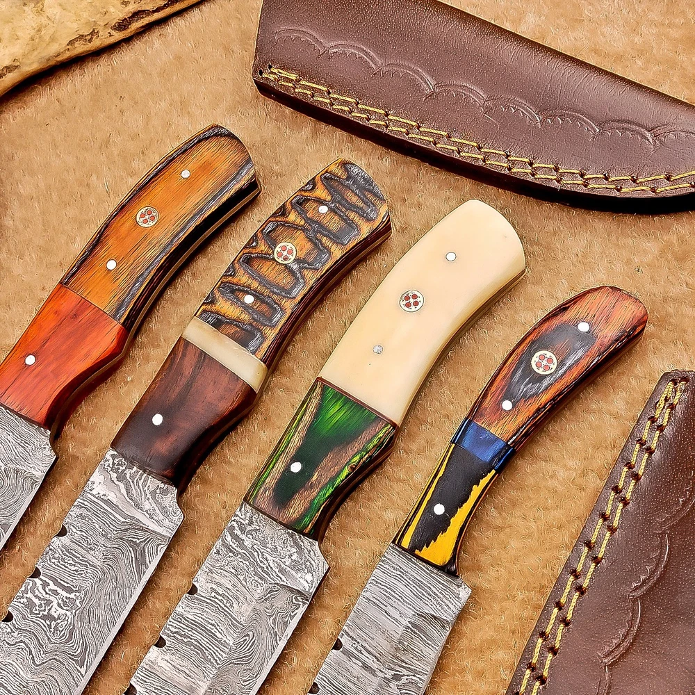 LOT OF 4 PCS! Handmade Damascus Hunting Knives , Skinner Knives Specifications: Overall Length: 8.0" Blade Thickness: ~4 mm Blade Material: Damascus Steel Handle Material: Hard wood with brass pins mosaic pin Includes: Leather sheaths Blade Craftsmanship: Blades are made from 1095 & 15N20 High Carbon Tool Steel with over 256 layers and a hardness of 58-60 HRC for durability and sharpness. Spine of the blade tang has excellent fire work. Care Instructions: Sharpen with a Diamond Wet Stone at a 20-degree angle. Clean with soap and water, dry thoroughly, and apply gun oil. Store away from the sheath to prevent rust. Important Notes for Buyers: Verify your country’s import regulations before purchase. Customs duties, if any, are the buyer’s responsibility. Shipping & Returns: Free shipping included. 14-day return policy applies. Contact Us: Message us anytime. We respond within 24 hours.