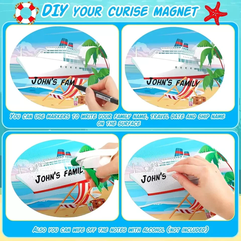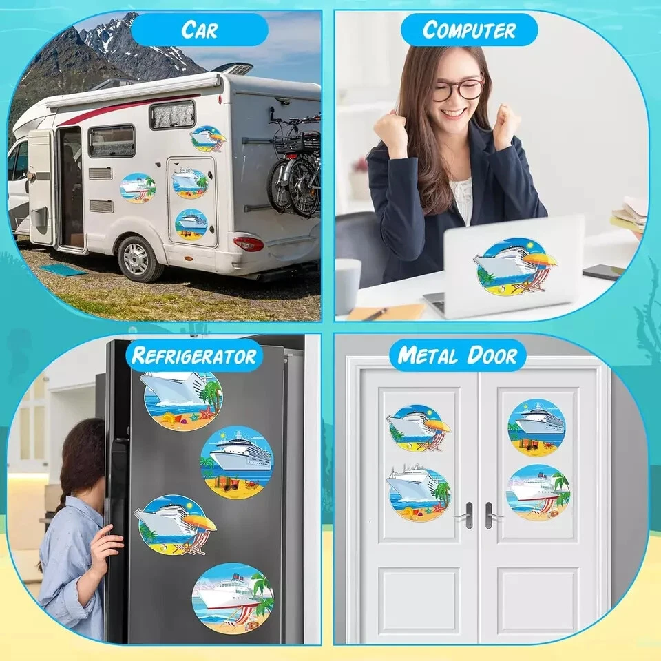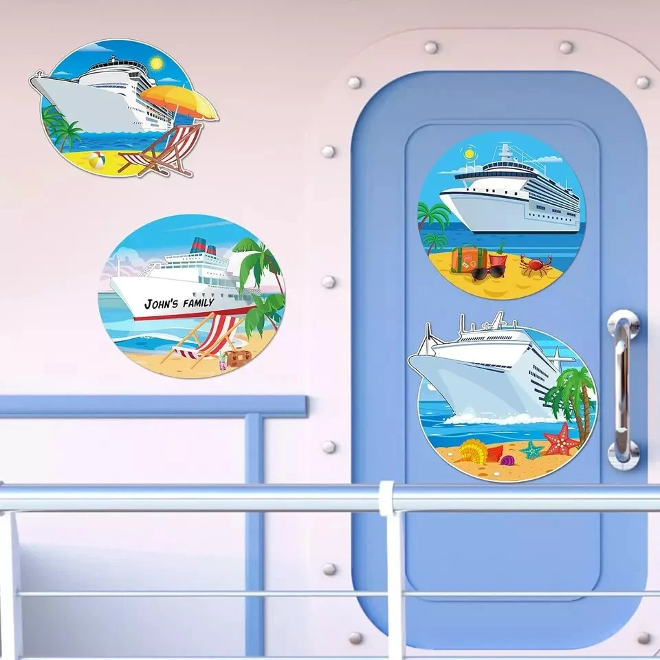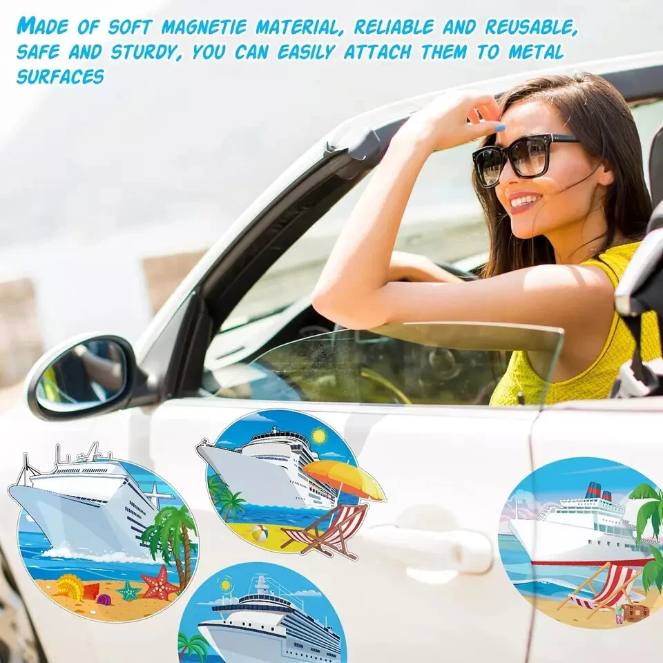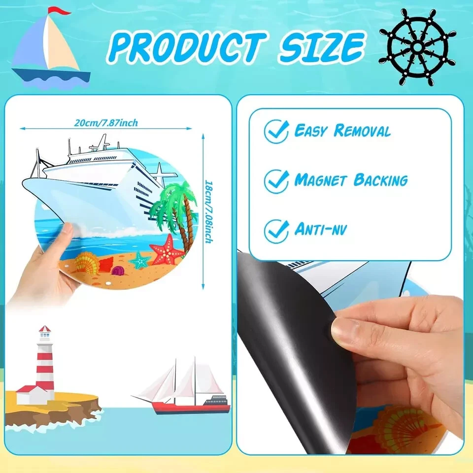 4 Pcs Large Cruise Door Magnets Funny Cruise Ship Door Magnet Stickers with 2 Pcs Marker Pens Beach Ship Magnets Magnetic Cruise Door Decorations for Cars Refrigerator Cruise Cabin(Summer Style) Description Item model number JF-Yexiya-2109 Unit Count 4.0 Count Style Summer Style Color [Image_analysis_required] Material Polyvinyl Chloride (PVC) Item Weight 5.5 ounces Batteries required No Shape Tree Package Dimensions 9.69 x 8.43 x 0.75 inches Size Large What You Will Get: this package comes with 4 pieces of cruise door magnets and 2 pieces of marker pens, this combination is nice to meet your cruise door decoration needs, you can also share them with others DIY Your Own Cruise Door: you can use the markers to write your name, or family cruise number on the magnets for cruise door, and the oil based markers can be wiped down easily and won't leave marks Decorate with Confidence: the cruise door decorations are made of quality PVC material with magnetic performance, reliable and solid, will not easy to break or fade; And the cruise door magnets can be stick tightly to the magnetic surface, will not falling down easily Size Details: there are 4 sizes of the cruise magnets for door decoration, namely approx. 7.87 x 7.09 inches/ 20 x 18 cm, 7.87 x 6.89 inches/ 20 x 17.5 cm, 7.87 x 5.71 inches/ 20 x 14.5 cm and 7.09 x 7.09 inches/ 18 x 18 cm, the large size makes them easily be noticed when guests come to visit you, and leave a deeper impression on others Versatile Decorative Applications: you can apply the carnival cruise magnet to decorate the cruise door, you can also use it to decorate the large ship, yacht, car, fridge, laptop and other magnetic surfaces; These cruise door magnets are suitable for decorating the cruise themed party, summer themed party or beach themed party