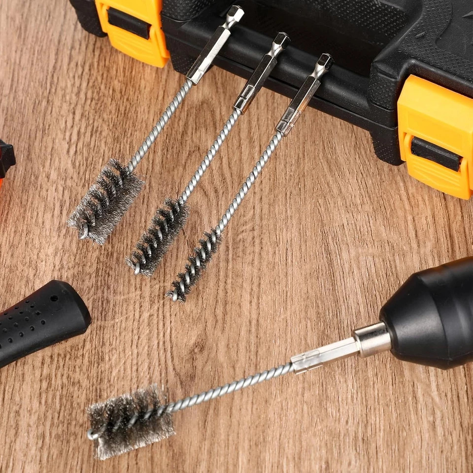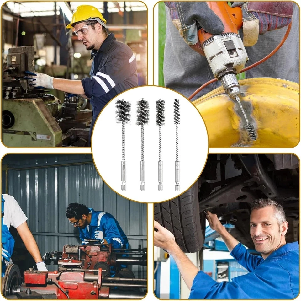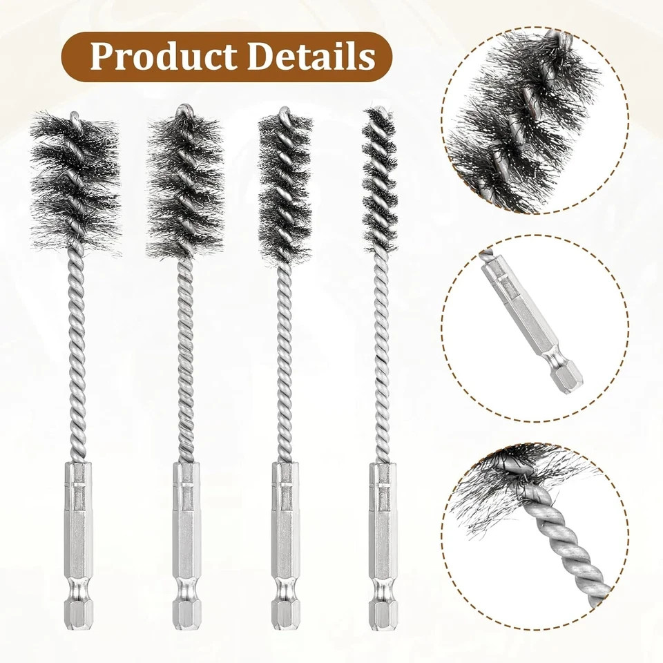 About this item Comprehensive Package: This set includes 4 pcs stainless steel wire brushes for drills, perfect for polishing, paint removal, and rust removal. These brushes are designed to meet all your daily cleaning and replacement needs. About Material: Made from quality stainless steel, the drill brush attachment are strong, durable, and long-lasting. They effectively remove rust and other fine details. Versatile Sizes: The set features drill brushes in 4 different sizes (3/8'', 1/2'', 3/4'', 7/8''), allowing you to clean even the most challenging areas, providing high cleanliness levels with power tools. Easy to Use: The double spiral of straight wire fill material, combined with fine stainless steel wires and a hex shank, makes cleaning tasks easy and fast. This innovative design ensures high levels of cleanliness while reducing the effort required. Wide Range of Applications: These stainless steel bore brushes are suitable for cleaning automotive parts, machinery, and fabrication surfaces. They fit conveniently with power drills, impact drivers, and die grinders.