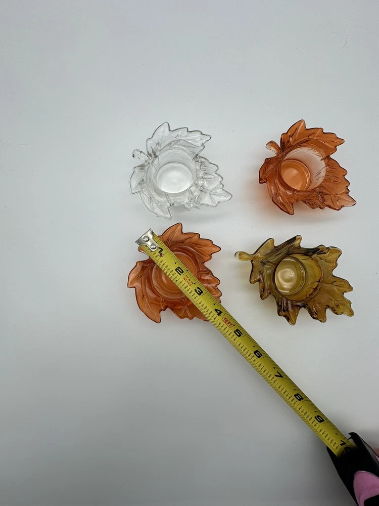 Add a touch of autumnal charm to your home with this set of four glass candle holders, perfect for tea lights. Get ready to elevate your home decor with these stylish and versatile candle holders. Please look at photos for condition. On the clear leaf there is two small flea bites as shown in photos. In good used condition.