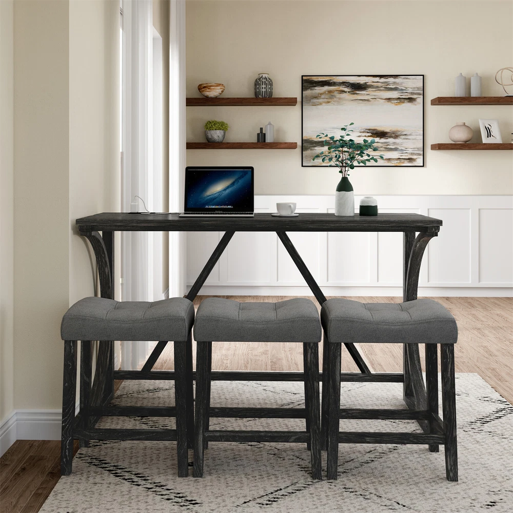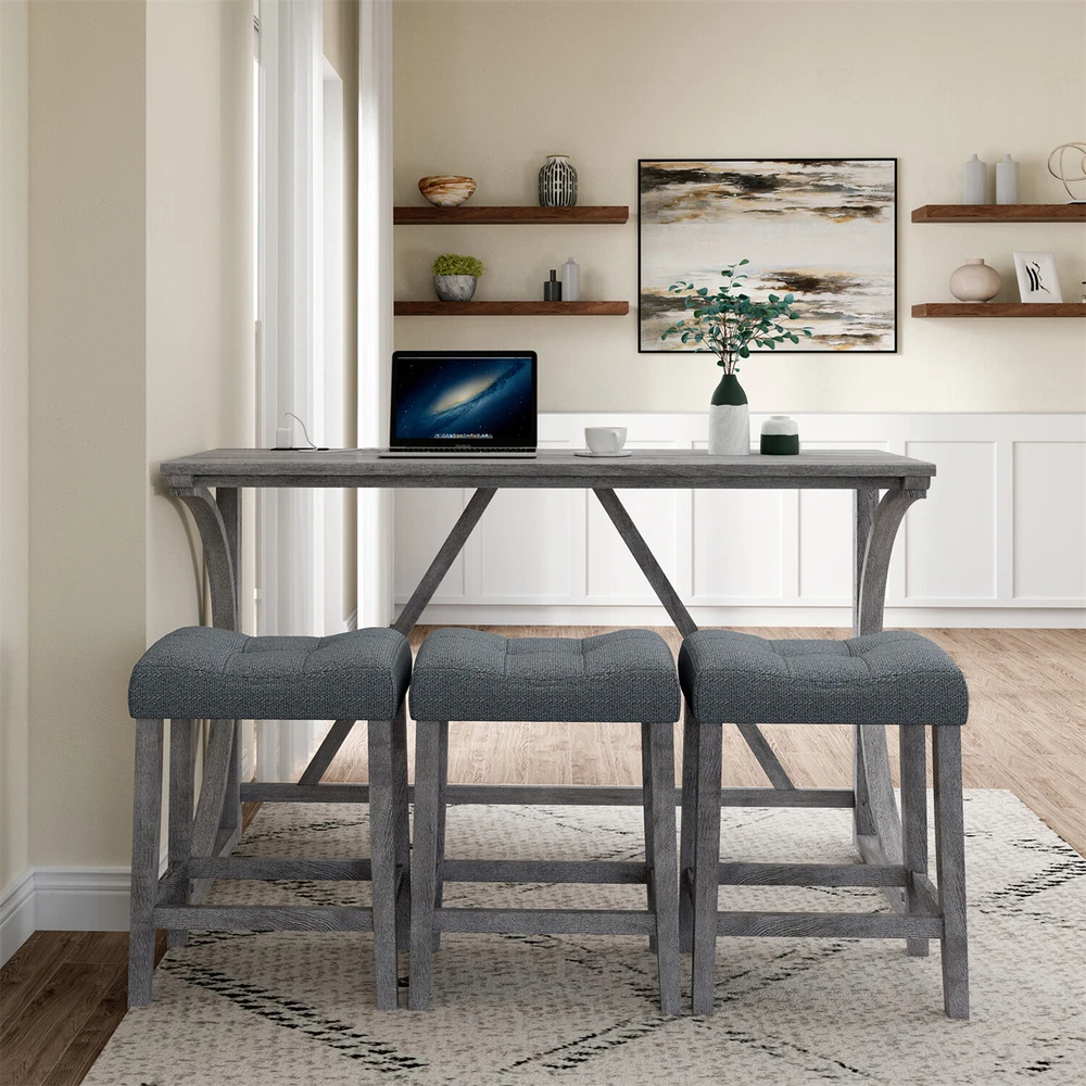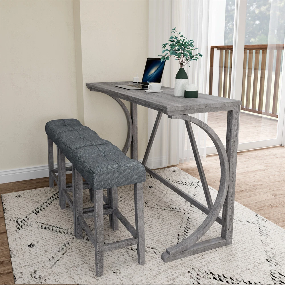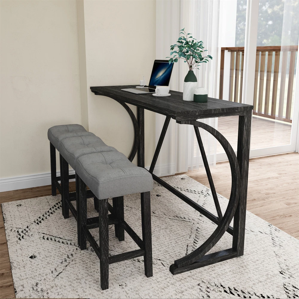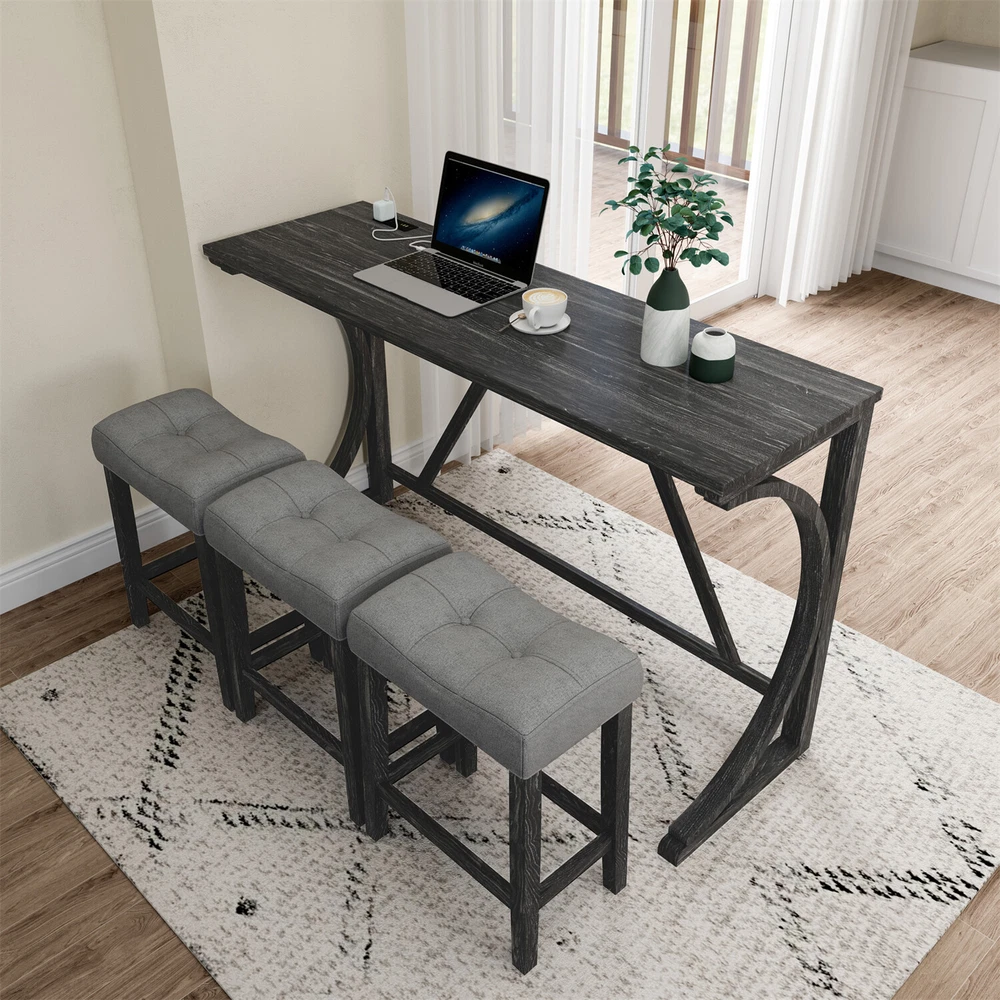 Description Product Features 1.Exquisite appearance:Industrial dining table: This bar table and chair features a high-quality imitation wood grain surface, making it an excellent addition to your kitchen, gaming room, or living room. Space saving and perfect fit: Three 18 "long x 11" wide x 24 "high bar stools can fit perfectly under the table when not in use, maximizing space while maintaining aesthetics. Foot mats not only increase stability but also prevent floor scratches. 2.Ergonomic stools and durable materials: The stools are equipped with Tactile soft fabric and curved cushions, providing comfort and relaxation even when sitting for a long time. Made of high quality MDF and high elasticity foam. In addition, solid wood and PVC veneers have scratch resistance and are easy to clean. 3.Easy to assemble: All hardwares and accessories are provided. It comes with easy-to-follow instructions. 4.Package design:The ISTA 3A packaging standard has undergone rigorous drop testing and detection, greatly avoiding the risk of product damage during later transportation Product details Table Product Size 59"*19"*36"H Inch Table material Table top:MDF Table leg:plywood+rubber wood Chair Product Size 18"*11"*24"H Inch Chair material Solid wood+High resilience foam+Linen Total net weight 70.4 Lbs Total gross weight 82 .06Lbs Notice 1. Due to lighting or monitor display, the color of the actual product may be slightly different from the image. 2. Manual measurement is used, there may be some reasonable errors. Package Includes: 1 x Bar Table 3 x Bar Stools Note: Please allow ±1/0.5'' error due to manual measurement. When viewing the color of the product on your monitor, it may differ from the actual color of the item.