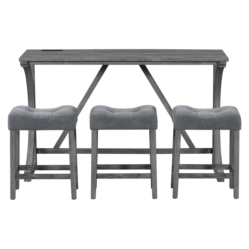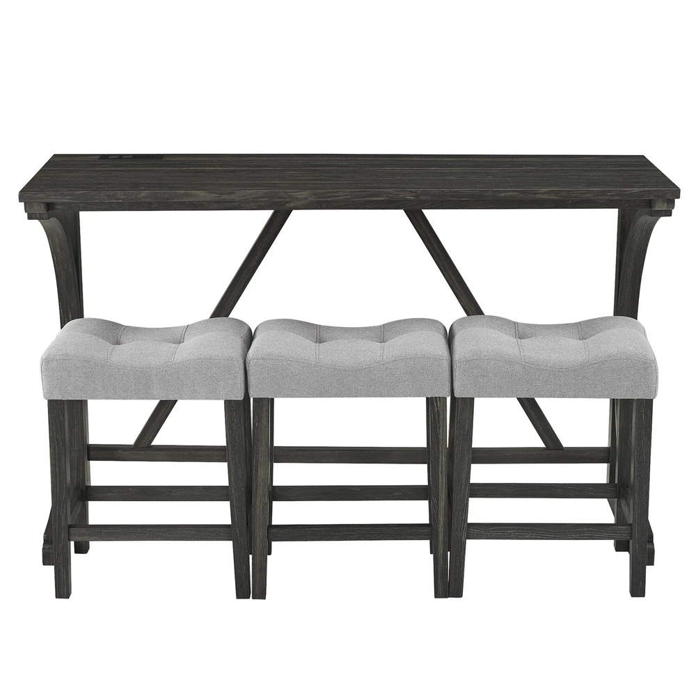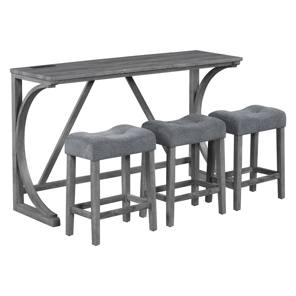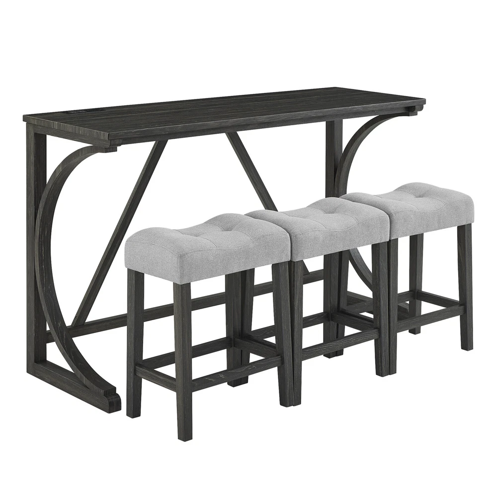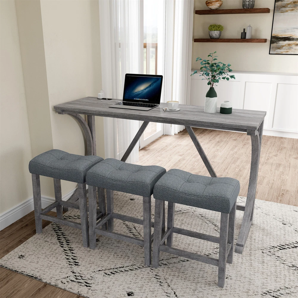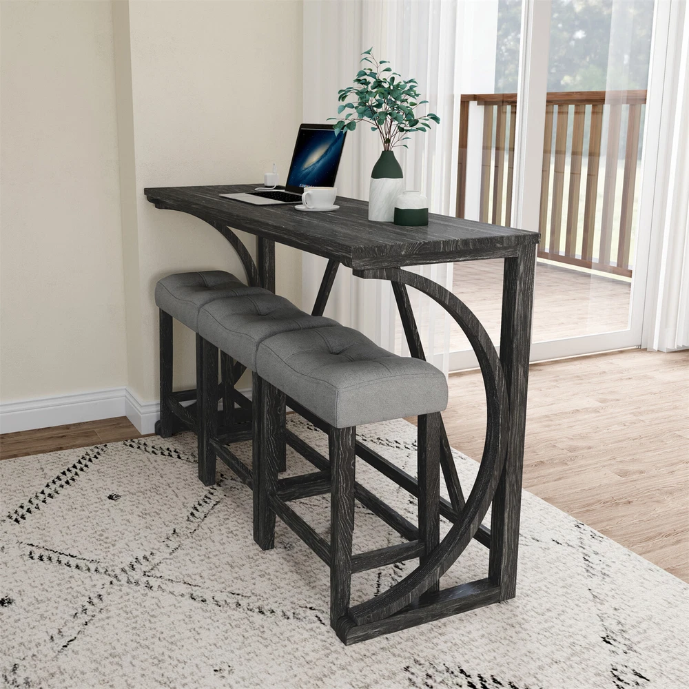Description Product Features 1.Exquisite appearance:Industrial dining table: This bar table and chair features a high-quality imitation wood grain surface, making it an excellent addition to your kitchen, gaming room, or living room. Space saving and perfect fit: Three 18 "long x 11" wide x 24 "high bar stools can fit perfectly under the table when not in use, maximizing space while maintaining aesthetics. Foot mats not only increase stability but also prevent floor scratches. 2.Ergonomic stools and durable materials: The stools are equipped with Tactile soft fabric and curved cushions, providing comfort and relaxation even when sitting for a long time. Made of high quality MDF and high elasticity foam. In addition, solid wood and PVC veneers have scratch resistance and are easy to clean. 3.Easy to assemble: All hardwares and accessories are provided. It comes with easy-to-follow instructions. 4.Package design:The ISTA 3A packaging standard has undergone rigorous drop testing and detection, greatly avoiding the risk of product damage during later transportation Product details Table Product Size 59"*19"*36"H Inch Table material Table top:MDF Table leg:plywood+rubber wood Chair Product Size 18"*11"*24"H Inch Chair material Solid wood+High resilience foam+Linen Total net weight 70.4 Lbs Total gross weight 82 .06Lbs Notice 1. Due to lighting or monitor display, the color of the actual product may be slightly different from the image. 2. Manual measurement is used, there may be some reasonable errors. Package Includes: 1 x Bar Table 3 x Bar Stools Note: Please allow ±1/0.5'' error due to manual measurement. When viewing the color of the product on your monitor, it may differ from the actual color of the item.