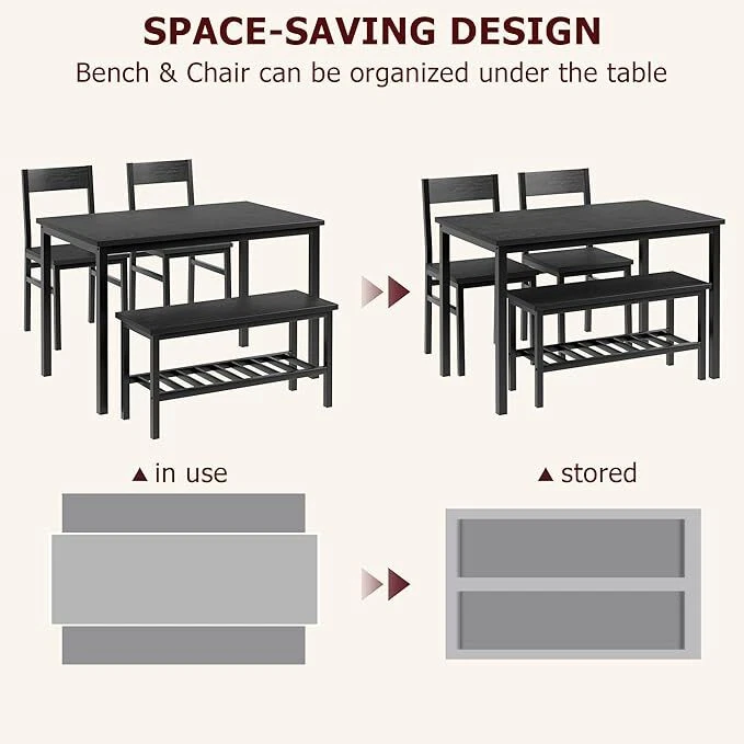4 Piece Dining Room Table with Storage Rack for Small Spaces Bench and Chairs Extra Storage Space: The dining table set features a storage shelf beneath the bench, providing additional space for your daily necessities and helping to keep your dining area organized Exceptional Craftsmanship: Constructed from P2-grade PB board and a heavy-duty metal frame, this kitchen table set ensures superior stability and durability. The powder-coated iron surface enhances its resistance to rust and wear Space-Saving Design: This table set includes a dining table, two chairs, and a bench. You can effortlessly tuck the chairs and bench underneath the table after meals to save space in your dining area Multifunctional Use: Suitable for any occasion, this kitchen table chairs set of 4 is not only ideal for meals but also serves as a computer desk, office desk, or writing table, making it an excellent addition to your home Easy Assembly: The dining table with bench come with detailed installation instructions and a toolkit, ensuring a hassle-free setup so you can enjoy your new kitchen table set in no time Payment Delivery Returns Feedback We accept Payoneer only. All major credit cards are accepted through secure payment processor PayPal. Payment must be received within 7 business days of auction closing. If you have bought multiple items from me, you can send me one payment for all the items instead of paying for them individually. When you click the Pay Now button, eBay will automatically determine if there are other items you have won or purchased from me and will combine them for your review. NOTE: Import duties, taxes and chargers are not included in the item price or shipping charges. These charges are the buyer's responsibility. Please check with your country's customs office to determine what these additional costs will be prior to bidding buying. 1. We will delivery out at the handing time when we receive the payment. 2. The delivery time is 3-5 business days to US by usually time.The parcel maybe delay 1-2day of the weekend.Due to the bad weather,Holidays,Hot Season ect.the parcel maybe delay,If you have any problems,mssage us,we will try our best to solve it. 3. We ship to your eBay address. Please make sure your eBay address is correct before you pay. 4. If you want to change the shipping address,message us before our send out. 5. We cannot deliver your order if your state is PR. 1. If you donot receive the items at the delivery time,the parcel has broken/missing,Please message us before you open case/return,we will try our best to solve it. 2. We offer a 30 day return policy from checkout winning date. 3. An RMA number is required for all returns. Message us for return instructions. Items Returned without a RMA number will not be processed. 4. Items defective upon receipt must be packaged in their retail packaging as if new and returned with a detailed description of the problem. 5. Return shipping fees are not refundable.We reserve the right to decline any returns if the above guidelines are not followed. If you are not satisfied with the item for any reason, please do not quick to leave negative/neutral feedback even open request and case without any communication with us. We devote ourselves making EVERY CUSTOMER in 100% Satisfactory and resolve any problem. Thank you for your understanding and recognition,we are always leave positive feedback to all our customers. About Reply: All replies will be sent to your email box, if you do not get response within 24 hours (Sat. & Sun. excluded) please check your eBay My Messages in case that our emails will be filtered automatically by your settings.