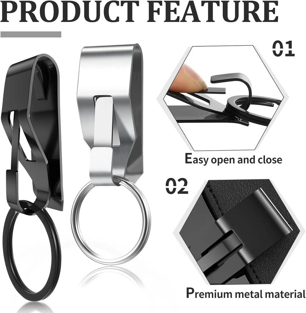 Product Description Durable Metallic Material Adopts sturdy and solid metal as material, hard to break or deform, anti rust and easy to clean. Unbending & Hard-scratch The loop of the keychain strap is detachable and can be opened with a gentle press without taking up much effort. Metal Clip Design The metal clip is convenient for you to clip the belt and remove, which is hard to fall off, no chance to loss your keys.