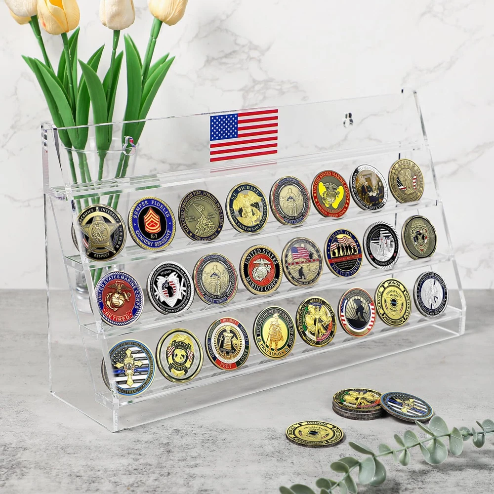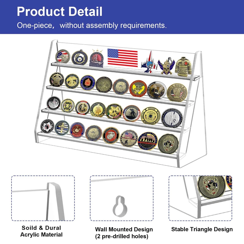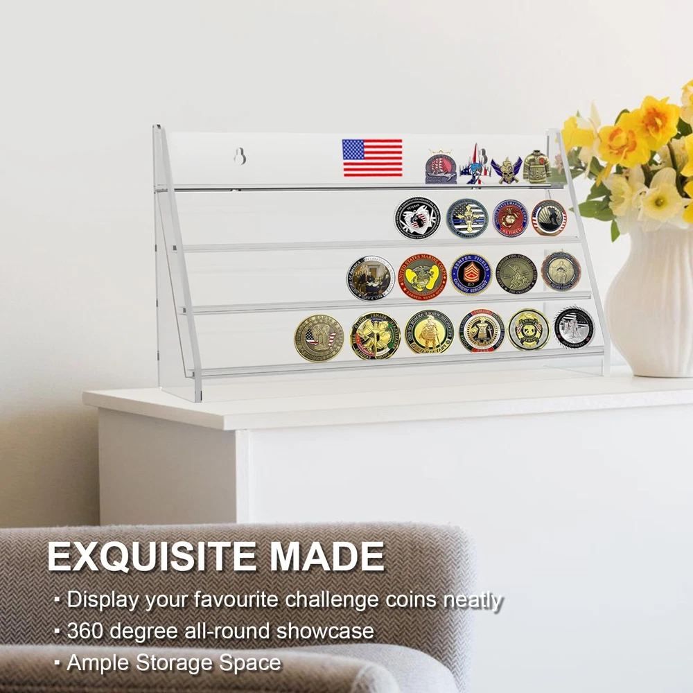 Coin Case Construction: Modern 4-tier challenge coin rake is made of sturdy & durable acrylic material. Premium quality, waterproof, don't worry about deformation, cracking and fading. Comes with one piece, no assembly required. Dimensions: 15.8"W X 9"H X 4.25”D. Coin Collection Holder Capacity: Ample storage to display, this challenge coin display stand can hold up to 32 Standard size challenge coins (Challenge coin not included). Built-in grooves on each shelf to secure the coins from sliding. Groove width is 0.15 inch, too thickness Coins would be not suitable. Coin Shelf Multipurpose Design: Stable triangle design, free standing-working perfectly on any desktop, tabletop or shelf. It can also be hung on the wall décor using the 2 pre-drilled holes (screws included). So you can choose different mode according to your needs and placed anywhere you want to display. Unique Memorial Gift: Designed for variety of any challenge coin like navy challenge coins, firefighter challenge coin, military coin, police challenge coins, medals, casino poker chips and equivalent sized collectibles. As a perfect choice for coin collectors, veterans, army as a housewarming, birthday, graduation, retirement, memorial, military gift. Honors should be treated with preciousness, the display case is particularly important. Quality guarantee and customer Service: highly value customers' satisfaction and tolerate zero quality issue. If you're not thrilled with its performance, please feel free contact us and let us know.