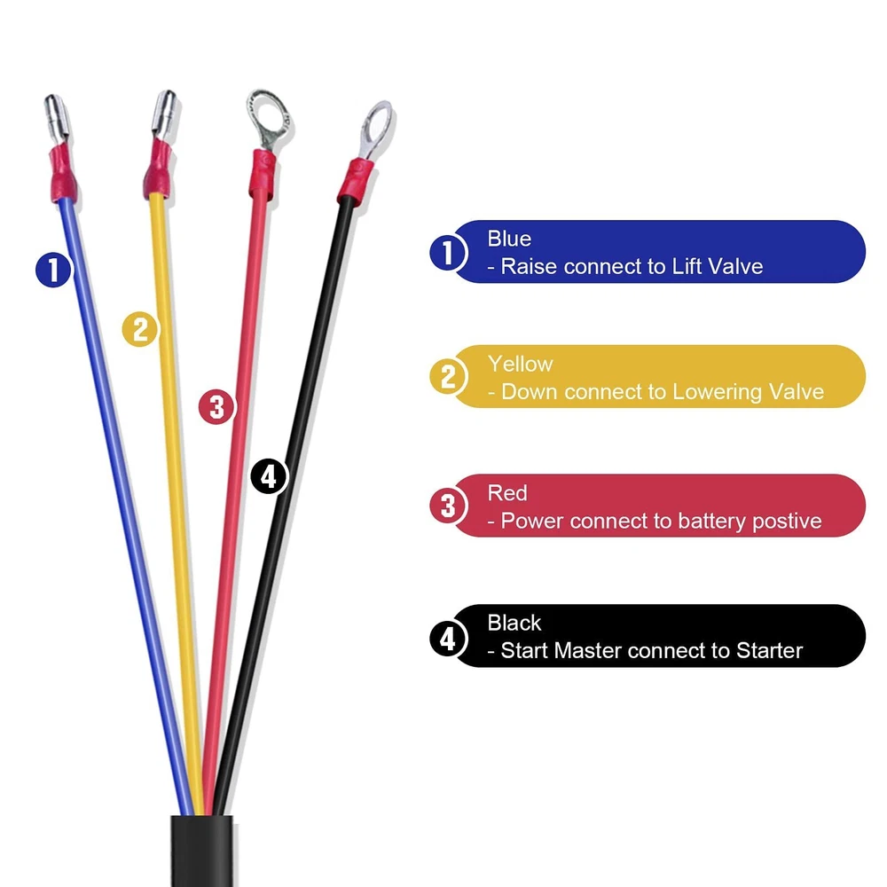 4 Wire Dump Trailer Remote Control Switch 12V DC fits Hydraulic Pump Power Supply Unit Pack Double Acting Dump Trailer Fit for Lift Unloading Our hydraulic power unit remote controller are responsibly made with high quality Eco-materials, first choice for your hydraulic dump trailer, lift gate, lifter, stackers truck! Technical Parameters: *Model:4 Wire *Material: High Quality ABS *Color: Yellow + Black *Style: Switch of Dump Trailer *Wire : 15' Cord for Long Reach *Buttons: Two Button, Up and Down *Package Weight: 2.23 Pounds *Application: Universal for most double acting hydraulic power unit, dump trailer, dump truck, lift gates, elevator lifter, stackers truck, hoist crane. Product Features: *This great little 2-button pendant control is most commonly used as a dump trailer remote. *It's built of a high-impact, highly visible plastic with a standard 15' cord. Powered by 12V DC *Made of high impact resistant plastic and magnetic material, for convenient and long-term use. Wiring Method : -Red - Power (to Battery) -Blue - Raise (to Lift Valve) -Yellow - Down (to Lowering Valve) -Black - Start Master(to Starter) Package Include: Mounting Holster + Convenient Magnetic Back + 4 Wires(You Can Contact Us When You Have Problems On Use) Affordable / Good Value: 1/4 of the price from the dealer. Just as good and easy to install according to the wiring diagram. You will save about 80 dollars. Sensitive Reaction / Up and Down: Powered by 12V DC, the high-quality internal components of the remote control have good conductivity, making it more sensitive in use. With the perfect cooperation of the remote control, the dump trailer will start quickly and reliably, tackle massive works with high efficiency. Waterproof: The wire is two layers of the high-quality protective cover around (polyethylene and PVC), effectively waterproof. Please connect the detachable cable well and protect the remote switch in wet conditions. Long Cord: With a standard 15' cord, You can stand at the back of your dump trailer while dumping the load, which is more secure and handy enough. The thickness of this dump trailer remote control wire is 0.31inch, it is durable. Wide Application: The remote control switch works perfectly with double acting hydraulic pumps. Fit for dump Trailer, liftgate, straight box truck, dump bed, lift platform, and auto-gate, etc.