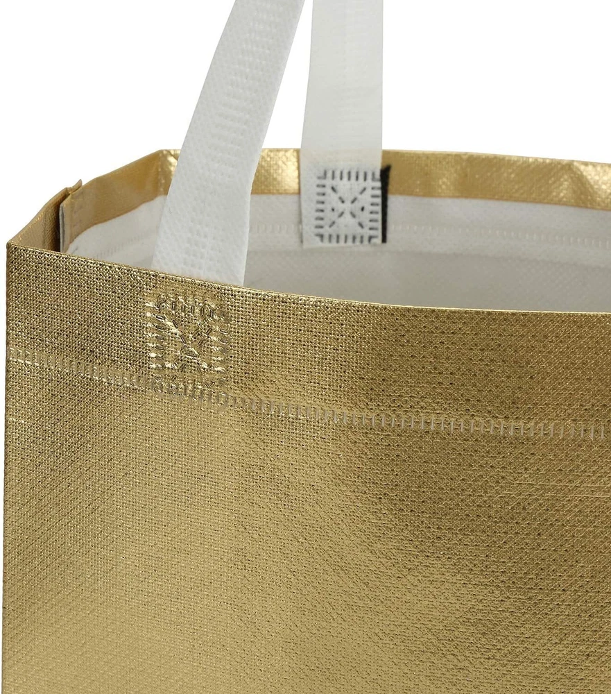 40 Pack 10 x 8 Inch Glossy Gold Reusable Grocery Bags Shopping Tote Bag with Handle Present Bag Gift Bag for Weddings, Birthdays, Party, Event - Gold Click the brand name around the product name to find more good items in ! Value pack 40 pieces bags in gold color. Each measures 10” x 8” x 4-3/4”; Handle is about 5-1/2” long. Made of environmental friendly non-woven fabric with gold laser printing, reusable and durable for daily use. Features comfortable handles for easy carry and waterproof surface for better protect your goods inside. Heavy duty and big enough size for you pack whatever you want. Folds easily for space saving storage when not in use. Perfect bags for shopping, grocery, travel, storage and practical for daily use, also great for giveaway favors packing for weddings, birthdays, Christmas, parties or any other events. Value pack 40 pieces bags in gold color. Each measures 10" x 8" x 4.75"; Handle is about 5.5" long Made of premium quality non-woven fabric with glossy laser printing, reusable and durable for daily use. Features comfortable handles for easy carry and waterproof surface for better protect your goods inside Heavy duty and big enough size for you pack whatever you want; Folds easily for space saving storage when not in use Perfect bags for shopping, grocery, travel, storage and practical for daily use, also great for giveaway favors packing for weddings, birthdays, Christmas, parties or any other events