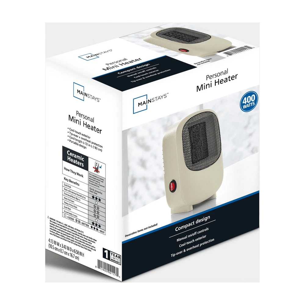 Mainstays Personal Mini Electric Ceramic Heater 400W,Space Heaters for Inside, Portable Electric Heater for Home , 400W Mini Heater, PTC Ceramic Fast Safety Energy Efficient Heater for Office ,Bedroom. Compact 400W Ceramic Fan Space Heater, Portable Mini Desk Electric Warmer, Overheat & Tip-Over Protection, Low Noise Quiet Fast Heating. Experience enhanced comfort with Mainstays Mini Ceramic Heater. This item is a portable, energy-efficient solution that provides just the right amount of heat for you. Use this Mainstays heater anytime at home, at school or in the office. Designed with ceramic technology that provides fast, even heating, it only uses about 400 watts. This Mainstays electric heater has a modern, compact design that fits just about anywhere. Use it on or underneath desks, tables and work spaces. The overall look is sleek and streamlined, blending with most interiors. You can even choose between four colors to suit your personal taste and environment. Space Heater: Introducing the New Portable Out Compact 400W Space Heater, your ideal solution for bringing warmth to small spaces at home or in the office. Its compact design easily fits on desks or tables, perfect for personal heating needs. This heater quickly creates a cozy indoor environment, heating up in just 2 seconds, so you can enjoy warmth almost immediately. Desktop Space Heater: Wattage: 400W Heating method: Ceramic heating Working Condition Feature: Switched off automatically for overheat and tip-over Condition: New Features include: - Quick 2-second heat-up time for instant comfort. - Quiet operation, ensuring your peace and tranquility are undisturbed. - A safe and easy-to-use on/off switch for hassle-free operation. - Tilt safety switch, enhancing the safety by automatically turning off if tipped over. It's not just a heater; it's your personal comfort companion during the colder days Mainstays 400W Personal Electric Ceramic Mini Heater for Home,Indoor Use Only,New Experience enhanced comfort with Mainstays Mini Ceramic Heater. This item is a portable, energy-efficient solution that provides just the right amount of heat for you. It's a good choice for virtually all personal spaces, such as bedrooms, cubicles and more. Use this Mainstays heater anytime at home, at school or in the office. Designed with ceramic technology that provides fast, even heating, it only uses about 400 watts. This Mainstays electric heater has a modern, compact design that fits just about anywhere. Use it on or underneath desks, tables and work spaces. The overall look is sleek and streamlined, blending with most interiors. You can even choose between four colors to suit your personal taste and environment. PTC heating element Flame Resistant, Overheat Protection, Tip-Over Protection Fully assembled Condition: New