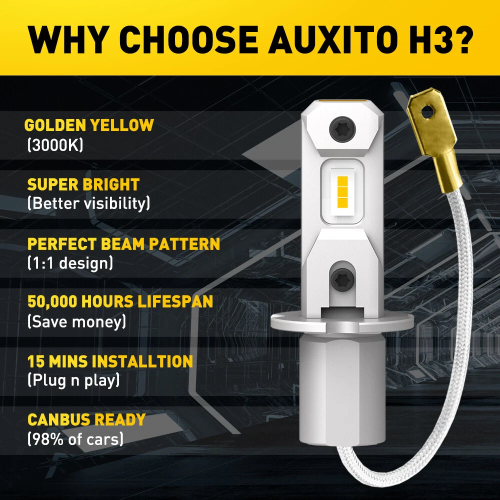 Specification: Socket : H3 Voltage: DC 9-18V Beam Angle: 360° Usage: Fog Light Lighting Color: Golden Yellow Color Temperature: 3000K Usage: Fog,DRL, etc. Suitable For General Bulb Model Fog Light Replacement High performance LED, long lifespan, superior illumination & stability Plug & play, No need to cut and wires. Faster on/off response time and vibration resistant AA LED Fog/Driving Light H3 Bulbs Bright Yellow 4000LM Bright Replacement 3000K Specification: Socket : H3 Voltage: DC 9-18V Beam Angle: 360° Usage: Fog Light Lighting Color: Golden Yellow Color Temperature: 3000K Usage: Fog,DRL, etc. Suitable For General Bulb Model Fog Light Replacement High performance LED, long lifespan, superior illumination & stability Plug & play, No need to cut and wires. Faster on/off response time and vibration resistant Features: 1. Small size, close to 1:1 with the original halogen lamp 2. Easy to install, Non-polar design 3. Good light type,Dual panel design, light source arrangement infinitely close to halogen lamp, light distribution distance 2mm, no dark area 4. Higher brightness,Twice as bright as the original car 5. EMC resists electromagnetic interference Package Included: 2X Led Bulbs Item Specifics UPC 782890728898 Brand AUXITO Type LED Fog Driving Light Bulb Number of Bulbs 2 Lighting Technology LED Light Color Golden Yellow Beam Angle 360~ Bulb Shape Code H3 Fitment Type Direct Replacement Lifetime >50,000 Hours To Fit Foglight Application Fog Driving Lights / Daytime Running Light DRL Housing Material All-aluminum Houing Wattage 30W/per bulb, 60W/per Set Color Temperature 3000K Voltage 12 V Lumens 2000LM/Bulb,Total 4000LM/Set Manufacturer Warranty 1 Year Lumens 2000LM/Bulb,Total 4000LM/Set Manufacturer Warranty 1 Year Payment Buyers can use a variety of payment methods such as credit, debit, and gift cards; Apple Pay, Google Pay, PayPal, and PayPal Credit etc. Shipping 1. All items will be shipped in 24 hours after receiving your payment . 2. We ship this item to US only via USPS first class mail. It usually takes 3-5 working days to deliver. Returns 1. We offer 60 days return policy. 2. Please contact us with emai first if you have any questions with our products . 3. Refund will be sent after we got your returned package. 4. All returned items should be in the original packaging with tracking number. Contact Us We work from Monday - Saturday 9:00AM - 6:00PM PM, but we will reply you once we get your message .There will be some delay on response if you send message or E-Mail on Sunday. DESCRIPTION PAYMENT SHIPPING RETURN POLICY CONTACT US AA LED Fog/Driving Light H3 Bulbs Bright Yellow 4000LM Bright Replacement 3000K Specification: Socket : H3 Voltage: DC 9-18V Beam Angle: 360° Usage: Fog Light Lighting Color: Golden Yellow Color Temperature: 3000K Usage: Fog,DRL, etc. Suitable For General Bulb Model Fog Light Replacement High performance LED, long lifespan, superior illumination & stability Plug & play, No need to cut and wires. Faster on/off response time and vibration resistant Features: 1. Small size, close to 1:1 with the original halogen lamp 2. Easy to install, Non-polar design 3. Good light type,Dual panel design, light source arrangement infinitely close to halogen lamp, light distribution distance 2mm, no dark area 4. Higher brightness,Twice as bright as the original car 5. EMC resists electromagnetic interference Package Included: 2X Led Bulbs Payment Shipping Returns Contact Us Buyers can use a variety of payment methods such as credit, debit, and gift cards; Apple Pay, Google Pay, PayPal, and PayPal Credit etc. 1. All items will be shipped in 24 hours after receiving your payment . 2. We ship this item to US only via USPS first class mail. It usually takes 3-5 working days to deliver. 1. We offer 60 days return policy. 2. Please contact us with emai first if you have any questions with our products . 3. Refund will be sent after we got your returned package. 4. All returned items should be in the original packaging with tracking number. We work from Monday - Saturday 9:00AM - 6:00PM PM, but we will reply you once we get your message .There will be some delay on response if you send message or E-Mail on Sunday. All rights reserved. On May 8, 2025 at 15:24:12 PDT, seller added the following information: