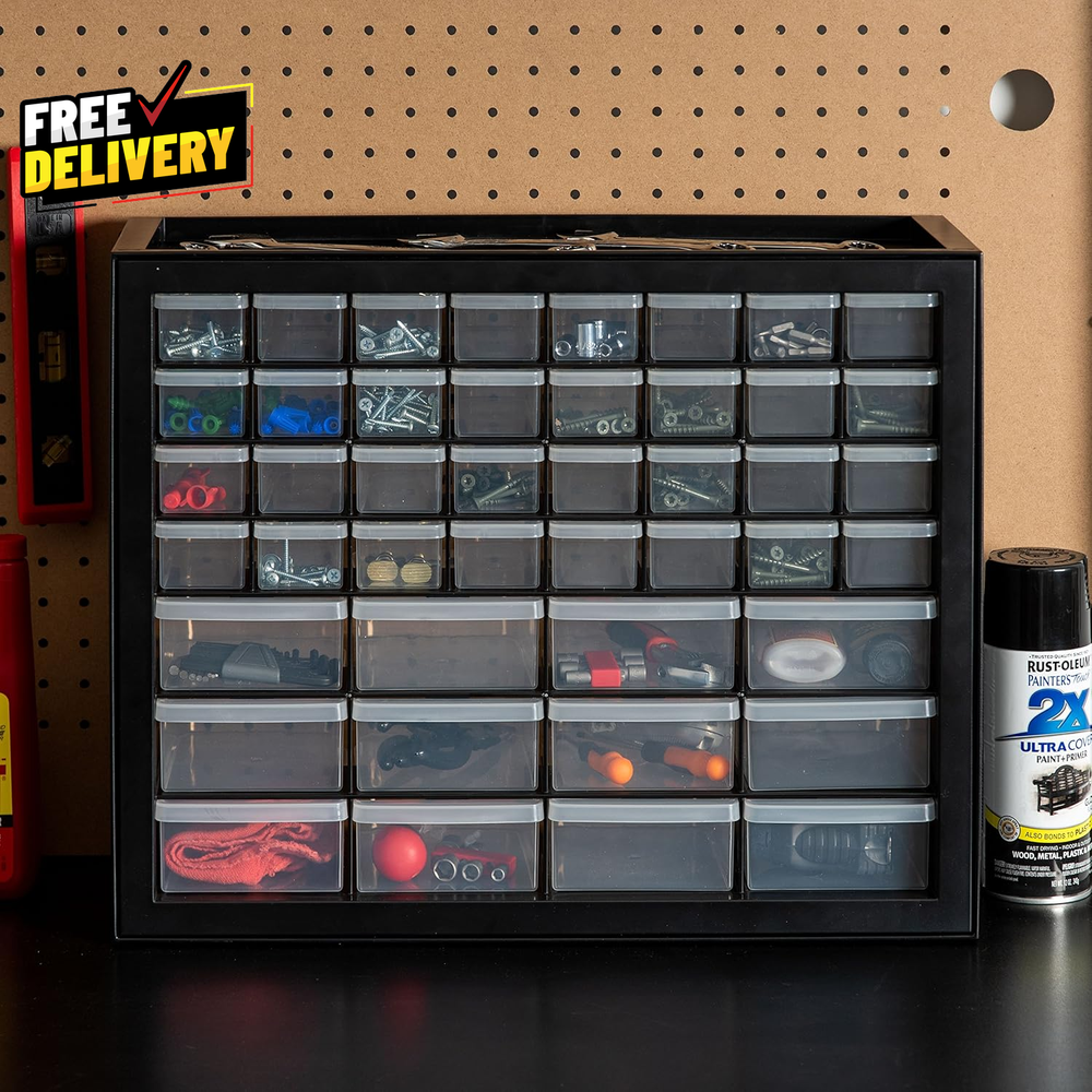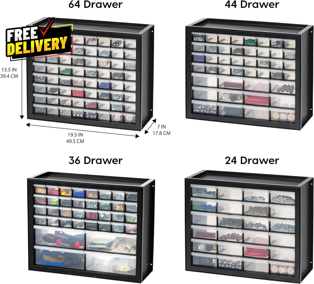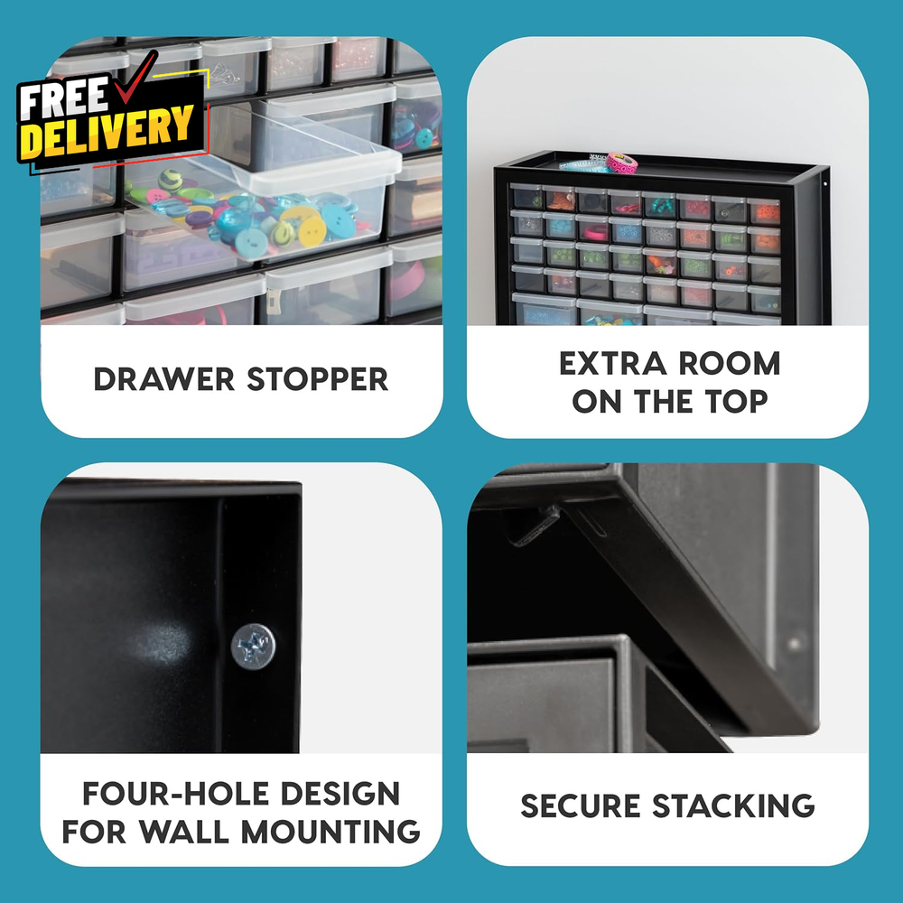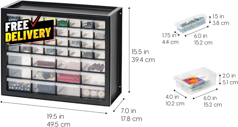ultimatesavvyshop New Arrivals Add to Favorite View Feedback Contact 44 Drawer Small Parts Storage Cabinet Screw Tool Organizer Stackable Black… ? PLEASE CONTACT US FIRST BEFORE TAKING ANY ACTION ? If you face any kind of issue , please reach out to us directly . Especially before leaving Negative Feedback, opening an “Item Not Received” case, or starting a Return . ? We are always happy to assist and resolve any problem quickly and professionally! If you have any questions or require assistance, please don’t hesitate to reach out. Description Item model number 587632 Pattern Cabinet Batteries Included? No Batteries Required? No Assembly Required No Material Plastic Installation Method wall mount Frame Material Plastic Number of Drawers 44 Is Discontinued By Manufacturer No Included Components Body, Drawers, Frame Item Package Quantity 1 Part Number 587632 Number Of Pieces 44 Assembly Instructions Description No assembly required. Maximum Weight Capacity 12 Pounds Special Features Stackable, Wall-mountable Item Weight 5.47 pounds Mounting Type Wall Mount, Floor Mount Color Black Global Trade Identification Number 00762016480039 Shape Rectangular Manufacturer , Inc. Product Dimensions 7"D x 19.5"W x 15.5"H Size 44 Drawer MULTI-PURPOSE ORGANIZER: Perfect storage solution tool to organize screws, hardware, small parts, nuts and bolts, stationery, office and classroom supplies, crafts, beads or sewing supplies, and fishing gear. STACK OR WALL MOUNT: The cabinet’s grooves on the lid securely lock in one on top of another when stacked. It can be wall-mounted and used to organize screws, hardware, tools, and small parts. MULTI-DRAWERS: Sort, store and organize screws, hardware, small parts, nails, and tools with these multi-drawers to identify and grab things easily and quickly. MADE IN USA: High-quality, recyclable materials are used for our domestically-manufactured products. The sturdy plastic makes these durable, and the smooth glide drawers give you easy access to contents. DIMENSION: 19.5”L X 7”W 15.5”H (Large drawer dimensions: 6”L x 4”W x 2”H; small drawer dimensions: 6”L x 1. 75”W x 1. 5”H). ABOUT US Prior to making any purchase from our store, we’d like to introduce ourselves. My name is Shahzad Yaqub , and I am the proud owner of Epic Emporium Deals , located in the great state of Illinois, USA. I have been an active and trusted eBay seller since Jan 14, 2025 . At Epic Emporium Deals , we are committed to offering competitive prices and top-quality products . Our extensive collection features a wide variety of items, including media such as books, movies, music, and games , as well as electronics, toys, sporting apparel, clothing, tools , and general home and garden essentials —and much more! Your satisfaction is our priority, and we look forward to providing you with an exceptional shopping experience. SHIPPING We are always working hard to ensure your package arrives as soon as possible. Please understand that some factors like weather, high postal traffic, and the performance of shipping companies are outside of our control. We offer free shipping to the lower 48 states and ship within 2 business days of payment, usually sooner. We do not accept P.O. Boxes. Please provide a physical address. For shipping outside of the continental USA, we only use eBay's Global Shipping Program. The item is shipped to IL and then sent to the rest of the world. International customers are responsible for all duties and taxes. Continue to 'check out' to calculate costs for shipping the item to your country. Messages regarding eBay's Global Shipping Program MUST be directed at eBay EXCLUSIVELY. RETURNS We do not accept returns under normal circumstances. However, we will gladly consider a return if the item is received broken or if the wrong size is sent to you. In all other cases, returns will not be accepted. CUSTOMER SATISFACTION We try our very best to make sure every customer is completely satisfied. If there's a problem, message us! We're happy to help.
