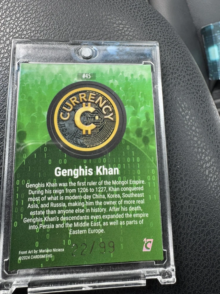 #45 Genghis Khan 22/99 Emerald Gemstone 2024 Cardsmiths Currency Series 3. Condition is Ungraded. Shipped with USPS Ground Advantage.