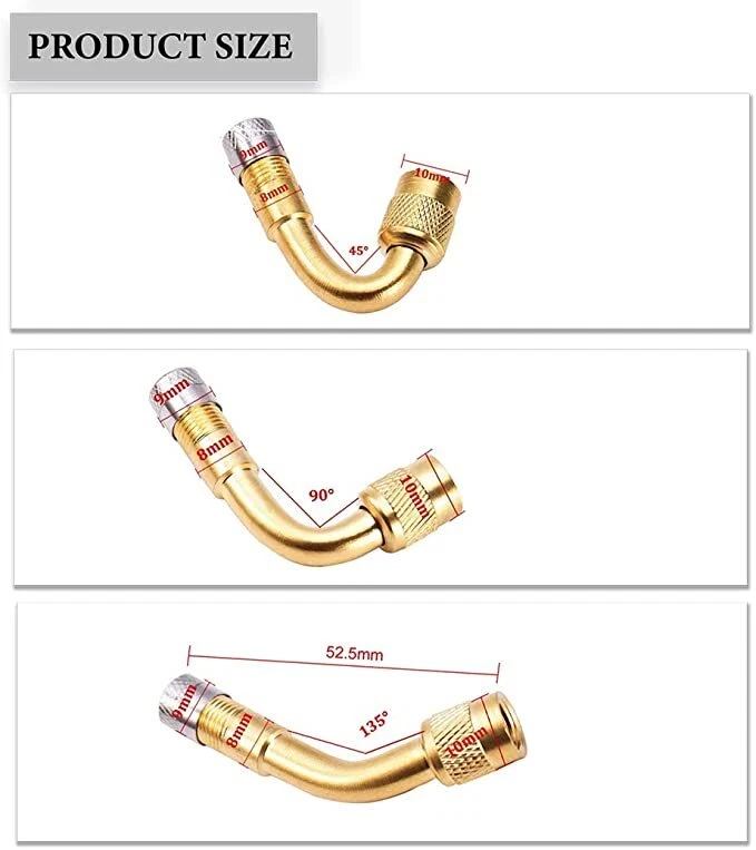 3pcs 45/90/135 Degree Angle Brass Air Tyre Valve Schrader Valve Stem With Extension Adapter for Auto Truck Motorcycle Car Accesspries Specification: Colour: Gold Material: Anti-corrosion Metal Dust Cap Extension: 45/90/135 degree angle Quantity:3Pcs Size: As the picture shown Features: - Brand new & durable - Allows easy access for tyre maintenance. - Excellent sealing capacity. - With Metal dust cap. - Easy installation, just remove existing valve dust cap and screw on. - Allow inflation / deflation due to built-in valve core. Package Included: 3pcs x Tyre Valve Extension Note: 1. Please check the size measurement chart carefully before making payment. 2. Please allow 0.5-1 inch difference due to manual measurement.(1 inch=2.54cm) 3. The color of the actual items may slightly different from the listing images due to different computer screen, thanks for your understanding. 4. Instruction is not included. On May 5, 2024 at 06:33:51 PDT, seller added the following information: