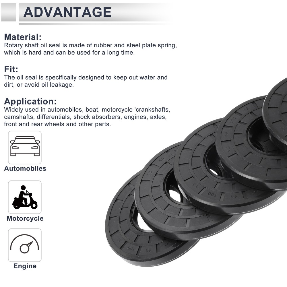 Document Features:The oil seal is specifically designed to keep out water and dirt or avoid oil leakage. Prevent dust into inside of the machine, and prevent lubricating oil from leaking.Rotary shaft oil seal is made of Nitrile Rubber and and steel plate spring which is water and oil resistance, heat resistant, good sealing, wear resistant, anti static. Durable and can be used for a long time.Widely used in automobiles, boat, motorcycle 'crankshafts, camshafts, differentials, shock absorbers, engines, axles, front and rear wheels and other parts.It is widely used in automotive sealing products, but it is not suitable for phosphate series hydraulic oils and gear oils with extreme additives.Specifications:Type:TC Double Lip w Steel SpringMaterial:Nitrile RubberInner Diameter:45mmOuter Diameter:100mmWidth:12mmInstallation:1. Clean the mounting surface, ensure that the mounting surface is clean; 2. Use the appropriate amount of lubricant, avoid too much or too little;3. Ensure that the installation of the oil seal is oriented correctly, with the lips facing the rotating shaft; 4. Avoid over-tightening during installation to avoid damaging the oil seal.Package includes:5 TC Double Lip w Steel Spring Oil SealNote:Please check the dimension of the product for consistency before purchasing.Regularly check the sealing effect of oil seals and replace damaged oil seals in time. Shop Category New Arrival Hot Item Oil Seal Seal Ring Rotary Shaft Seal Nitrile Rubber 45x100x12mm Black 5 Pcs Features: The oil seal is specifically designed to keep out water and dirt or avoid oil leakage. Prevent dust into inside of the machine, and prevent lubricating oil from leaking. Rotary shaft oil seal is made of Nitrile Rubber and and steel plate spring which is water and oil resistance, heat resistant, good sealing, wear resistant, anti static. Durable and can be used for a long time. Widely used in automobiles, boat, motorcycle 'crankshafts, camshafts, differentials, shock absorbers, engines, axles, front and rear wheels and other parts. It is widely used in automotive sealing products, but it is not suitable for phosphate series hydraulic oils and gear oils with extreme additives. Specifications: Type:TC Double Lip w Steel Spring Material:Nitrile Rubber Inner Diameter:45mm Outer Diameter:100mm Width:12mm Installation: 1. Clean the mounting surface, ensure that the mounting surface is clean; 2. Use the appropriate amount of lubricant, avoid too much or too little; 3. Ensure that the installation of the oil seal is oriented correctly, with the lips facing the rotating shaft; 4. Avoid over-tightening during installation to avoid damaging the oil seal. Package includes: 5 TC Double Lip w Steel Spring Oil Seal Note: Please check the dimension of the product for consistency before purchasing.Regularly check the sealing effect of oil seals and replace damaged oil seals in time. Item Specifics Brand X AUTOHAUX Material Nitrile Rubber Type TC Double Lip w Steel Spring Oil Seal Manufacturer Part Number Does Not Apply Product Name TC Double Lip w Steel Spring Oil Seal Net Weight 435g Shell Color Black Interchange Part Number Does Not Apply Other Part Number Does Not Apply Dimension 45x100x12mm Package Content 5 Pcs Oil Seal Note This is not oem product,accessory only. MPN Does Not Apply upc 678202515716 Universal Fitment Yes You Should Know If you have any questions, please feel free to contact our customer service. Our response will be faster than eBay! Our Handling Time: within 24 hours on weekdays eBay Handling Time: 72 hours About Us Shipping Feedback Payment Contact Us Angstrom Autohaus is based in Hong Kong, our group comprises factories in Asia that manufacture OEM and aftermarket automotive parts and accessories. We believe in FACTORY DIRECT purchases. Our mission is to deliver Lower Prices and Better Quality to consumers and distributors wherever, whenever. We operate from a distribution center in Hong Kong, where we perform sourcing, quality control and fulfillment. We strive to ensure that our products are reliable, updated and that our transactions are smooth and speedy. We are positioned to bring you the latest consumer automotive aftermarket parts and accessories globally and round the clock. We are proud to have served over 500,000 ebay buyers worldwide. International Buyers - Please Note: Import duties, taxes and charges are not included in the item price or shipping charges. Buyers are responsible for these charges. Please check with your country's customs office to determine what these additional costs will be prior to bidding/buying. Note that delivery times may vary, particularly during peak periods or inclimate weather conditions. All items will be dispatched from our warehouse in China or Hong Kong directly. Due to Custom restrictions, we do not ship lighters to US We cannot ship on weekends and we do not offer Saturday, Sunday or holiday delivery. All our items will be shipped to buyer's PayPal address, please confirm your address on PayPal before you bid. We left positive feedback for you after receiving payment. Your feedback is very important for us, positive feedback and 5 Score DSR is highly appreciated. Please let us know before leaving any negative feedback or 1 point, 2 point low DSR or open any disputes on Paypal and Ebay, please give us the opportunity to resolve any problems and we will try our best to satisfy your needs. If any question, please feel free to contact us via 'Ask seller a question' ,We try our best to reply to your emails as soon as possible, due to high volume of daily incoming emails and time zone difference, we may not be able to reply your emails immediately.Please allow 1-2 business days for us to response. Payment Methods: We accept eBay payment. We appreciate prompt payment and look forward to your business in the future. Unpaid item will be filed without receiving payment in 7 days from listing ended. Contact Us Please email us to resolve any problem before you leave