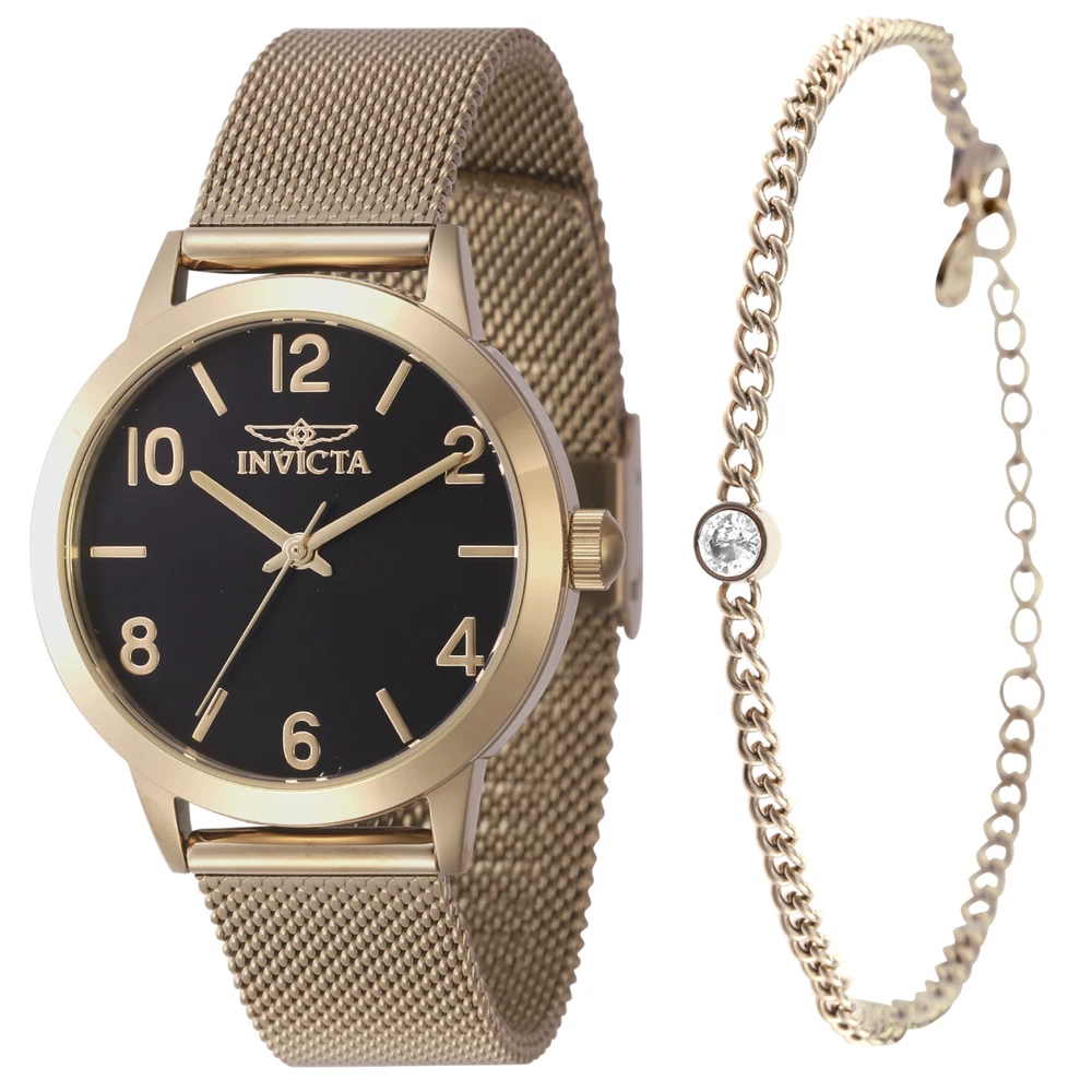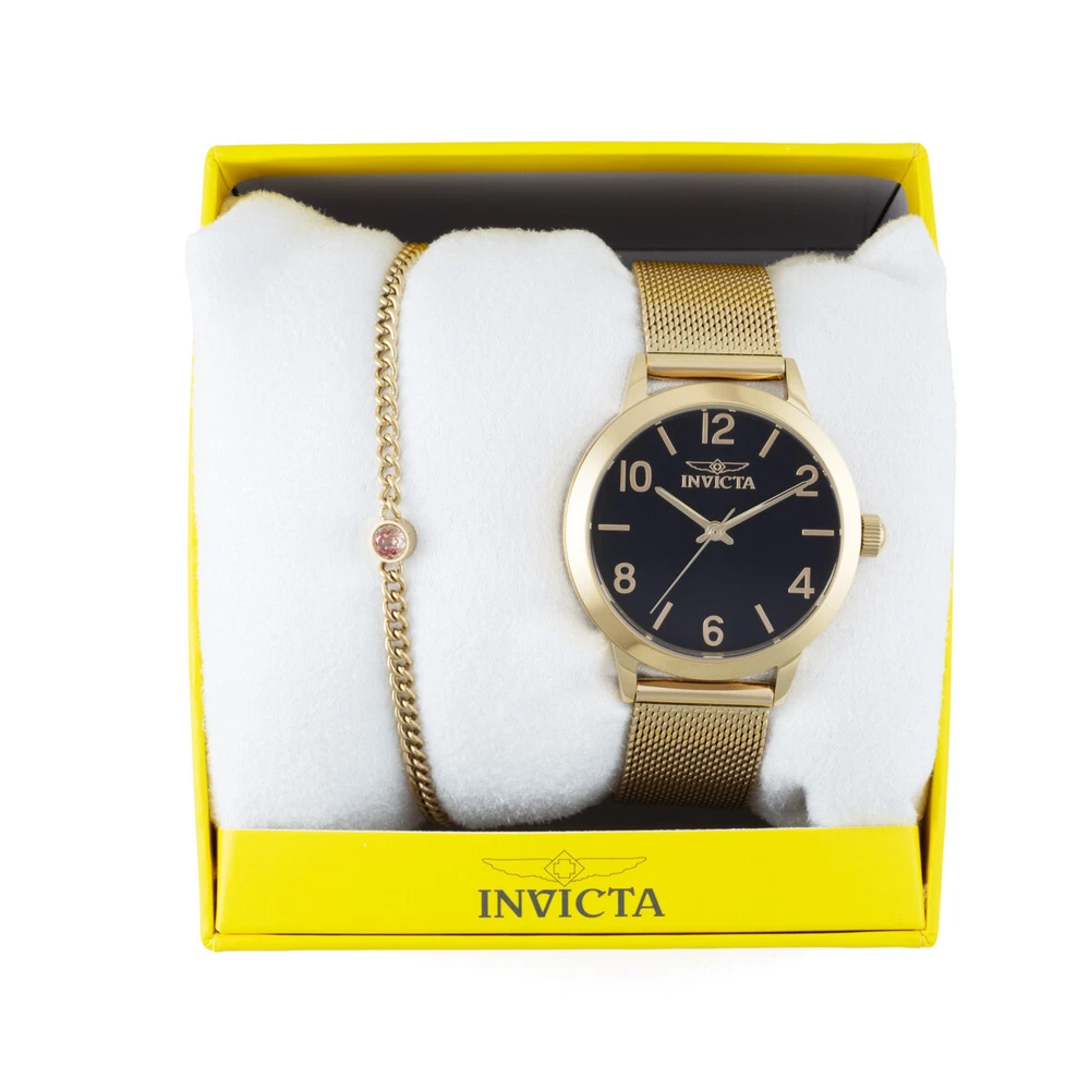 This impressive Invicta Wildflower watch features a precise Quartz movement as well as a gold case. Its black, brass dial is enclosed by a highly protective Mineral Crystal. This watch is finished by a strong gold, band, and it offers 30 m water resistance. A summon to all stunning sirens. Ever true to the very essence of the source for inspiration, the Invicta Wildflower collection is most deserving of female attention. Capturing the contradictions of its muse, the timepieces of Wildflower are flawlessly integrated representations of elegance and strength. Realized with features including diamonds, gemstones, mother of pearl, textured or pave dials, and Swiss movements, Invicta has embraced the paradox and has found the brilliance in the bloom. Year: 2023 Collection: Wildflower Series: - Product Family Code: PF21024 Limited Edition Threshold: - Band Material: Stainless Steel Band Tone: Gold Band Size [mm]: 16 Band Length [mm]: 190 Interchangeable: No Bezel Color: None Bezel Material: None Buckle Type: Buckle Case Material: Stainless Steel Case Tone: Gold Case Size [mm]: 34 Crown Type: Push Crystal: Mineral Dial Material: Brass Dial Color: Black Function Type: Quartz Chronograph Function: None Gender: Lady Luminous Material: None Luminous Color: None Movement Caliber: PC21J Movement Components: Japan Movement Jewels: - Movement Origin: Japan Movement Vendor: TMI Swiss Made: - Diamonds TCW: 0 Case Thickness: 8.00 UPC Code: 886678626779 Water Resistance [m]: 30 Weight: 60 TERMS OF SALE: - Payment Is Expected Immediately. An Unpaid Item Case Will Be Opened After 48 Hours of Non-Payment. - All Items Usually Ship Within 1 Day of Cleared Payment Monday-Friday. All Orders That Come in Over the Weekend Won't Ship Until Monday Unless There's a Holiday. - Double Check Your Shipping Address Before Finalizing Purchase. We Ship to the Address Provided By eBay, Made Sure Yours Is Up to Date. - Your Tracking Number Will Be Uploaded on Ebay Once We Print Label for Your Order. - Buyers Can Use "ask seller a question" For Questions and We Will Respond Promptly. OUR RETURN POLICY: - Returns Are Accepted Within 14 Days After the Delivery Date. - Returned Item Must Be in Its Original Condition Including Box Packaging & All Accessories (protective plastics intact, tags and documents, boxes, and accessories unused and undamaged). - Refund Is for Exchange When Available or Full Refund Less the Shipping Charges Paid to Shipping Company for Delivery to Your Location. - Refused Shipments or Returns Due to Buyer's Remorse Would Incur a Restocking Fee Of 15% Of the Item. Addresses Entered Incorrectly and Customers Not Available for Delivery Are Included as Refused Shipments. - Items Returned in Any Condition Other Than as Shipped Out May Add to the Restocking Fee Up to 50% Or Cause the Item to Be Refused and Shipped Back with No Refund Applied at Buyer's Expense
