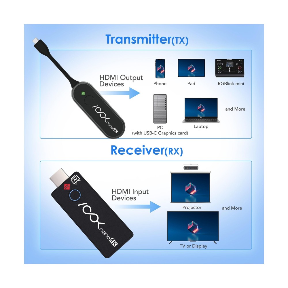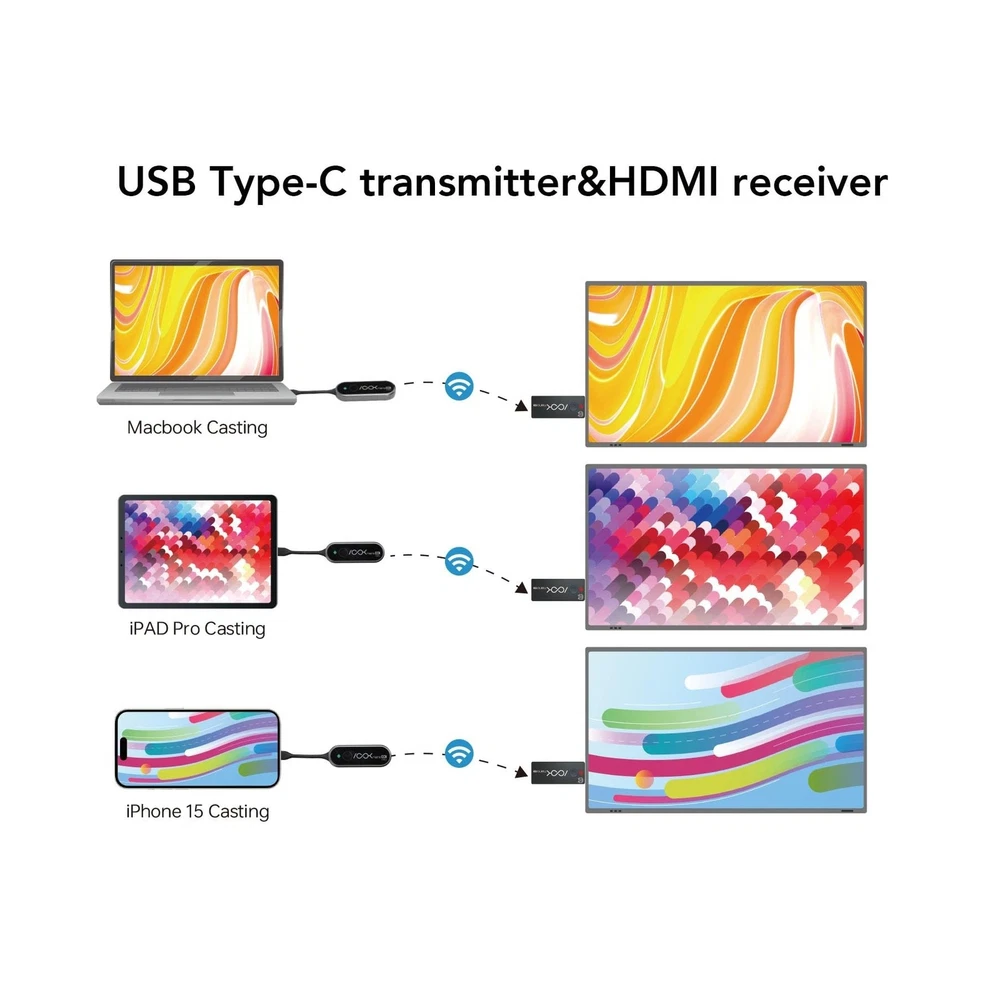 Wireless USB Transmitter and Receiver, 4K Wireless HDMI Sender, 131FT, Wireless USB-C to HDMI Transmitter and Receiver 4K, Plug &Play, Videos,Files Streaming from iPhone 15/Tablet/Laptop to TV Product Details Brand: RGBlink Connectivity Technology: Wireless, USB-C for iPhone/Tablet/Laptop Controller Type: Remote Control Special Feature: Low Latency, Compact Design Compatible Devices: iPhone, Personal Computer, RGBlink mini series- mini ,mini pro,mini mx,mini edge, Tablet, Smartphone Manufacturer: Xiamen RGBlink Science & Technology Co.,Ltd Package Dimensions: 8.67 x 4.73 x 1.6 inches Item Weight: 10.6 ounces Item model number: ASK nano UHD Date First Available: June 4, 2024 Manufacturer: Xiamen RGBlink Science & Technology Co.,Ltd SCREEN MIRROR iPhone 15(and above/IPad pro2021(and above)- RGBlink upgraded USB Type-C wireless transmitter and HDMI receiver supports effortlessly mirror screen most type-C DisplayPort devices,include IPHONE 15, IPAD pro, Mac Book, MateBook etc, to projector/monitor/HDTV in stunning 4K resolution. Perfect for business presentations ,online education ,home theater and more,enjoy seamless streaming on a big screen anytime anywhere WIRELESS TRANSMISSION&4K UHD IMAGE QUALITY - The wireless USB transmitter and receiver do not need WiFi/APP/Bluetooth. Simply plug and play , Easy to connect ,say good to tangles HDMI cables ,make our meeting room, classroom, home tidy . Experience crystal-clear 4K visuals with vibrant colors with RGBlink Ask Nano USB-C transmitter and HDMI receiver,making every viewing experience on a big screen truly immersive. ADVANCED 5G CHIP - The 4K wireless USB-C to HDMI transmitter and receiver with dual band chip , ideal for supporting stable and long range transmission up to about 131 ft ,without the hassle of messy cables . With ultra-love latency of 0.01s ,this wireless HDMI can stream video smoothly. ( Note : wireless transmission distance may vary based on obstacles like walls) COMPACT, FLEXIBLE DISPLAY OPTIONS - Take your entertainment on the go with the portable RGBlink USB type-c transmitter and HDMI receiver . Whether RGBlink Ask Nano USB-C wirless transmitter is for home theater ,outdoor movie nights, corporate meetings ,online teaching or wedding vlogs ,this wireless HDMI offers plug and play convenience. Choose between mirror or extend mode to suit your needs, whether it's duplicating your screen or expanding your desktop for enhanced productivity. WIRELESS TRANSMITTER 4K& USING TIPS - Stay connected with RGBlink Ask Nano wireless HDMI transmitter . Check singal strength conveniently with wireless HDMI transmitter . Packing List: Wireless USB Type-C Transmitter *1, Wireless HDMI receiver*1, user manual, type-c charging cables*1. 2-year warranty and life-time technical support. AirPlay and Miracast - The wireless HDMI receiver itself can offer AirPlay and Mircast connection for IOS and Andriod device and mirror screen them to big display without the USB Type-C transmitter. Transmit 2160p Video and Audio to TV or Projector from Laptop, PC, DVD Player, Cable Box (recommended distance within 15m/45ft ) Payment Back to Top We accept Paypal and All Major Credit Cards. Shipping & Handling Back to Top Item will be shipped FREE standard shipping in 1 business day after payment is received. Express Shipping services are available. Tracking number will be provided. Return Policy Back to Top Items can be returned for exchange or full refund within 30 days from the date you receive your merchandise. Please contact us before starting a return request, so we can resolve any issues and provide free returns if needed. Return shipping is the responsibility of buyer unless the return is a result of our mistake (i.e., your receive the wrong item). Contact Us Back to Top If you have any questions please contact us. We will respond within 1 business day or less.