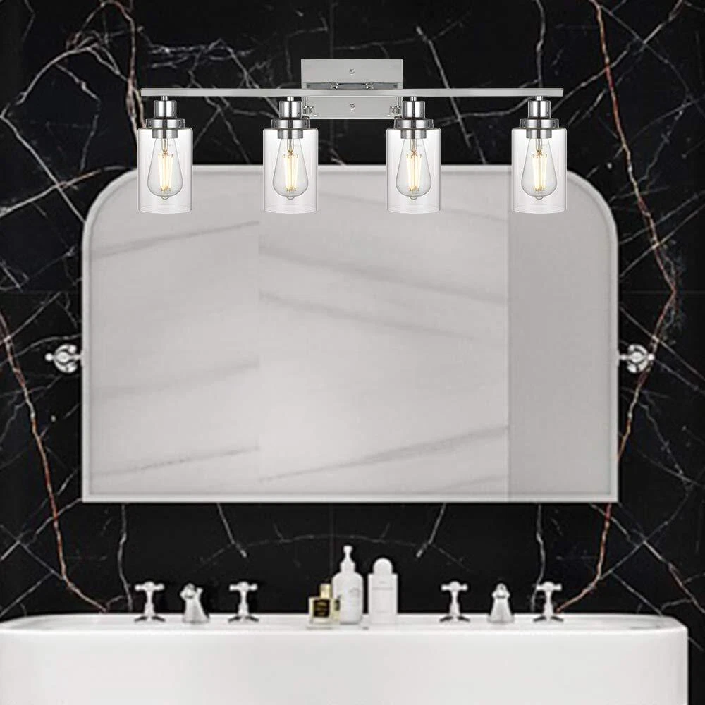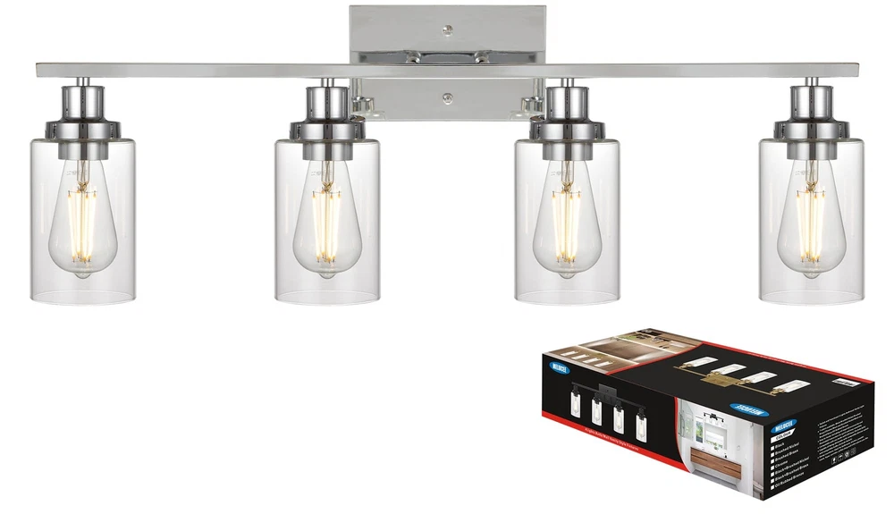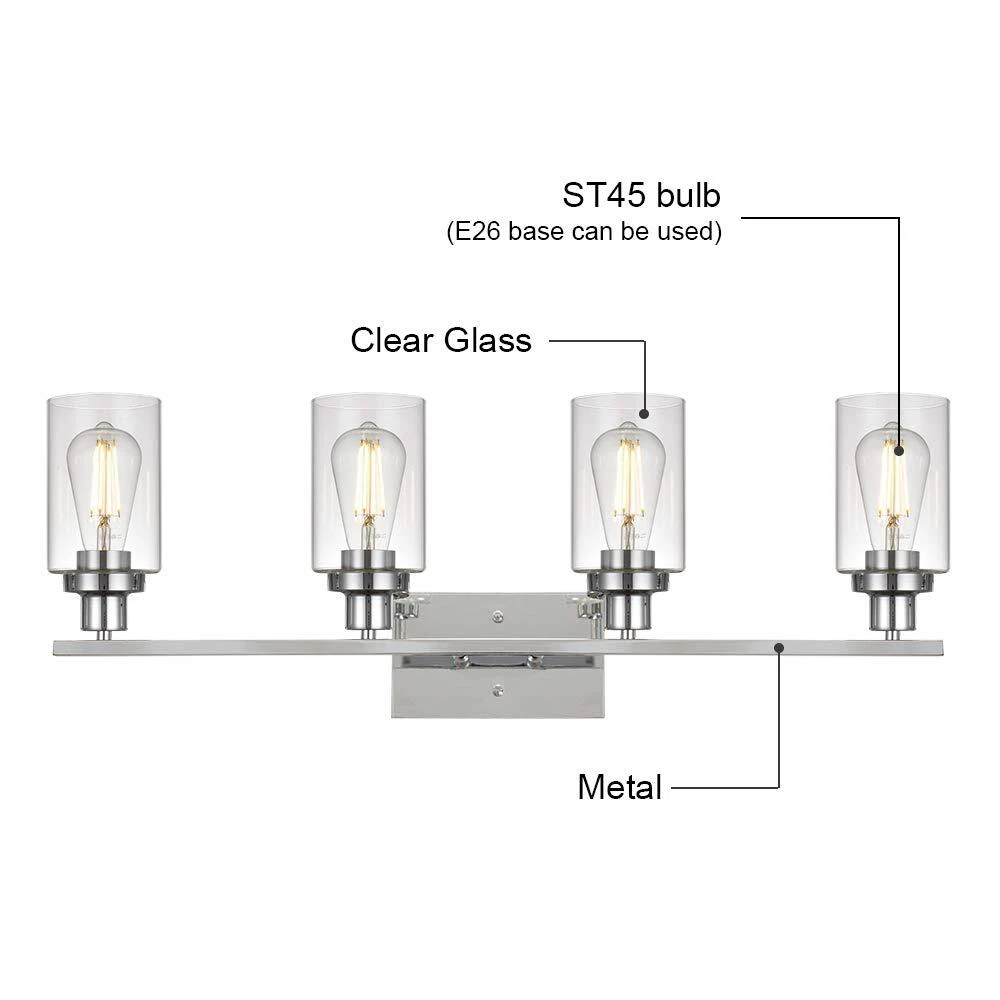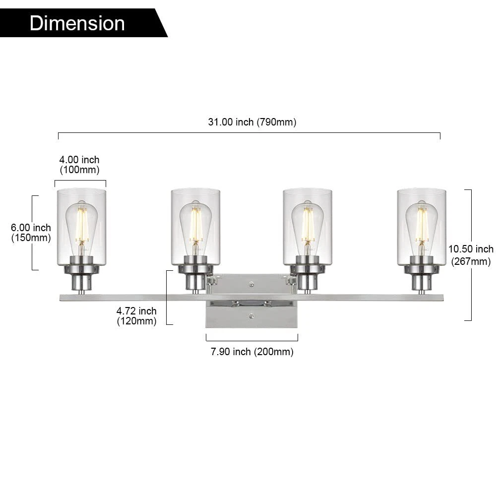 Unique Design: This wall sconce ideal for striking a balance between strength and elegant beauty. Encased in attractive clear glass cylinder maximizes light output for an optimally bright ambience. The wall mount light design allows for this sconce to be installed in an upwards or downwards position Easy Installation: All mounting hardware required for installation are included in the package. Just need to follow the illustrated instructions provided for assembly and installation Bulb Type: Support any LED/CFL/or other less than 60W bulbs with E26 Base for this wall sconces(Bulbs NOT Included), Could be fully dimmable when used with dimmable bulbs and compatible dimmer switch Application: Ideal as a bathroom vanity light fixtures, living room sconces wall lighting, wall lights bedroom or porch light fixtures wall mount and so on, the clear glass shade sconces adds a modern decor touch Dimensions: Bathroom Light: 10.4" (H) x 31" (L), Back plate: 4.72" (H) x 7.9" (L), Clear Glass Shade: 6" (H) x 4" (Opening). The bathroom lights design allows for this sconce to be installed in an upwards or downwards position