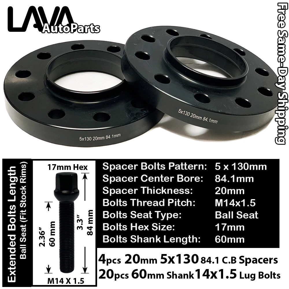 Product Specification: About Spacers Spacer Type: Hub Centric Spacer For Bolts Car Spacer Bolts Pattern: 5x130mm Spacer Center Bore: 84.1mm Spacer Thickness: 20mm Spacer Hub Ring: Yes Spacer Color: Black Spacer Material: Cold Forged 6061 T6 Grade Aluminum Quantity: 4 Pcs About Bolts Lug Type: Lug Bolts with Extended Shank Seat Type: Ball Seat Thread Pitch: M14x1.5 Hex size: 17mm Overall Height: 84mm or 3.3" Overall Diameter: 23mm or 0.9" Shank Length (From Bottom of the Seat to the end the thread shaft): 60mm or 2.36" Color: Black Material: Cold Forged Steel Quantity: 20 Pcs Requirements of the Vehicle Specification Required Vehicle Hub Bolt Pattern: 5x130mm Required Vehicle Hub Center Bore: 84.1mm Required Vehicle Hub Thread: M14x1.5 Required Vehicle Minimum Fender Gap: 20mm Requirements of the Wheel Specification Required Vehicle Wheel Bolt Pattern: 5x130mm Required Vehicle Wheel Center Bore: 84.1mm Required Vehicle Wheel Lug Seat Type: Ball Seat Required Vehicle Wheel Lug Nuts Hex: 17mm What You Will Receive: 4 pcs 20mm Hub Centric Spacers 20 pcs 17mm Hexed Black Ball Seat Lug Bolts Capability Chart and Important Part Note: Please Carefully Refer the Generation Code For Fitment, There may be multiple generations in the same year. Please Double Check For Fender Gap Limitation Make Model Year Range Part Notes Bolt Pattern Bolt Thread Special Notes Mercedes G500 1999-2020 Stock Wheel Only 5x130mm 84.1 C.B. 14x1.5 Please Check Fender Gap Limitation Mercedes G55 AMG 2003-2011 Stock Wheel Only 5x130mm 84.1 C.B. 14x1.5 Please Check Fender Gap Limitation Mercedes G550 2009-2021 Stock Wheel Only 5x130mm 84.1 C.B. 14x1.5 Please Check Fender Gap Limitation Mercedes G550 4X4 2017-2018 Stock Wheel Only 5x130mm 84.1 C.B. 14x1.5 Please Check Fender Gap Limitation Mercedes G63 AMG 2013-2021 Stock Wheel Only 5x130mm 84.1 C.B. 14x1.5 Please Check Fender Gap Limitation Mercedes G65 AMG 2014-2018 Stock Wheel Only 5x130mm 84.1 C.B. 14x1.5 Please Check Fender Gap Limitation Mercedes Sprinter 2004-2006 Stock Wheel Only 5x130mm 84.1 C.B. 14x1.5 Please Check Fender Gap Limitation Important Notice 1. Please Contact Customer Service If You Ever Have Questions 2. Capability is Guaranteed if Your Vehicle is listed in the Capability Chart Above, Please carefully refer to the seat type requirement on the wheel. 3. Exceptions Have Been Marked Under Part Notes, Please Carefully Check Generation Code 4. Fender Gap is the most important measurement to check the maximum thickness you can use Notes: Buyer must check capability chart before buying, any vehicle that is not displayed in the capability may NOT fit. Please check if your rim uses proper lug nuts seat - product is only compatible with mentioned seat type required wheels Only guarantee compatible with Ball Seat Type Required Rim, If you have Aftermarket wheel, you may need Cone Seat Lug Bolts, Aftermarket wheels fitment is based on knowledge of buyer risk If your rim has wheel cap, this set might not be compatible with Wheel Cap Please have professional specialist to perform installation, adding spacers and related modification at your own risks Return Policy: Your happiness with the product is our top concern. We allow returns based on the following rules: Return is allowed within 30-day of Purchase Date; Return Product must be unused, intact, and with the original package; Buyer is responsible for return shipping; Please allow 3 business day after the delivery of your return for us to process the refund. Please notify customer service prior starting a return to avoid the 10% RMA Restocking Fee. Please use a specific return shipping address (not the ship-from address) to avoid the 30% Processing Fee. If you have any questions or concerns, please do not hesitate to let us know. Shipping: All shipments will be shipped via USPS Priority Mail (Same-Day); Order placed before 9:00 am PST will be shipped on the same day. Order placed after 9:00am will be shipped promptly the next business day. If you wish to cancel or modify order, please notify Customer Service before 8:00 am PST or we won't be able to change/cancel your order prior to shipping. We also provide local pickup service! Contact us for more information. Warranty: 30-Day Return Policy; For Colored Lug Nuts (Any color other than Chrome), we suggest the use of manual torque for installation to avoid damage to the paint layer. Warranty is voided if power tool is used. Disclaimer: Professional Installation is recommended. Please use proper power tools and/or manual installation torque to the specification to the vehicle's recommended torque (found on vehicle's operator manual). Our liability is limited to the purchase price of the listed product. By purchasing this product, you acknowledge that you fully understand the information and terms listed above.