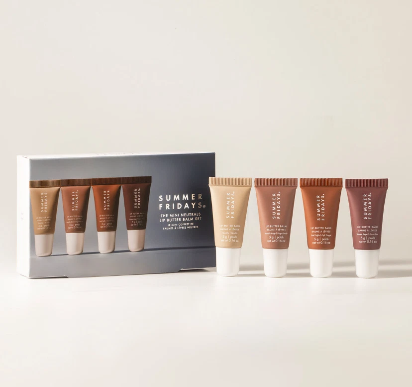 Buttery hydration in every swipe. This limited-edition holiday set features mini sizes of our award-winning Lip Butter Balm in four neutral shades. KEY INGREDIENTS -SHEA & MURUMURU SEED BUTTERS- Packed with ultra-hydrating seed butters, these natural moisturizers soothe, heal and condition parched lips. (Bye bye, dry.) -VEGAN WAXES- Our unique blend of vegan waxes will soften and boost shine all day with a smooth, never-greasy texture that feels heaven sent. The Mini Neutrals Lip Butter Balm Set Includes: • Mini Lip Butter Balm Vanilla (0.16 oz) • Mini Lip Butter Balm Vanilla Beige (0.16 oz) • Mini Lip Butter Balm Iced Coffee (0.16 oz) • Mini Lip Butter Balm Brown Sugar (0.16 oz)