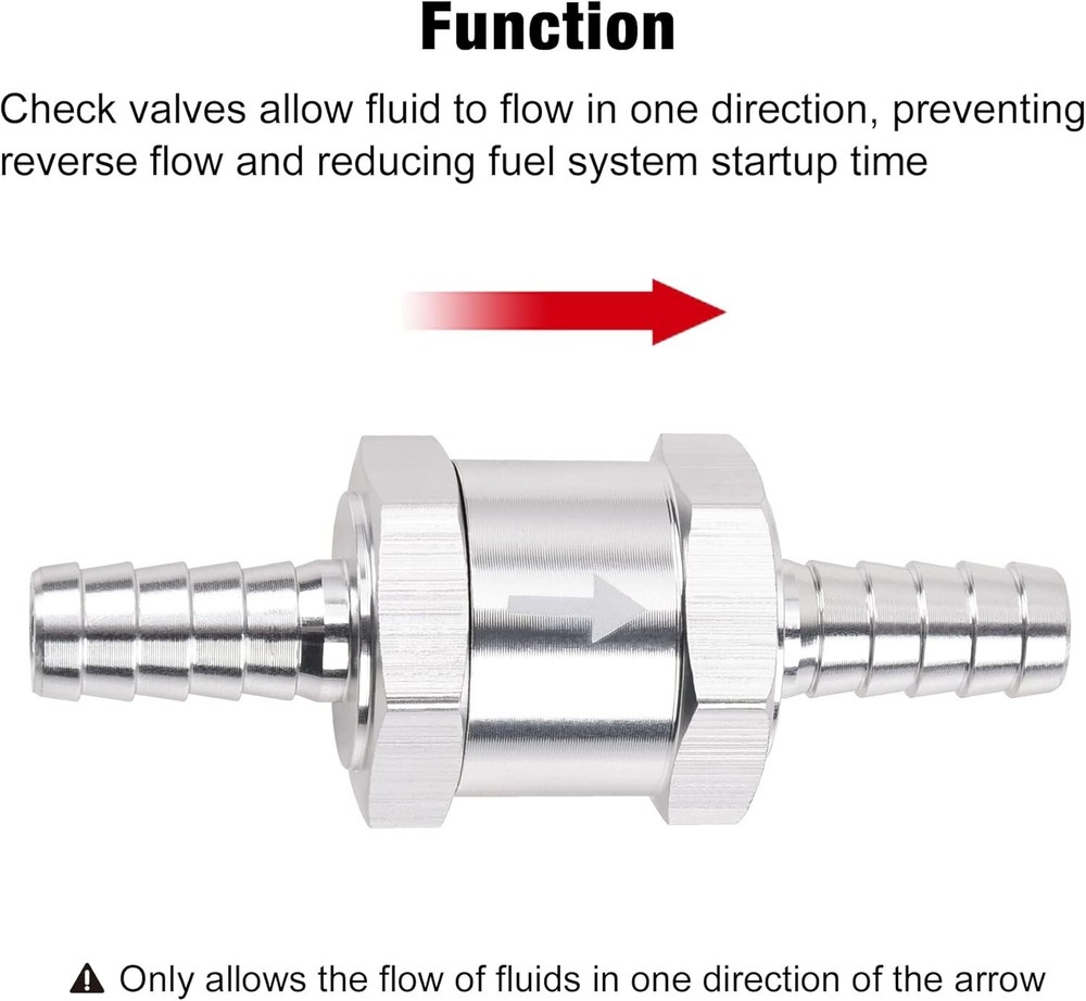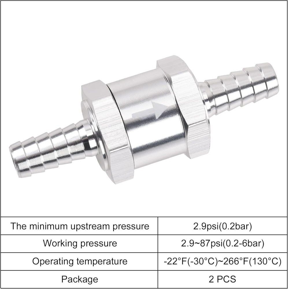 4x 10mm 3/8" Fuel Line Non-Return One Way Air Fuel Oil Check Valve Diesel Gas Description: Product Description: 100% brand new and high quality! The life of Aluminum head for using is longer than plastic heads. This product can perfectly solve the problem that your vehicle is hard or slow to start because the fuel is running back through the lines. Also great for water pressure pumps & galley pumps which are not self-priming. Professional grade non-return valve - Ideal for marine, automotive, caravans/RV, and agriculture. Stable characteristics, high reliability. Easy installation and replacement. Specification: Size: 10mm (3/8"). Material: Aluminu+NBR Rubber . Opening pressure: 0.2bar Working pressure: 0.2-6bar Operating temperature: -30 ℃-130 ℃ Color: Chrome. Function: Prevents fuel from siphoning back to the tank and holds it in the line. Fitment: For Carburettor and low pressure fuel systems. For Use With Petrol, Diesel, Bio / Vegetable oil, Paraffin / Kerosene oil, etc. Package Include: 4 x Non Return One Way Check Valve Please compare the goods appearance, shape, size with your original goods before ordering. Thank you very much.If any questions, pls do not hesitate to contact us. We will get back to you as soon as possible. Payment We accept payment via Paypal,Google Pay,VISA,Master Card,American Express,Discover,eBay Mastercard payment . Shipping All items will be shipped to buyer's eBay address. Please make sure your address in eBay matches the address you would like us to ship to before payment. Easy Return If you are unhappy with your purchase for any reason, US buyers can return it to us in an un-used condition in the original packaging within 30 days of purchase and we'll give you a refund or exchange. The refund/Exchange will not include postage/eBay costs. Please note you MUST contact us to obtain a Return Authorization Number before returning any part. Any parcel without the Return Authorization Number will be rejected. If your item is faulty or was incorrect, you must contact our sales representative before returning the parcel and we will endeavour to solve the problem effectively. Video or picture is required to show the item condition before we issue the Return Authorization Number. Important notice: 1. Any returned item(s) without Return authorization number will be rejected. 2. Please return your item(s) in original packaging and ensure that all packages are securely wrapped. 3. We will not accept responsibility for loss or damage of goods during transit, please ensure that the insurance cover option is taken where possible. Feedback We aim to maintain high standards of service and strive to achieve 100% customer satisfaction! Your feedback is very important to us, and we sincerely hope that you can contact us immediately before providing us with neutral or negative feedback, so that we can solve your problem satisfactorily.