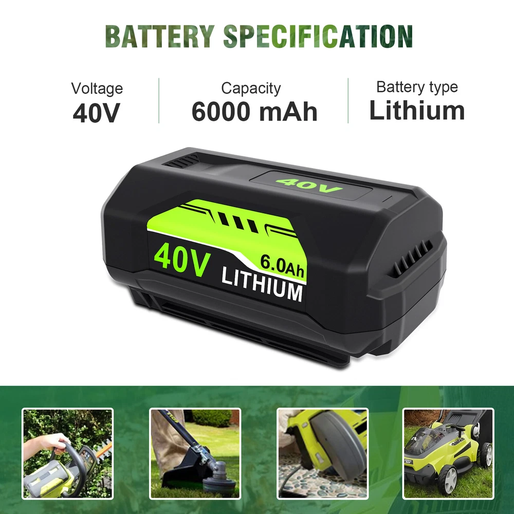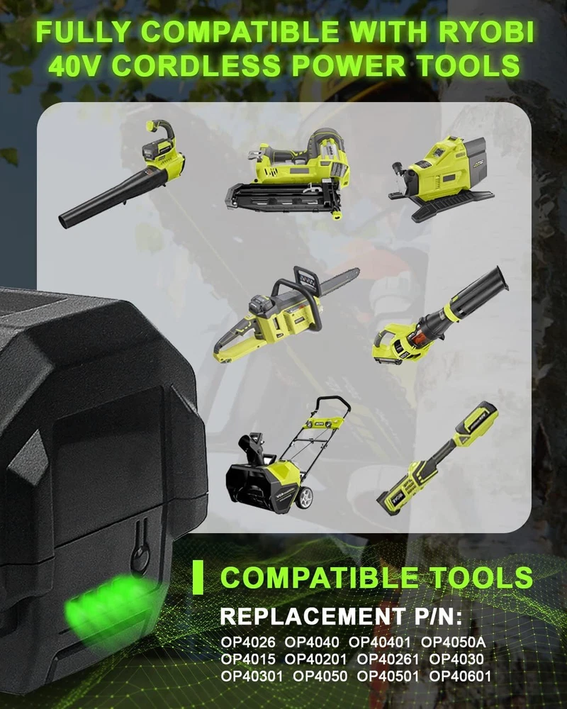 Product Description Play Video Compatible with Ryobi 40V Battery OP4050A OP4040 Replacement PN#: (Please use the “Ctrl+F” to search your model) Replacement for Ryobi OP4026 OP4050A OP4015 OP40201 OP40261 OP4030 OP40301 OP4040 OP40401 OP4050 OP40501 OP40601 OP40602 OP4060A 40 Volt Lithium-ion Battery Compatibility: Compatible with: (NOT fit for RY40503) Compatible with Ryobi Tools Model: RY40180 RY40200 RY40201A RY40202 RY40204 RY40250 RY40400 RY40402A R40402 RY40403 RY40403A RY40411 RY40430 RY40502A RY40511 RY40530 RY40460 RY40601A Cordless Power Tools Fit for Ryobi Charger Model: Compatible with Ryobi OP400 OP400A OP401 OP403 OP403A and ZROP401 40V lithium-ion battery chargers Top About this item Similar Product information Questions Reviews Product information