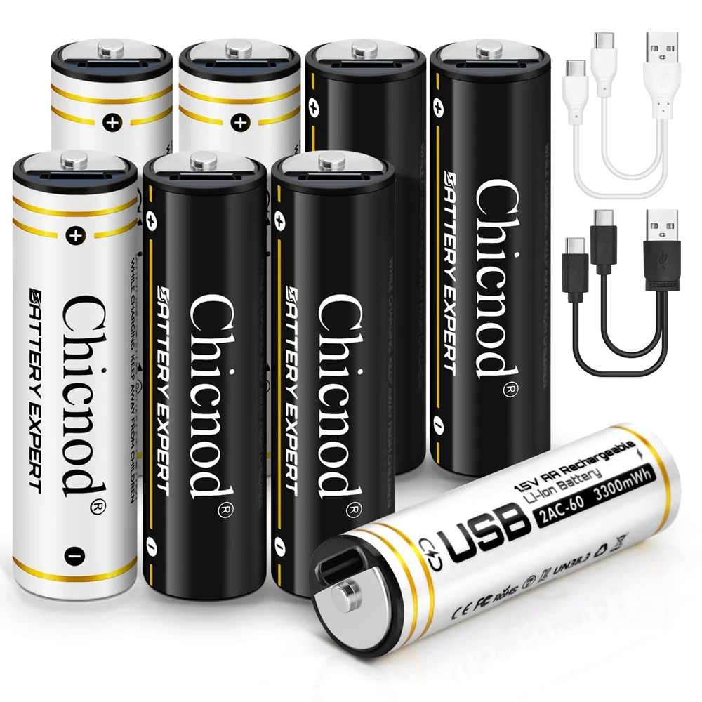 4Pack Rechargable AA Lithium Batteries, 3300mWh Double A Battery 1.5V Constant Output Lithium ion Double A Battery Long Lasting USB Fast Charging Product Details Number of Items: 4 Brand: CHICNOD MPN: 2AC-60 UPC: Does not apply EAN: Does not apply Number of Batteries: 2 A batteries required. (included) Brand: CHICNOD Battery Cell Composition: Lithium Ion Recommended Uses For Product: Toys Remote Control Flashlight, Gaming Controller Unit Count: 1.0 Count Product Dimensions: 3.94 x 3.7 x 0.79 inches Item Weight: 3.84 ounces Item model number: 2AC-60 Batteries: 2 A batteries required. (included) Date First Available: October 9, 2023 Manufacturer: Qinuo Dianzishangwu Shenzhen Youxiangongsi Country of Origin: China Lithium Batteries AA:High Capacity AA Li-ion batteries with 3300mWh Lithium ion battery,low self-discharge rate and long lasting use give you a better experience when playing electronic toys. Lithium ion battery has a better performance, it is lightweight and with a portable protective case very easy to storage. Quick Charge AA Batteries:Quick charge within 1.5hours and 2.5hours for standing charging speed. Comes with 2 usb to type c charging cord,1 black+ 1 in white. Do not need a battery charger, you can charge the batteries with any power source with USB port. Chicnod 4pack aa batteries can be fully charged within 1.5 hour for fast charging mode,2.5H by standard charging speed, comes with USB C 2 in 1 charge cable (1 Black,1 white),it not require any batteries charging adapter, it powered by USB power source like power-bank,power slot with USB bay ,DC or AC adapter or computer, laptop,easy to charge. Green led light indicates the charging is in processing ,and when it is green is fully charged. Safe Guarantee:Built-in PCB Protective Chip,to protect aa batteries from over-charge,over-discharge,over-heat and short-circuit. NOTE: DO NOT Use constantly for high current draw products, when the batteries discharge current higher than 2A it will be automatically shut off because of the over-current protection design. It is safe to use and charge. Precautions:1. Working condition:-20~60C Storage temperature:-10~25C 2. Please contact us if there anything need our help.