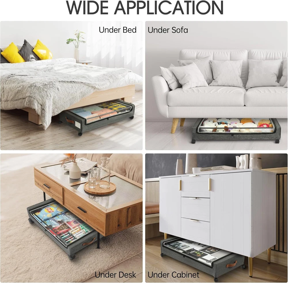 Hold Up to 66lbs: under bed storage with wheels is made of high quality 600D oxford fabric and sturdy metal frame, can hold up to 66 lbs, stronger than other fragile metal mesh, spacious capacity perfect for storing clothes, toys, books, shoes and other heavy items also won't compromise stability and durability 360°Rotating Silent Wheels: Say goodbye to constantly carrying heavy storage boxes around your house.This under bed rolling storage comes with 4 x 360°rotating wheels,two of which have locking function.When you need it to remain stationary, just press the locking mechanism gently. No matter how full the cart is, adults and children can easily slide on the floor and carpet Clear Window & Label: Our rolling underbed storage bins are equipped with a Clear window, you can clearly see the stored items, say goodbye to the trouble of misplacing items. Additionly, the included label is great for labeling contents, allowing you to quickly identify and find the item you're looking for without having to open multiple containers or boxes Versatility: Under bed shoe storage dimensions:30.71 x 16.93 x 6.69 inches (with wheels), (applicable under-bed height > 7in), large capacity exceeds your expectation to store more daily items. It can be placed under beds, sofas, tables, and closets to maximize unused space. In addition, this under bed storage drawers can be folded up when not in use, perfect for small families and college dorms that need extra storage space Easy to Install: This rolling storage bin is designed to easy installation and hassle free.Including user-friendly instruction and require minimal effort to set up, which also means you can quickly install and utilize the underbed storage space,saving valuable time and effort,ideal for bed rotting, the blind, and seniors with mobility issues