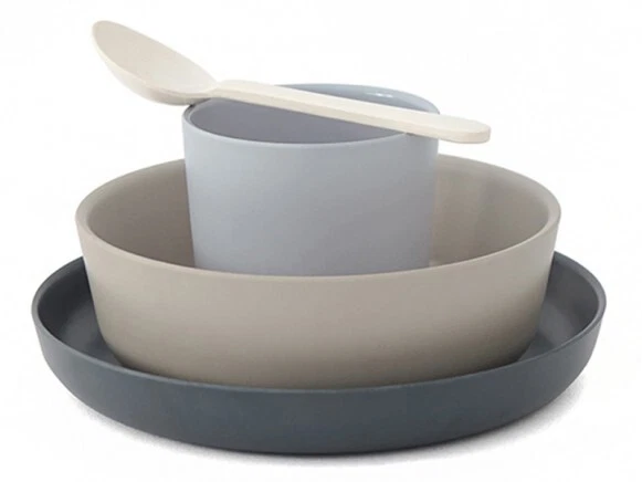 EKOBO Kids Bamboo 4-Piece Dinnerware Set, BIOBU® Eco-Material Style 71685, MIKA Kids Set Colors: Sky, Stone, Snow, White Contents: 1x Spoon 1x 8oz Cup 1x 20oz Bowl 1x 7'' Plate Dimensions: Bowl 6" x 2" | Plate 7" x 1" | Cup 3 1/8" x 3" | spoon 5 1/4" x 1 1/4" Made with bamboo and melamine Binder Top rack dishwasher safe NOT MICROWAVE SAFE Custom-designed, High-rimmed bowl and plate for less mess, Easy to hold, 100% safe, Durable, Premium design for the whole family BIOBU eco-composite: Made from renewable bamboo fibre and a food-safe resin binder, Alternative to traditional plastics, disposables and fragile ceramic, Premium quality matte finish FSC-Certified Bamboo FDA & LFGB-Certified to be free from BPA, PVC, phthalates, lead, cadmium and mercury, Dishwasher safe, Not suitable for microwave or oven, Shatter-resistant ***box may show slight damage from in-store handling