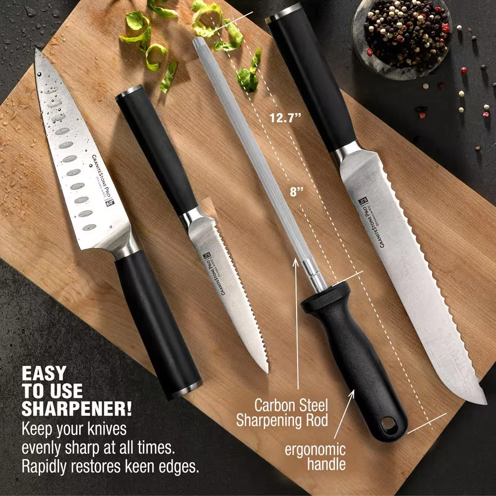 Fast Shipping On All Items 30 Days Money Guarantee Customer Support Excellent Service 100% Satisfaction Satisfaction Guaranteed 4-Piece Stainless Steel Premium Chef Knife Set With Black Handle Cookware Set Specification Blade Material Stainless Steel Cleaning Instructions Top Rack Dishwasher Safe Features Corrosion Resistant,Dishwasher Safe,Non-slip Handle Color Black Handle Material Stainless Steel Included Bread Knife,Cheese Knife,Chef's Knife,Knife Block,Paring Knife,Sharpening Steel,Steak Knife Kitchen Product Type Knife Set Knife Block Material Wood Knife Construction Stamped Knife Sharpener Compatibility Handheld Sharpeners Knife Style American Number of Pieces 14 Package Type Assorted Set Returnable 90-Day Manufacturer Warranty Limited 10 years (n/a) Item Description Ultra-sharp blades ensure precise cutting High-carbon stainless steel resists corrosion Dishwasher safe for easy cleaning GraniteStone Pro Nutriblade 14-Piece Kitchen Knife Set with Knife Block, Premium Kitchen Knives Set for Kitchen, Chef Knife Set with Block, Complete Knifes Set, Ultra Sharp Stainless-Steel Blades. GRANITESTONE PRO 14 PIECE SET- The all in one 14-piece + block set is made with Pro-grade high-Carbon Stainless-steel and feature handles of ABS material which will never splinter or corrode for ultimate comfort and durability perfect for professional or home chefs. ULTRA SHARP- The blades come extremely sharp straight from the box and are stamped from professional quality High-Carbon stainless steel, which is easy to resharpen, and corrosion resistant to power through any task. Granitestone pro 14-piece set- the all in one 14-piece plus block set is made with pro-grade high-carbon stainless-steel and feature handles of ABS material which will never splinter or corrode for ultimate comfort and durability perfect for professional or home chefs Ultra sharp- the blades come extremely sharp straight from the box and are stamped from professional quality high-carbon stainless steel, which is easy to resharpen, and corrosion resistant to power through any task Complete set- this set includes 1 chef knife, 1 serrated bread knife, 1 slicing hollow knife with non-stick notches, 1 cheese knife with non-stick notches, 1 paring knife, 1 utility knife, 6 steak knives, 1 kitchen shears, and 1 knife sharpener Durable and strong- stamped from rust proof and tarnish resistant high-carbon steel this complete set is strong enough to tackle all your kitchen tasks and will last a lifetime Dishwasher safe- these knives are dishwasher safe for effortless clean and care. simply throw them in the dishwasher after use About us We offer the best prices around on high quality products. Our E-store includes media such as books, movies, music and games while offering electronics, toys, sporting apparel, clothing, tools, general home, garden items and more. Shipping We are always working hard to ensure your package arrives as soon as possible. Please understand that some factors like weather, high postal traffic, and the performance of shipping companies are outside of our control. We offer free shipping to the lower 48 states and ship within 2-3 business days of payment, usually sooner. We do not accept P.O. Boxes. Please provide a physical address. For shipping outside of the continental USA, we only use eBay's Global Shipping Program.The item is shipped to KY and then sent to the rest of the world. International customers are responsible for all duties and taxes. Continue to check out to calculate costs for shipping the item to your country. Messages regarding eBay's Global Shipping Program MUST be directed at eBay EXCLUSIVELY. Returns We offer a 30-Day Return Policy on items in which you are not completely satisfied with. You have the option of a full-refund or an exchange of the item. No returns are available on items shipped outside of the USA Satisfaction We try over very best to make sure every customer is completely satisfied. If there's a problem, message us! We're happy to help. Payment Options Shop With Confidence