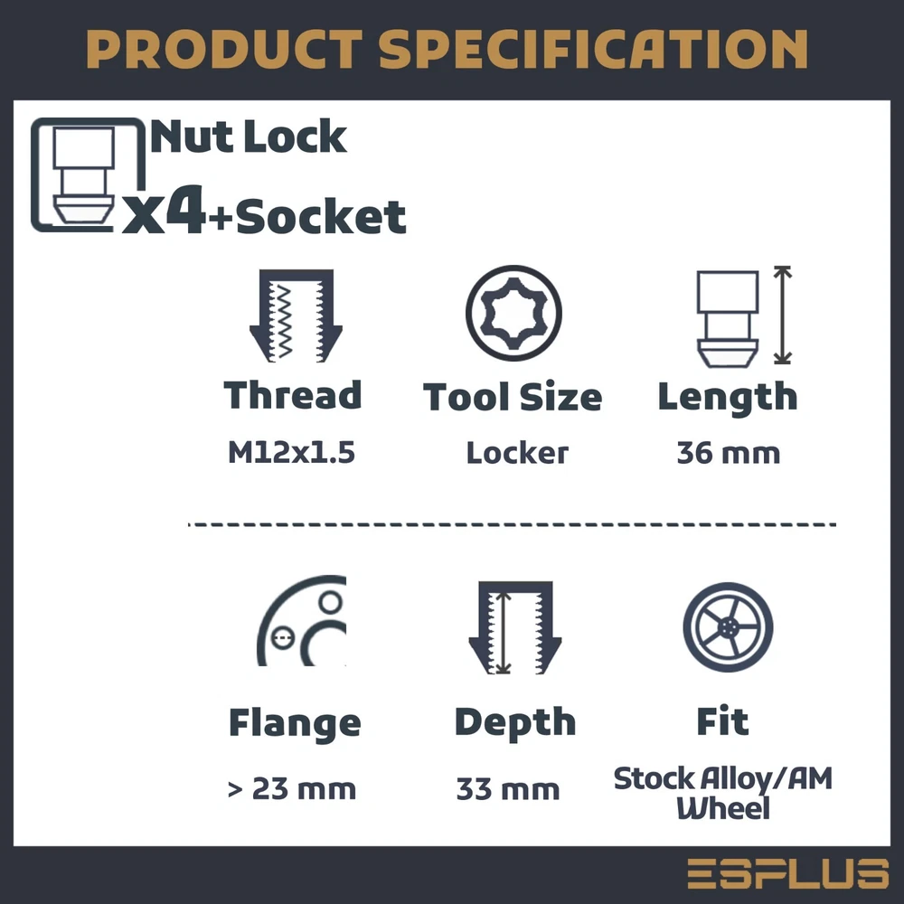 Store Home | Hot Products | Hot Deals | Suscribe for More | Customer Feedbacks | Contact us Categories Universal Lug Nuts OEM Lug Nuts Wheel Locks Conical Seat Lug Bolts Ball Seat Lug Bolts Hub Centric Spacers 4 Lug Wheel Adapters 5 Lug Wheel Adapters 6 Lug Wheel Adapters 8 Lug Wheel Adapters Studs Conversional Adapter 5 Lug HubCentric Adapter 6 Lug HubCentric Adapter Universal Wheel Spacers M12x1.5 Bulge Acorn Wheel Lock / Conical Seat 60 Degree / 0.9" Flange / 1.4" Tall Specifications Quantity: Set of 4 Lug Nut + Socket Thread Pitch: 12x1.5 Lug Nut Height: 1.4" (36 mm) Lug Nuts Flange: 0.9" (23mm) Seat : 60 Degree Conical Seat Material: 10.9 Grade SCM Heat Treated Steel Color and Finish: Chrome Drive: Wheel Lock Tool Requirement: 3/4" (19mm) Hex Socket Package 4 Pcs Lock + 1 Pc Socket Important Notice For stock wheel users, we suggest to use shape of existing lug nuts' Flange , Seat Type , and Height as refernce before buying. Compatibility chart from Ebay is only designated for Thread Pitch check. The actual fitment varies based on the requirements of wheels. Lug nuts/bolts seat has to strictly follow the wheel condition. If you are not sure, please do not hesitate to ask customer service. Our Return Policy If ever you’re not satisfied with your purchase, we offer 30-day return. Returned product must be intact and unused as the same condition of the original shape and package. Upon return, please contact the customer service for Return Merchandise Authorization (RMA) number prior to returning. A 25% restocking fee will be charged for all non-defective products. All refunds will be credited back to the original payment method. About US We strike to provide high quality auto parts. Your satisfaction is our first priority. Should you have any questions, please do not hesitate to contact our customer service for help. Limitation of Liability In no event shall our liability exceed the value of the product(s) sold. In no event shall our company be liable for any direct, indirect, punitive, incidental, special or consequential damages whatsoever arising out of or connected with the use or misuse of any of its products. Fitment Following chart is designated for Thread Pitch check only. Due to aging, your studs may have been changed. Please compare the shape and thread mark with your existing lug nut before buying. Q & A How do I know If this product will fit my car? 1. Use compatibility chart to check Make/Model/Year 2. Check wheel studs are factory default 3. Check wheel studs are less than 1.4” Long 4. Check wheel lug mating surface is cone shape 5. Check wheel lug hole flange requirement is 0.9” *You can also use existing lug nuts thread/shape as reference Why is the product bottomed out without seat firmly? Your studs are too long to penetrate the max length allowance for the lug nuts Solution: 1. You need longer and deeper lug nuts 2. You need to trim the studs and make it shorter Why is the product too thin that won’t hold my wheel? Your wheel requires large flange lug nuts to hold, for ideal flange size, please refer to your existing lug nuts Solution: 1. You need large flange lug nuts 2. You need to use lug nuts flange adapter to make it fit Why does the product not fit my wheel cap? Most of the wheel caps have clipers that require lug nuts to hold,our lug nuts may not have the same shape to match the clippers Solution: 1. You need to purchase the exactly same lug nuts from the caps 2. You need to remove your wheel caps Why is the thread not matching my wheel studs, but my car is listed in the compatibility chart? Wheel Studs are subjected to be replaced due to aging or repair, after that, you may have different thread than factory default Solution: 1. Check the thread from your existing lug nuts 2. The thread mark is ususally engraved on the side of lug nuts Why does my lug nuts have different mating seat type than the product I purchased? Seat type of mating surface is based on the wheels, different wheels have different mating surface requirements. Some stock wheels may require special mating surface assembling. Solution: 1. Check the matting surface from your existing lug nuts and that from your wheels 2. Alloy stock wheels, steel stock wheels, and aftermarket wheels have different mating specification What is the cut-off time for same day shipping? Cut-off time for shipping is 9:30 am PST every business day excluding weekends and ferderal holidays, The shipping date for weekends and federal holidays moves to next available week days How do I get expeditate shipping for timely purposes? Expeditate shipping is based on delivering address, in rear cases, carrier may experience delay due to operational difficulties. Solution: Contact customer service before placing expediate orders Not receiving my package but tracking says delivered Package may be lost, missent, placed in porch or mail box Solution: 1. Check if shipping address on file is up to date 2. Check surroudings including porch, mail box, door steps etc. 3. File item not receive case to ebay, carrier, customer service How does international order shipping work via eBay Global Shipping Program, and how do I check status? ebay Global Shipping Program (GSP) is eBay hosted international carrier who processes international orders, sellers send product to domestic GSP center for further international transition. Solution: 1. Check with ebay GSP department directly by calling them 2. Check package tracking information tab, there are two parts of shipping, one from seller to GSP center, the other for GSP center to destination How do I change address, cancel, or modify my order after I replaced my order? All the changes and mofications must be requested before shipping via direct on-site messages, once the package tracking is given, you will not be able to make any changes Solution: Contact customer service via on-site messages, not buyer notes How do I handle wrong item sent, missing piecies, defective item, and arrival dama